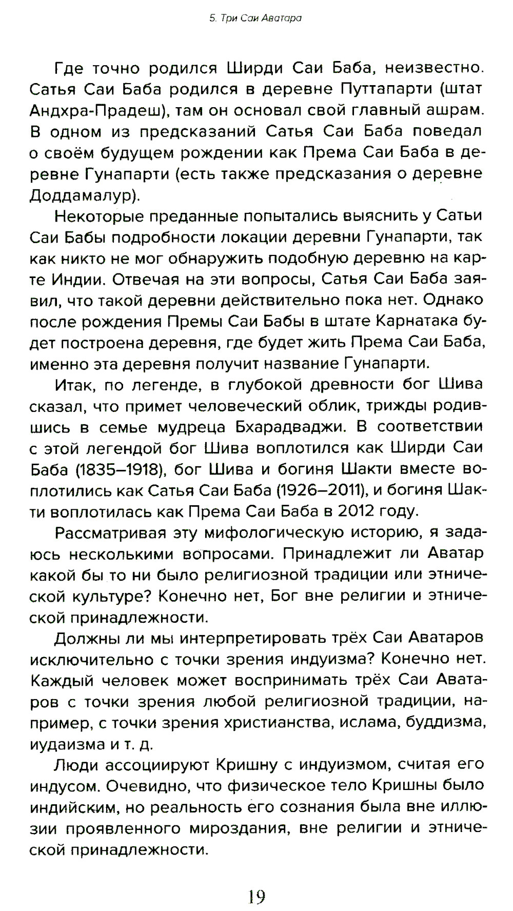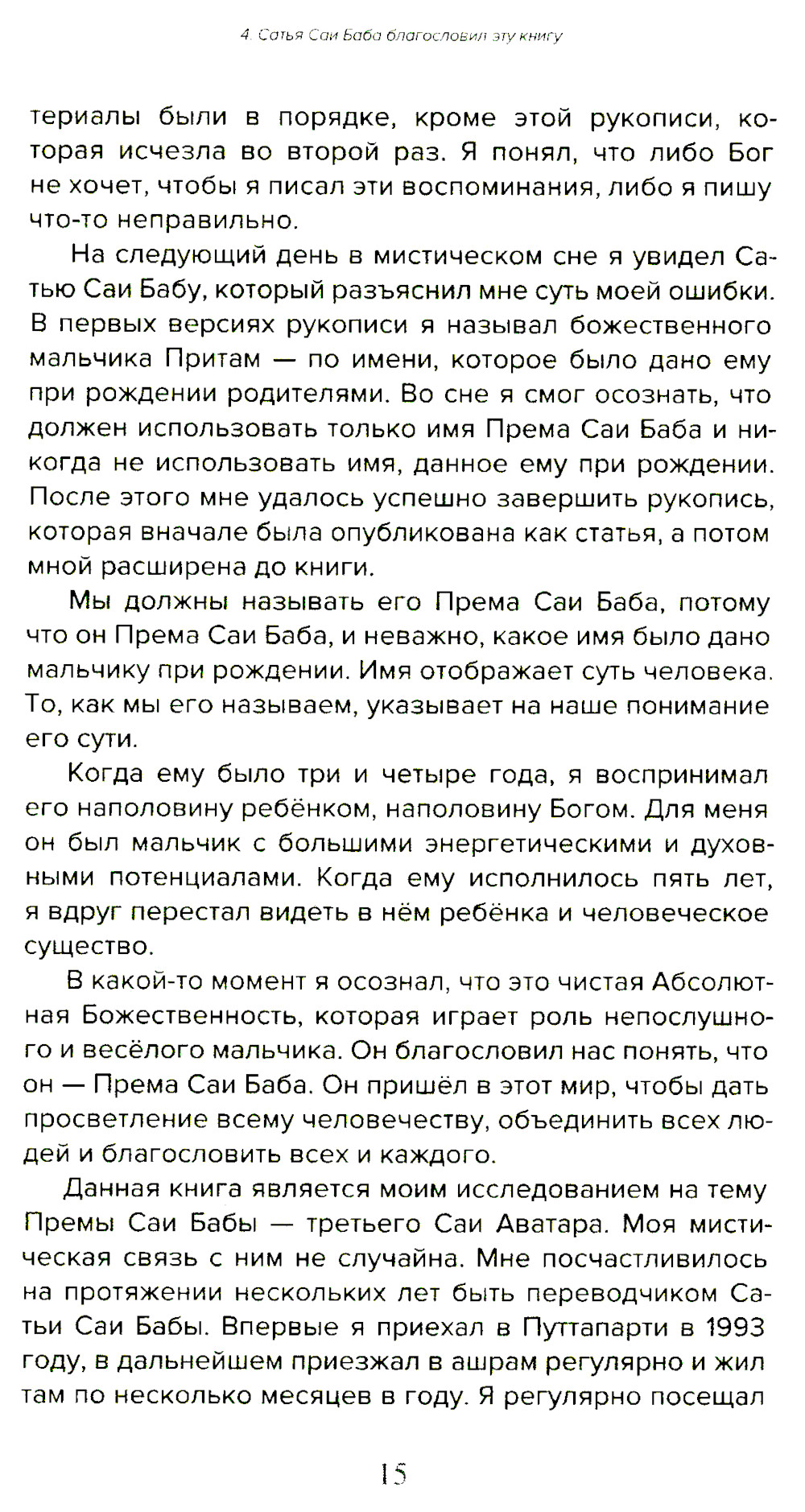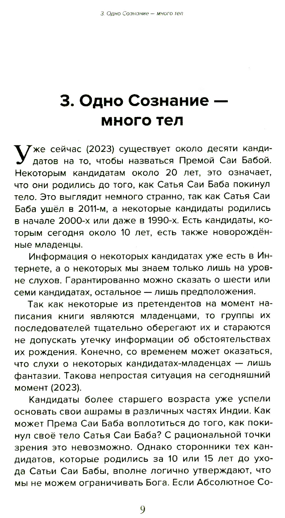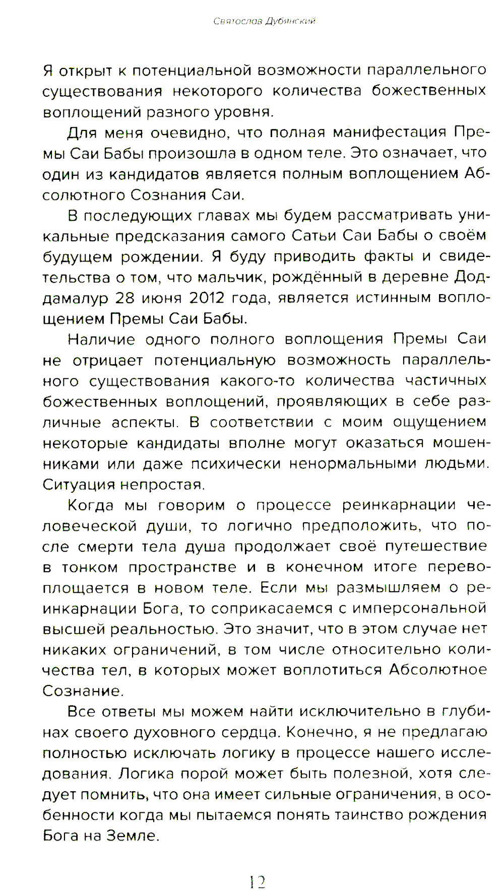 Эта книга посвящена Преме Саи Бабе, божественному воплощению XXI века. Према Саи Баба является третьим воплощением Бога на Земле в нашу эпоху. Первым был Ширди Саи Баба (1835-1918), вторым - Сатья Саи Баба (1926-2011). В самом начале я должен признать всю сложность написания этой книги именно в данный момент. Сейчас 2023 год, предыдущее воплощение Бога, Сатья Саи Баба, покинул физическое тело в 2011 году, то есть 12 лет тому назад. Према Саи Баба родился 28 июня 2012 года, на момент написания этой книги Преме Саи 11 лет. Первый раз я встретился с божественным ребёнком, когда ему было три года. Я посещаю его дом на протяжении восьми лет, наблюдая за каждым днём его детства, ростом и становлением.| Издательство | Книга |