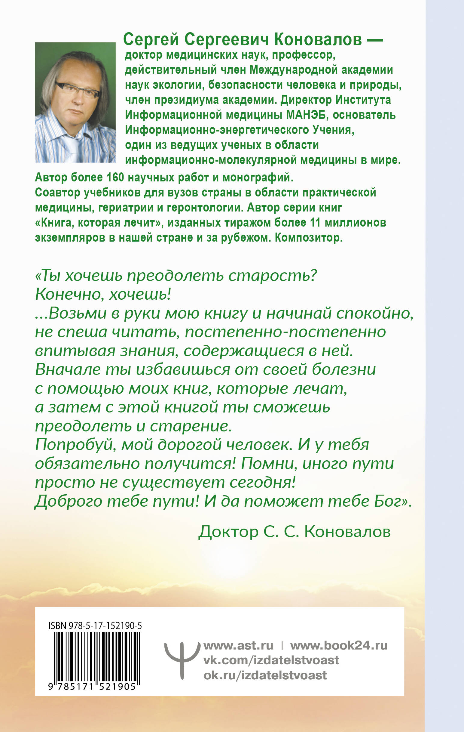 • Эта книга всемирно известного врача и ученого, доктора медицинских наук, профессора Сергея Сергеевича Коновалова посвящена возрастным изменениям в организме человека, их природе, особенностям и возможности их преодоления. • Книга содержит новые сведения о причинах старения организма с точки зрения Информационно-энергетического Учения с учетом последних открытий в области Информационной медицины, а также советы людям зрелого возраста по организации здорового образа жизни. • Книга Доктора будет полезна не только людям пожилого возраста, но и каждому, кто хочет жить долго и счастливо, без боли и страданий, расширяя свои знания о мире и постигая законы Информационной Вселенной. Кому будет полезна книга? 1. Тем, кто болен или входит в преклонный возраст, - Сергей Коновалов помог уже сотням тысяч неизлечимых больных. Автор откроет и вам Путь к здоровью. 2. Тем, кто не хочет болеть и стареть, хочет понять причины своих болезней и ищет способы исцеления души и тела. 3. Тем, кто интересуется Информационно-энергетическим Учением, ищет знания об устройстве человека, Мира и Вселенной. 4. Тем, кто страдает от "возрастных" заболеваний, хочет вылечиться сам и помочь своим родным и близким быть здоровыми, жить насыщенной, активной и интересной жизнью. 5. Заочным пациентам-студентам Доктора - книга содержит рекомендации по профилактике старения и развития множества заболеваний.| Издательство | ИЗДАТЕЛЬСТВО "АСТ" |