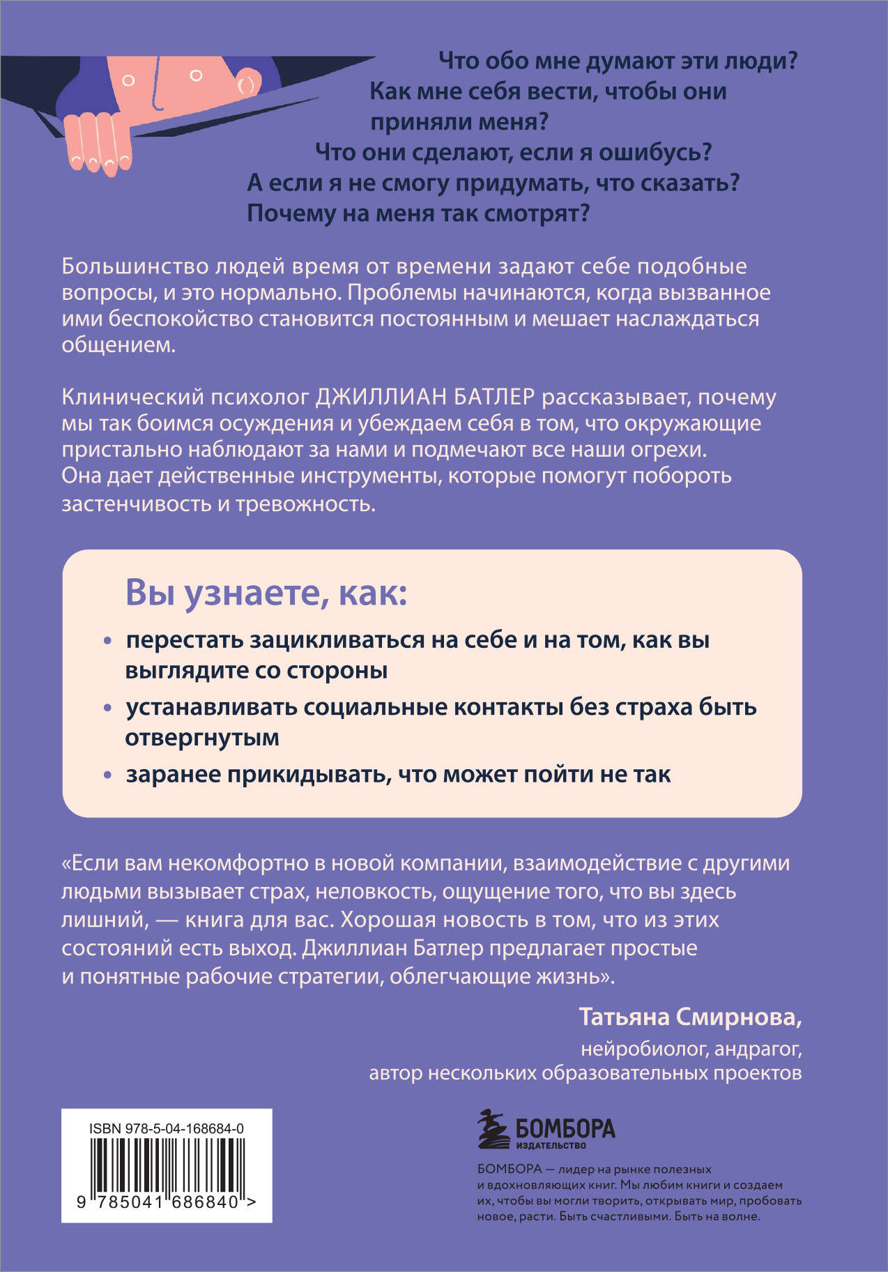 Дополненное издание классического курса по самопомощи 1999 года! Большинство людей время от времени переживают о том, как они выглядят со стороны, что о них думают окружающие, - и это нормально. Проблемы начинаются, когда беспокойство становится постоянным и мешает устанавливать социальные связи и наслаждаться общением. В этой книге клинический психолог Джиллиан Батлер рассказывает, почему мы так боимся осуждения и убеждаем себя в том, что другие люди пристально наблюдают за нами и подмечают все наши огрехи, и дает действенные инструменты, которые помогут побороть застенчивость и тревожность. ВЫ УЗНАЕТЕ, КАК: - научиться не зацикливаться на себе и на том, как вы выглядите со стороны; - устанавливать социальные контакты без страха быть отвергнутым; - перестать заранее прикидывать, что может пойти не так.