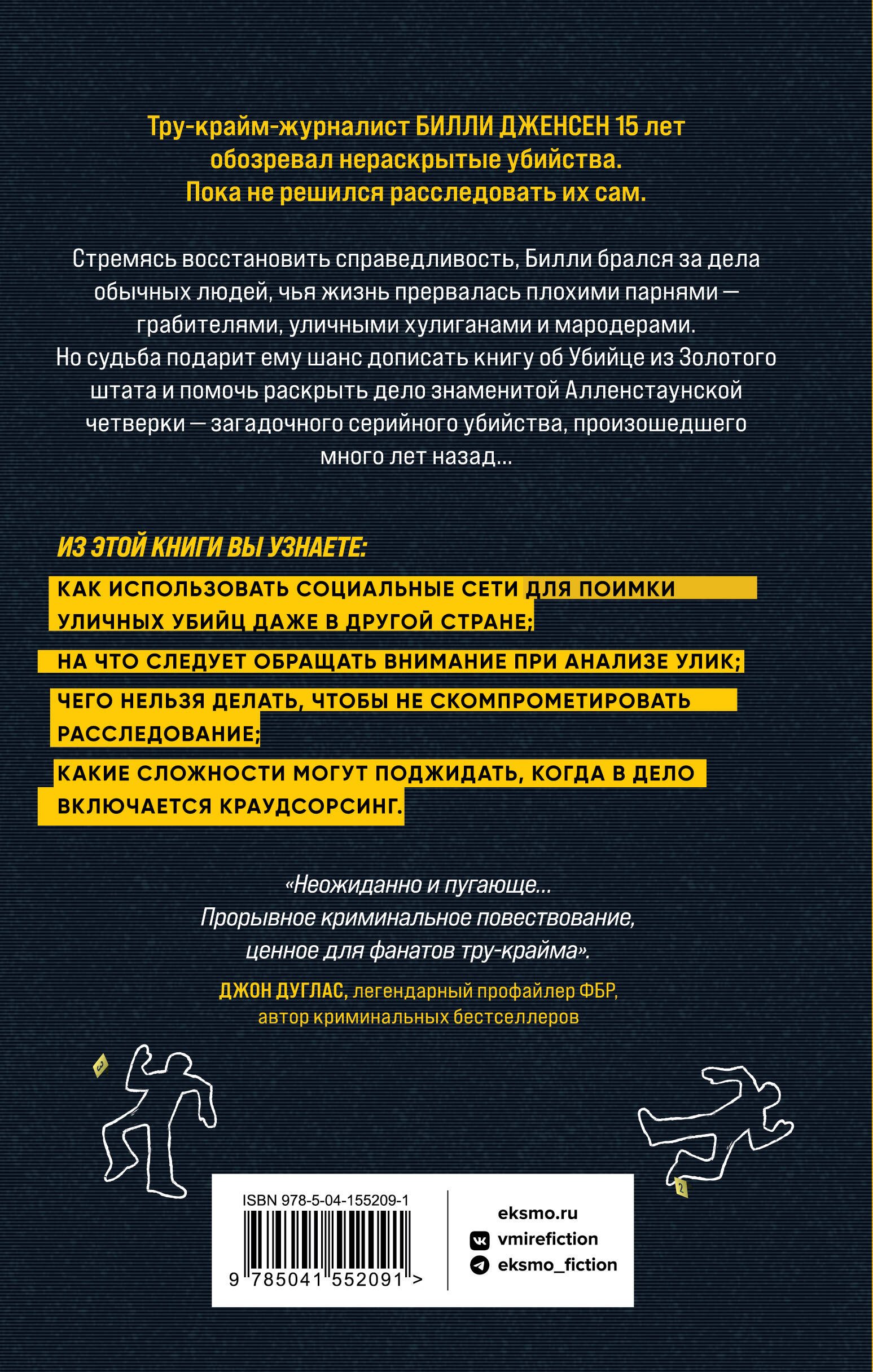 ПРАКТИЧЕСКОЕ РУКОВОДСТВО О ТОМ, КАК РАСКРЫВАТЬ УБИЙСТВА В ЭПОХУ ИНТЕРНЕТА - ОТ ТРУ-КРАЙМ ЖУРНАЛИСТА И ГРАЖДАНСКОГО СЫЩИКА БИЛЛИ ДЖЕНСЕНА. Вы когда-нибудь хотели раскрыть убийство: собрать улики, которые проглядела полиция, опознать подозреваемого? Тру-крайм-журналист Билли Дженсен провел пятнадцать лет, обозревая нераскрытые убийства. Все истории, которые он написал, имели одну общую черту - у них не было конца: убийца все еще был на свободе. Но однажды чаша терпения переполнилась, и он придумал план. План расследования после того, как копы сдались. Используя социальные сети и краудсорсинг, Билли создал эффективную систему поиска преступников - и разработал систему правил, чего делать не стоит, чтобы не скомпрометировать себя и расследование. Стремясь восстановить справедливость и подарить утешение родственникам погибших, он брался за дела обычных людей, чья жизнь прервалась плохими парнями - грабителями, уличными хулиганами и мародерами, - случайно встретившимися у них на пути. Но судьба подарит ему шанс дописать книгу об Убийце из Золотого Штата и поучаствовать в деле знаменитой Алленстаунской четверки - загадочного серийного убийства, произошедшего много лет назад… Захватывающая и необычная, книга «Преследуя тьму» - это книга о подлинной страсти к своему ремеслу, показывающаяся, как самый обычный человек, желая справедливости, может сделать жизнь лучше. ------------------------------ «Неожиданно и пугающе… Прорывное криминальное повествование, ценное для фанатов тру-крайма». - Джон Дуглас, легендарный профайлер ФБР, автор криминальных бестселлеров «Отчасти мемуары, отчасти практическое руководство, "Преследуя тьму" включает в себя правила ответственной гражданской детективной работы... Билли Дженсен потратил почти все свое свободное время и энергию за несколько лет на краудсорсинговые уголовные расследования… Даже когда он накопил 20 000 долларов долга на кредитке от продвижения своих постов, он не прекращал работать над криминальными делами». - Rolling Stone| Издательство | ООО "Издательство "Эксмо" |