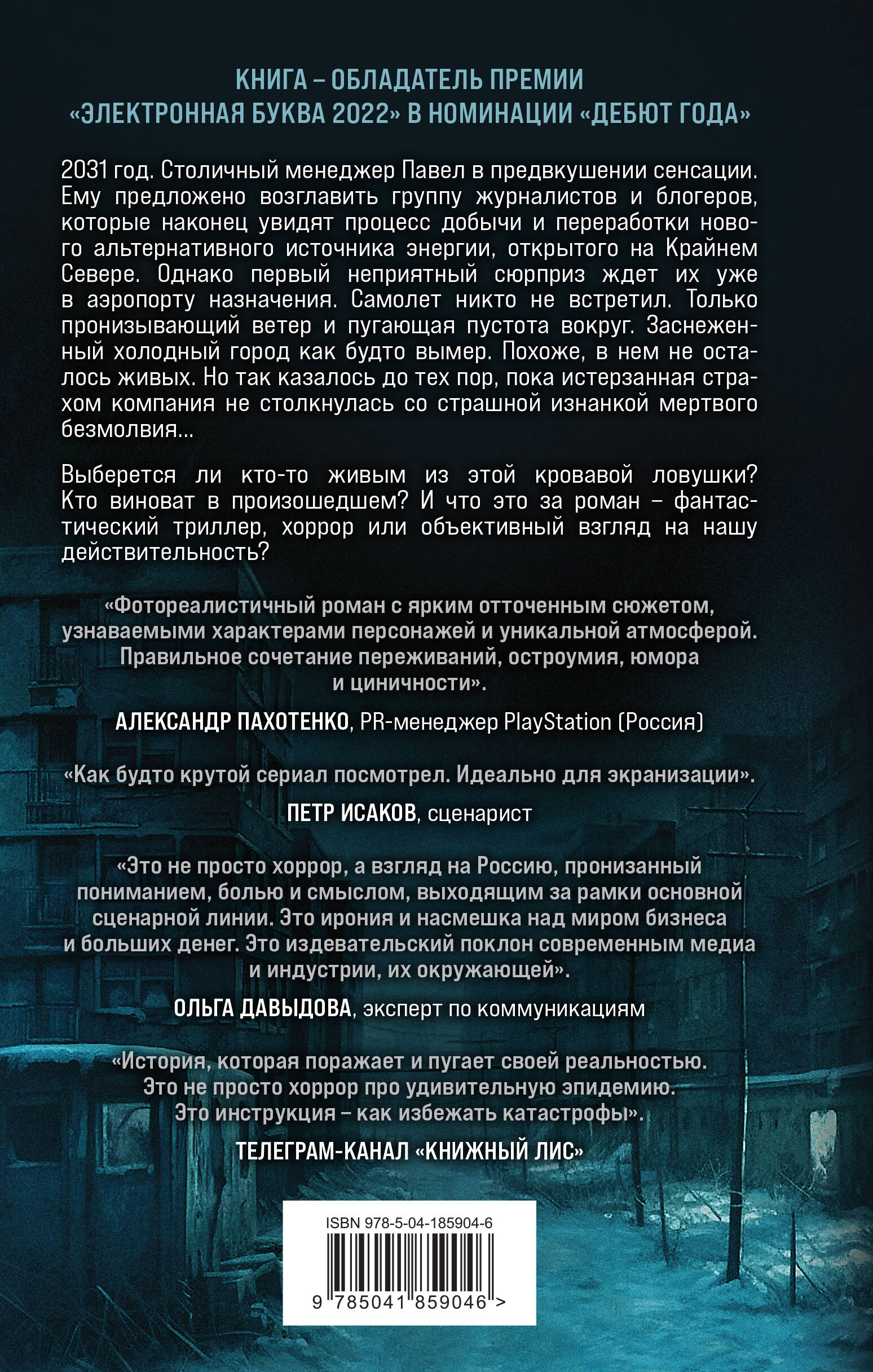 Книга - обладатель премии «Электронная буква-2022» в номинации «Дебют года». История, которая пугает своей реальностью. 2031 год. Столичный менеджер Павел в предвкушении сенсации. Ему предложено возглавить группу журналистов и блогеров, которые наконец увидят процесс добычи и переработки нового альтернативного источника энергии, открытого на Крайнем Севере. Однако первый неприятный сюрприз ждет их уже в аэропорту назначения. Самолет никто не встретил. Только пронизывающий ветер и пугающая пустота вокруг. Заснеженный холодный город как будто вымер. Похоже, в нем не осталось живых. Но так казалось до тех пор, пока истерзанная страхом компания не столкнулась со страшной изнанкой мертвого безмолвия… ------------------------------ «Фотореалистичный роман с ярким отточенным сюжетом, узнаваемыми характерами персонажей и уникальной атмосферой. Правильное сочетание переживаний, остроумия, юмора и циничности». - Александр Пахотенко, PR-менеджер PlayStation (Россия) «Как будто крутой сериал посмотрел. Идеально для экранизации». - Петр Исаков, сценарист «Это не просто хоррор, а взгляд на Россию, пронизанный пониманием, болью и смыслом, выходящим за рамки основной сценарной линии. Это ирония и насмешка над миром бизнеса и больших денег. Это издевательский поклон современным медиа и индустрии, их окружающей». - Ольга Давыдова, эксперт по коммуникациям «История, которая поражает и пугает своей реальностью. Это не просто хоррор про удивительную эпидемию. Это инструкция, как избежать катастрофы». - Телеграм-канал «Книжный Лис»| Издательство | ООО "Издательство "Эксмо" |