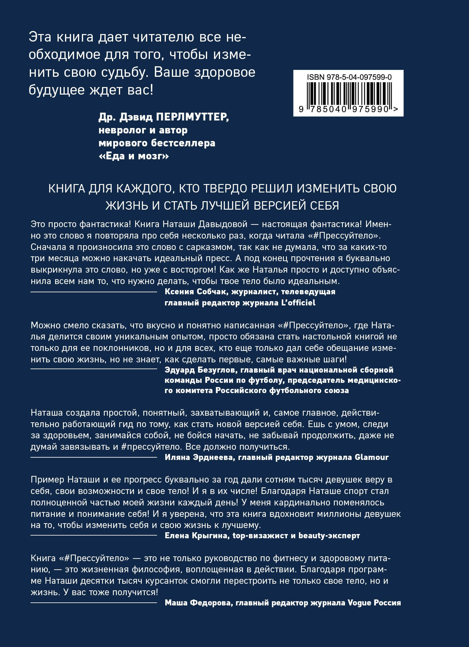 Эта книга дает читателю все необходимое для того, чтобы изменить свою судьбу. Ваше здоровое будущее ждет вас! Др. Дэвид ПЕРЛМУТТЕР, невролог и автор мирового бестселлера "Еда и мозг" Это просто фантастика! Книга Наташи Давыдовой - настоящая фантастика! Именно это слово я повторяла про себя несколько раз, когда читала #Прессуйтело. Сначала я произносила это слово с сарказмом, так как не думала, что за каких-то три месяца можно накачать идеальный пресс. А под конец прочтения я буквально выкрикнула это слово, но уже с восторгом! Как же Наталья просто и доступно объяснила всем нам то, что нужно делать, чтобы твое тело было идеальным. Ксения Собчак, журналист, телеведущая, главный редактор журнала L'officiel Можно смело сказать, что вкусно и понятно написанная #Прессуйтело, где Наталья делится своим уникальным опытом, просто обязана стать настольной книгой не только для ее поклонников, но и для всех, кто еще только дал себе обещание изменить свою жизнь, но не знает, как сделать первые, самые важные, шаги! Эдуард Безуглов, главный врач национальной сборной команды России по футболу, председатель медицинского комитета Российского футбольного союза Наташа создала простой, понятный, захватывающий и, самое главное, действительно работающий гид по тому, как стать новой версией себя. Ешь с умом, следи за здоровьем, занимайся собой, не бойся начать, не забывай продолжить, даже не думай завязывать и #прессуйтело. Все должно получиться. Иляна Эрднеева, главный редактор Glamour Пример Наташи и ее прогресс буквально за год дал сотням тысяч девушек веру в себя, свои возможности и свое тело! И я в их числе! Благодаря Наташе спорт стал полноценной частью моей жизни каждый день! У меня кардинально поменялось питание и понимание себя! И я уверена, что эта книга вдохновит миллионы девушек на то, чтобы изменить себя и свою жизнь к лучшему. Елена Крыгина, top-визажист и beauty-эксперт КНИГА ДЛЯ КАЖДОГО, КТО ТВЕРДО РЕШИЛ ИЗМЕНИТЬ СВОЮ ЖИЗНЬ И СТАТЬ ЛУЧШЕЙ ВЕРСИЕЙ СЕБЯ Книга #Прессуйтело - это не только руководство по фитнесу и здоровому питанию - это жизненная философия, воплощенная в действии. Благодаря программе Наташи десятки тысяч курсанток смогли перестроить не только свое тело, но и жизнь. У вас тоже получится! Маша Федорова, главный редактор журнала Vogue Россия