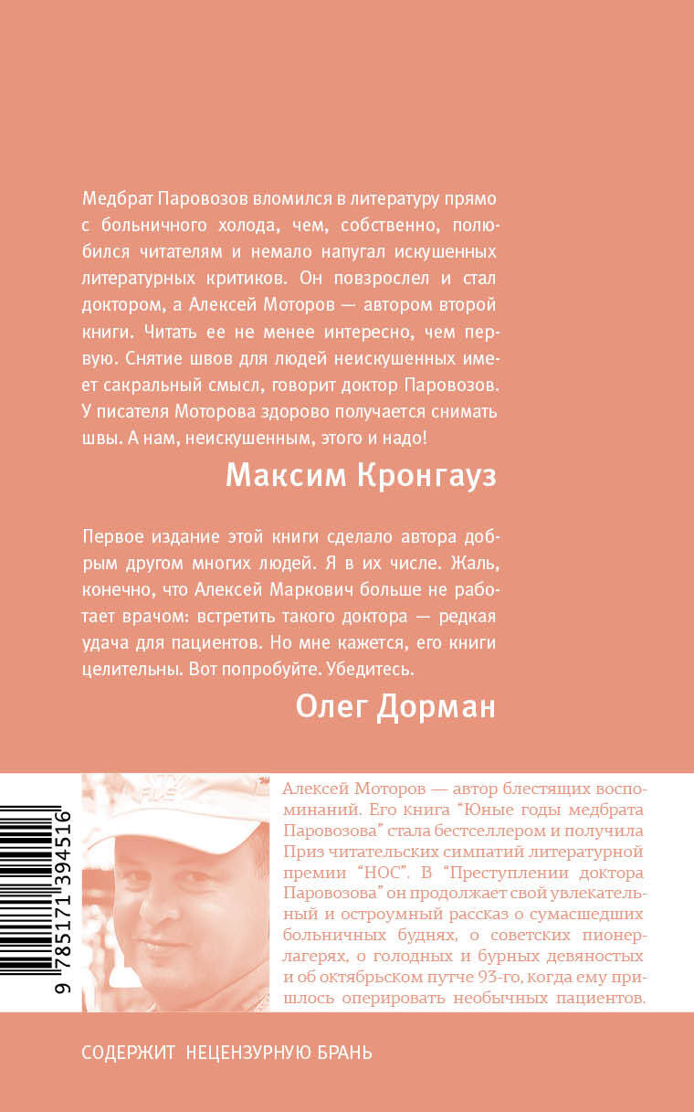 Алексей Моторов - автор блестящих воспоминаний о работе в реанимации одной из столичных больниц. Его первая книга "Юные годы медбрата Паровозова" имела огромный читательский успех, стала "Книгой месяца" в книжном магазине "Москва", вошла в лонг-лист премии "Большая книга" и получила Приз читатель- ских симпатий литературной премии "НОС". В "Преступлении доктора Паровозова" Моторов продолжает рассказ о своей жизни. Его студенческие годы пришлись на бурные и голодные девяностые. Кем он только не работал, учась в мединституте, прежде чем стать врачом в 1‑й Градской! Остроумно и увлекательно он описывает безумные больничные будни, смешные и драматические случаи из своей практики, детство в пионерлагерях конца семидесятых и октябрьский путч 93‑го, когда ему, врачу-урологу, пришлось оперировать необычных пациентов.| Издательство | Издательство "АСТ" |