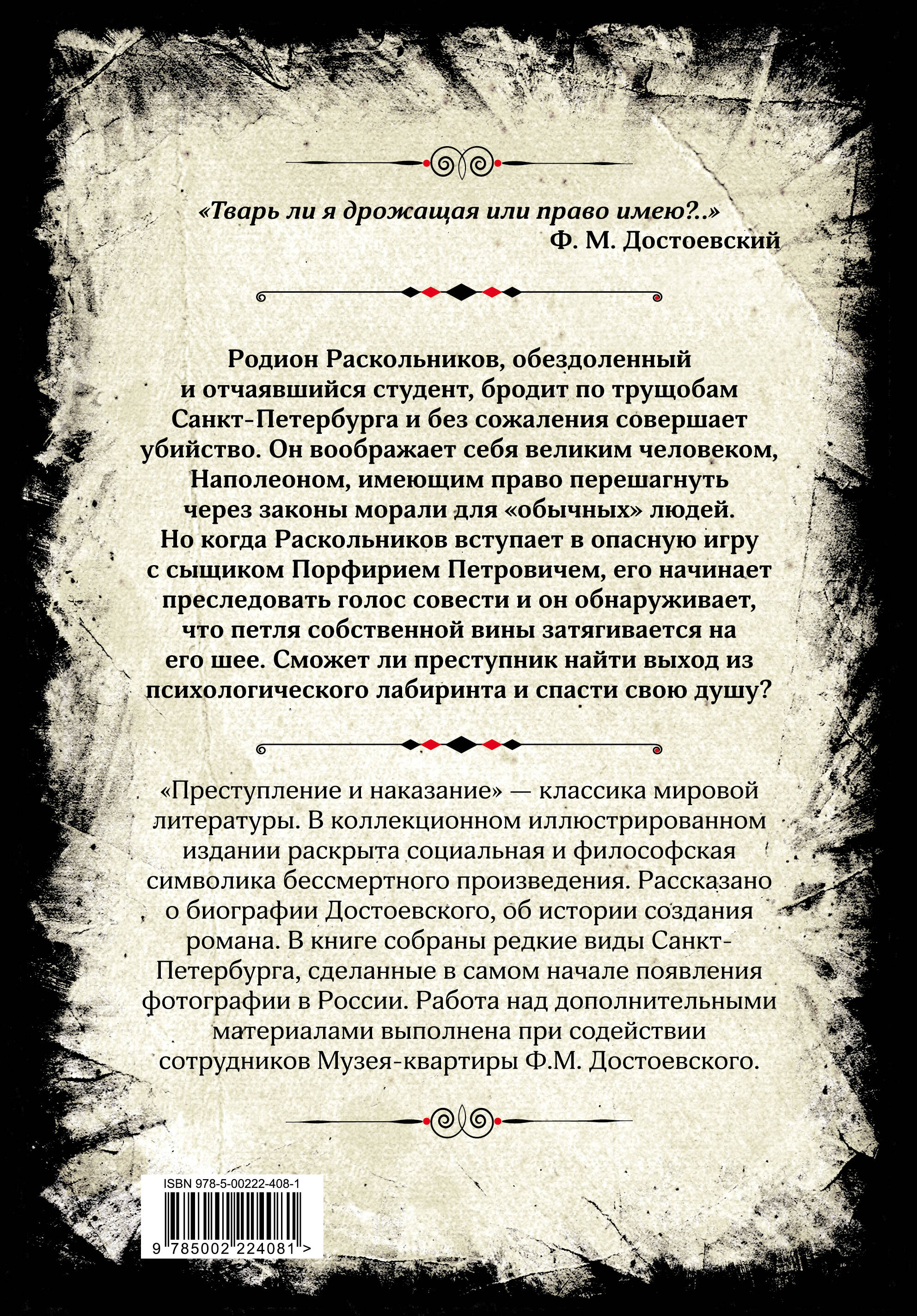 «Тварь ли я дрожащая или право имею?..» Ф. М. Достоевский Родион Раскольников, обездоленный и отчаявшийся бывший студент, бродит по трущобам Санкт-Петербурга, города прекрасного и одновременно страшного, и без сожаления совершает случайное убийство. Он воображает себя великим человеком, Наполеоном, действующим ради более высокой цели, имеющим право перешагнуть через законы морали для «обычных» людей. Но когда Раскольников вступает в опасную игру в кошки-мышки с подозрительным сыщиком Порфирием Петровичем, его начинает преследовать растущий голос совести, и он обнаруживает, что петля собственной вины затягивается на его шее. Сможет ли преступник найти выход из ужасного психологического лабиринта и спасти свою душу? «Преступление и наказание» - трагический и мрачный шедевр, классика мировой литературы. В коллекционном иллюстрированном издании раскрыта социальная и философская символика бессмертного произведения. Рассказано о биографии Достоевского, об истории создания романа. Приведены факты из сыскных дел дореволюционной России. В книге собраны редкие виды Санкт-Петербурга, сделанные в самом начале появления фотографии в России. Работа над дополнительными материалами выполнена при содействии сотрудников Музея-квартиры Ф.М. Достоевского.| Издательство | Агентство Алгоритм ООО |