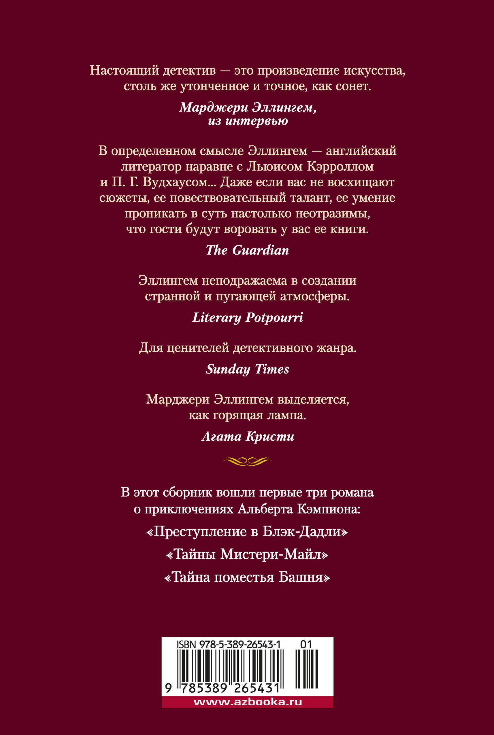 Марджери Луиза Эллингем - английская писательница, принадлежащая "золотому веку английской литературы", признанная "королева детектива" наряду с Агатой Кристи, Дороти Сэйерс и Найо Марш. Наибольшую известность приобрели книги Эллингем о сыщике-джентльмене Альберте Кэмпионе. В этот том вошли первые три романа ее главного цикла. Когда Джорджа Эббершоу приглашают на уик-энд в Блэк-Дадли, он видит в этом шанс сделать предложение Мегги Олифант. Но безобидное развлечение гостей превращается в смертельную игру, и поиск преступника теперь занимает Джорджа больше, чем будущая помолвка. Вэл Гирт едва не стал жертвой похитителей. Он и не подозревает, насколько велика грозящая ему опасность, - в отличие от таинственного мистера Кэмпиона, сыщика-любителя, который сообщает ему новость: за древней чашей, отданной на сохранение семье Вэла, охотится шайка дерзких грабителей. В руках судьи Крауди Лоббетта - улики, раскрывающие личность преступного гения. Четыре покушения на жизнь вынуждают судью обратиться за помощью к Альберту Кэмпиону. Сыщик решает спрятать Лоббетта в Мистери-Майл, но это поместье превращается в западню.| Издательство | Издательство АЗБУКА ООО |