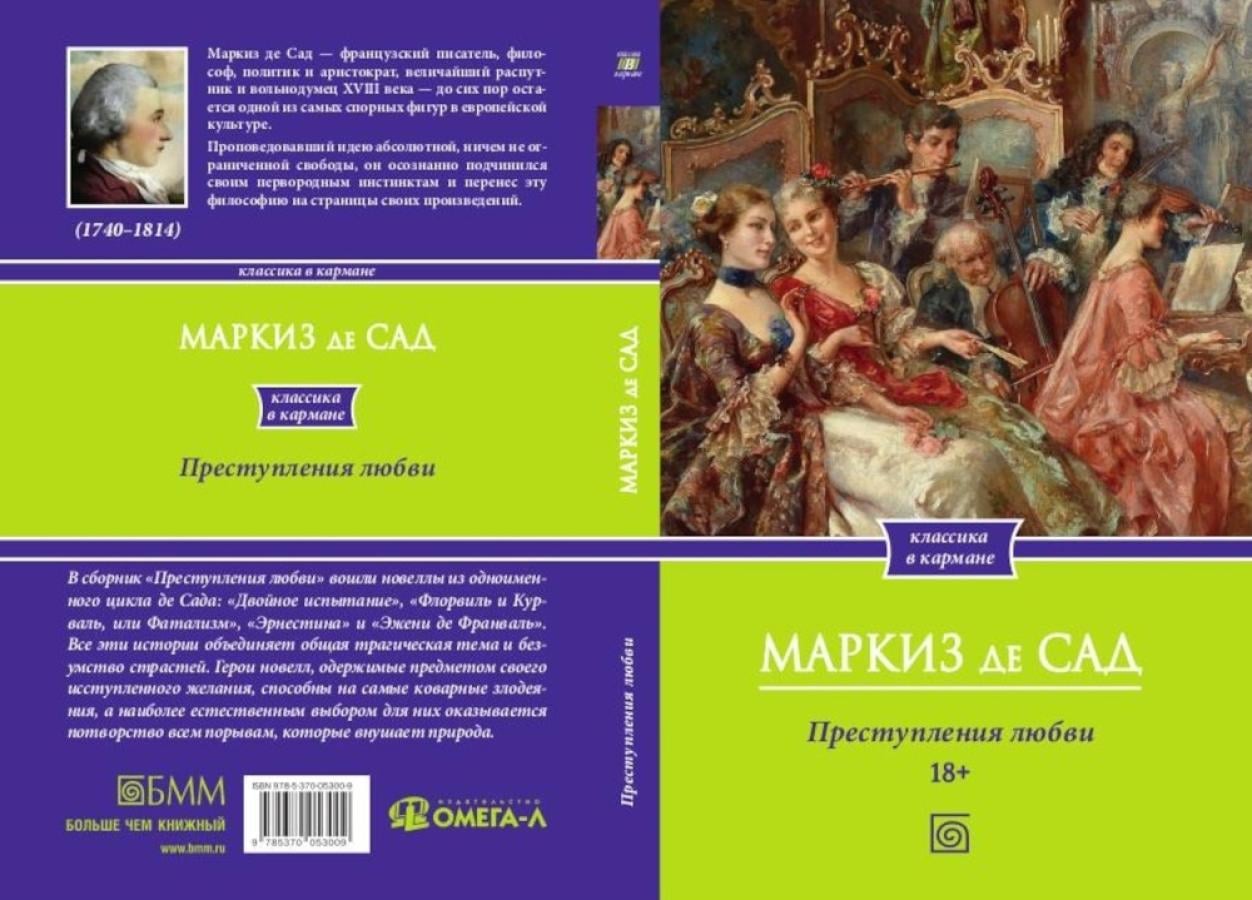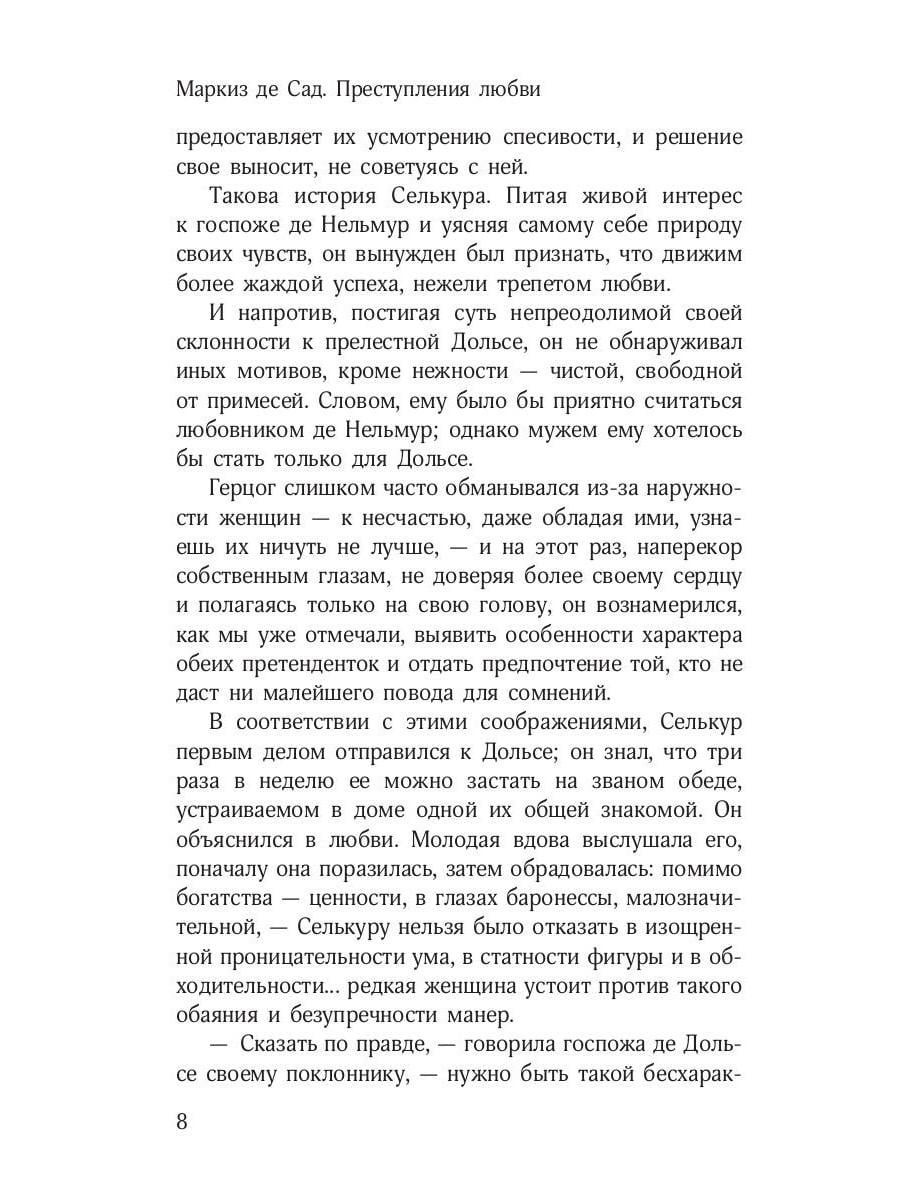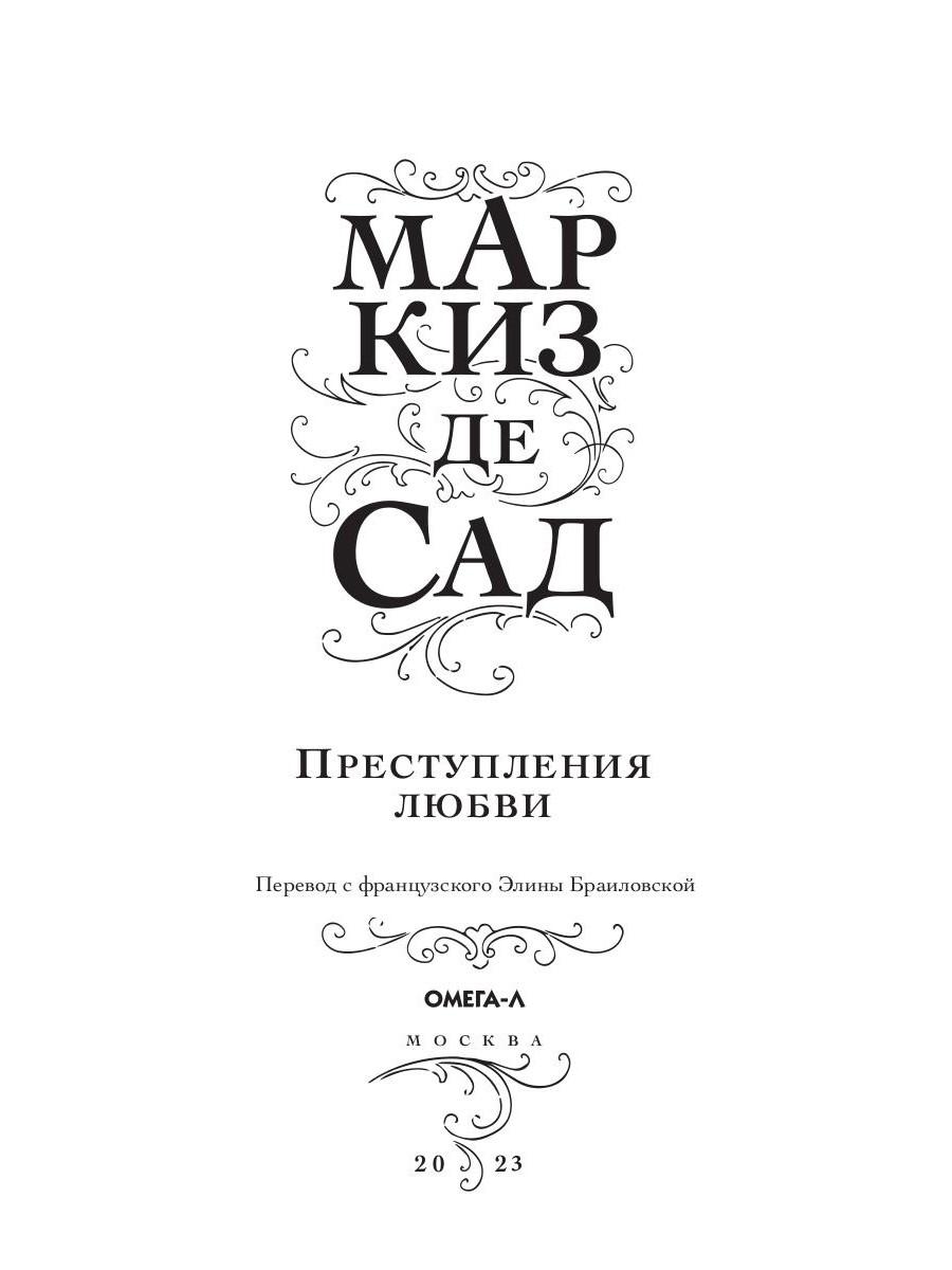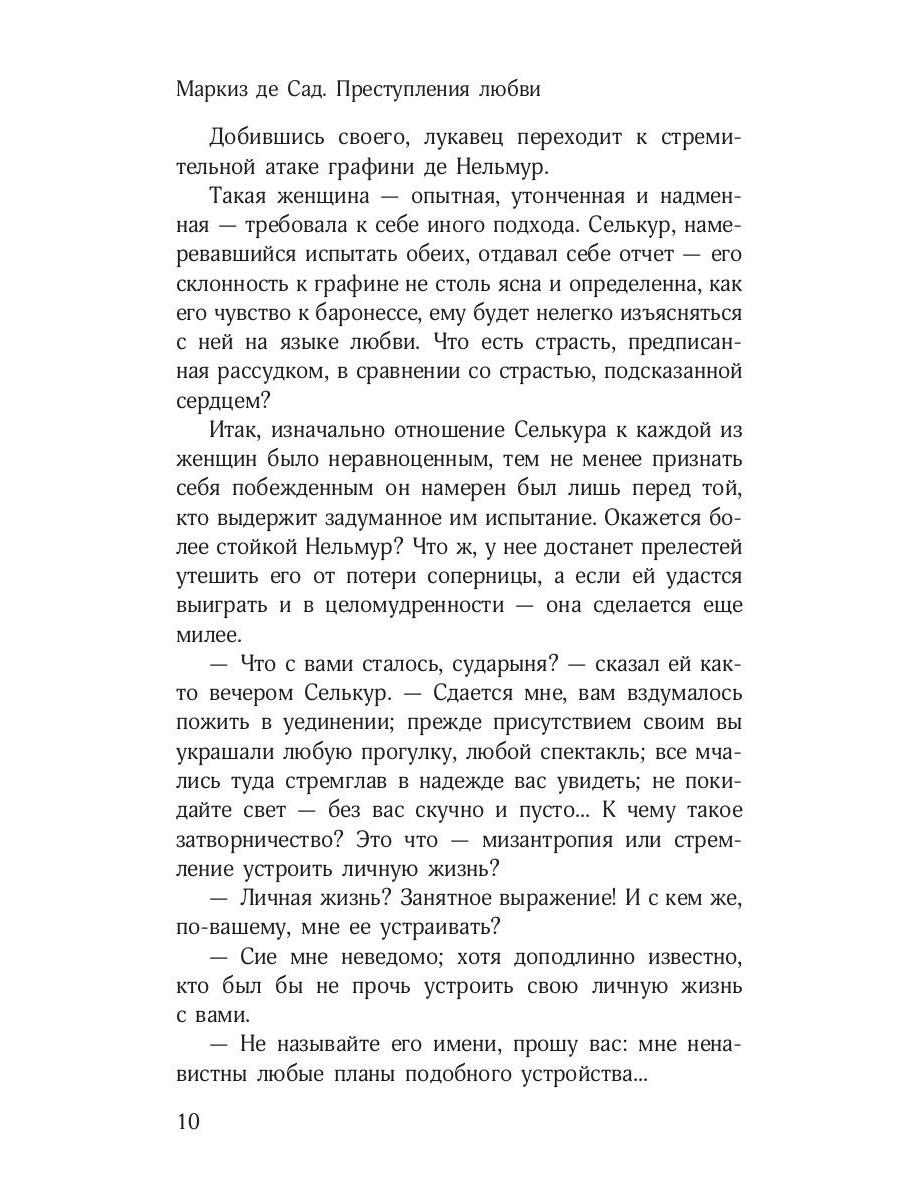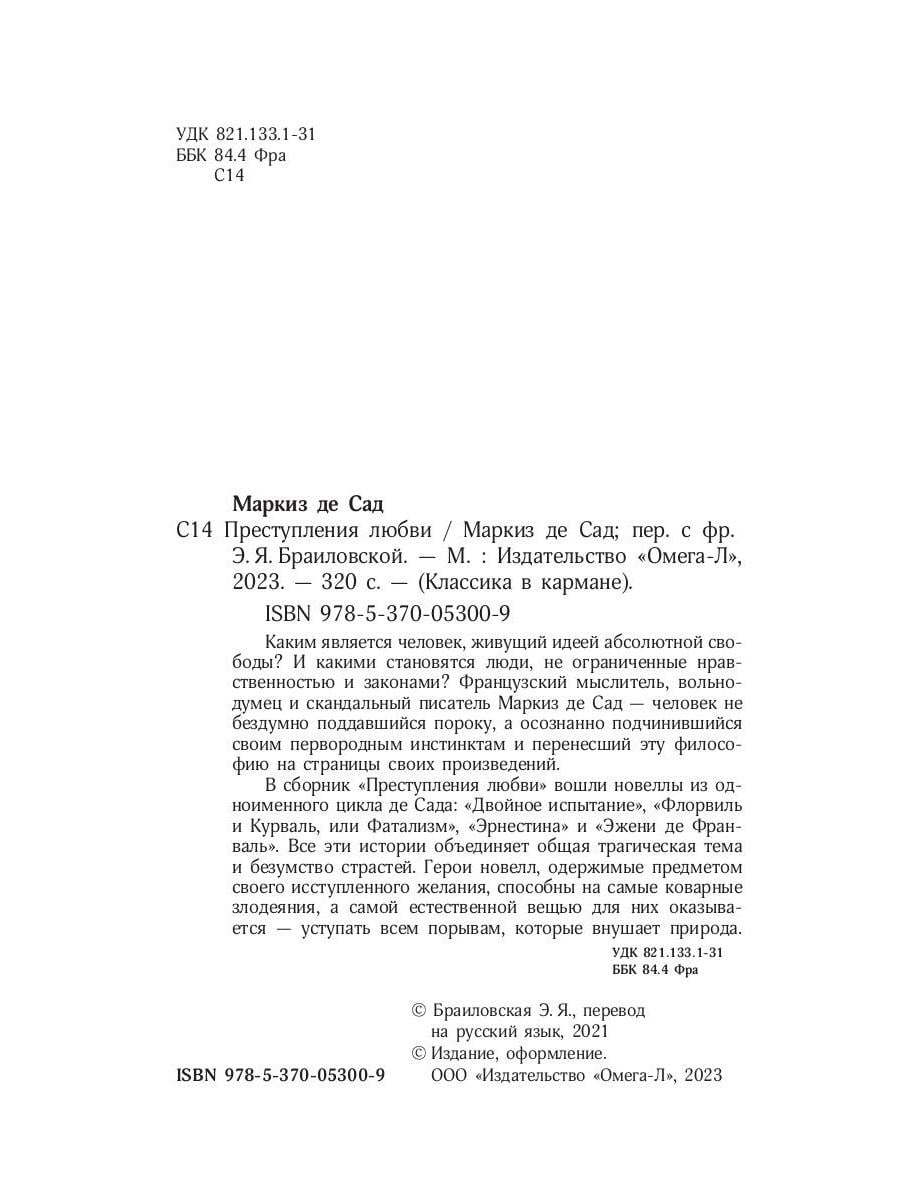 Каким является человек, живущий идеей абсолютной свободы? И какими становятся люди, не ограниченные нравственностью и законами? Французский мыслитель, вольнодумец и скандальный писатель Маркиз де Сад - человек не бездумно поддавшийся пороку, а осознанно подчинившийся своим первородным инстинктам и перенесший эту философию на страницы своих произведений. В сборник «Преступления любви» вошли новеллы из одноименного цикла де Сада: «Двойное испытание», «Флорвиль и Курваль, или Фатализм», «Эрнестина» и «Эжени де Франваль». Все эти истории объединяет общая трагическая тема и безумство страстей. Герои новелл, одержимые предметом своего исступленного желания, способны на самые коварные злодеяния, а самой естественной вещью для них оказывается - уступать всем порывам, которые внушает природа.| Издательство | Омега-Л |