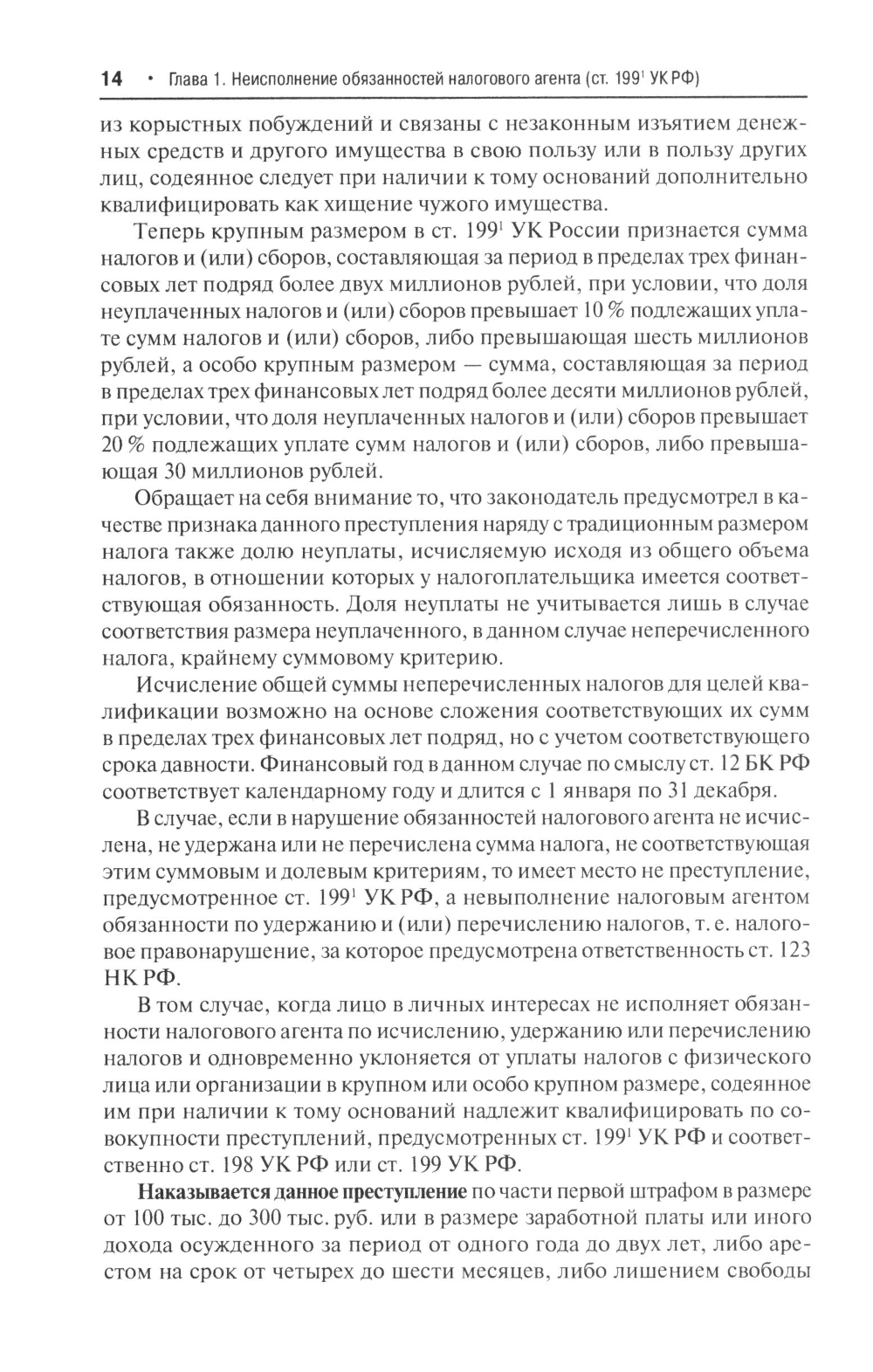 Второе издание данной книги, значительно переработанное и дополненное, посвящено анализу судебной практики по двум наименее исследованным налоговым составам УК России - ст. 199.1, предусматривающей ответственность за неисполнение обязанностей налогового агента, и ст. 199.2, которая карает за сокрытие денежных средств либо имущества организации или индивидуального предпринимателя, за счет которых должно производиться взыскание налогов и (или) сборов. Вниманию читателей представлены 17 наиболее интересных и характерных приговоров по данным составам, из которых вычленяются конкретные противоправные налоговые схемы, а также показывается механизм их выявления. Кроме того, на примере судебно-следственной практики затронуты вопросы совокупности ст. 199.1 и 199.2 УК России, а также противоправных деяний, облегчающих совершение налоговых преступлений. В исследовании учтены последние изменения законодательства, вернувшие налоговые преступления в число предикатных к легализации преступно полученных доходов и изменившие процессуальный порядок возбуждения уголовных дел по налоговым преступлениям. Актуальность данного издания обусловлена тем, что в условиях происходящей в течение 2014-2015 гг. санкционной антироссийской кампании полнота и своевременность поступления налогов в государственную казну становится одним из элементов стабильности отечественной экономики и гарантией стабильности уровня жизни наших граждан. Законодательство приведено по состоянию на февраль 2015 г. Книга рассчитана на широкий круг читателей: налогоплательщиков, ученых, сотрудников налоговых и правоохранительных органов, аудиторов, адвокатов, аспирантов и студентов юридических и экономических высших учебных заведений, специалистов, интересующихся данной проблематикой.| Издательство | Проспект |