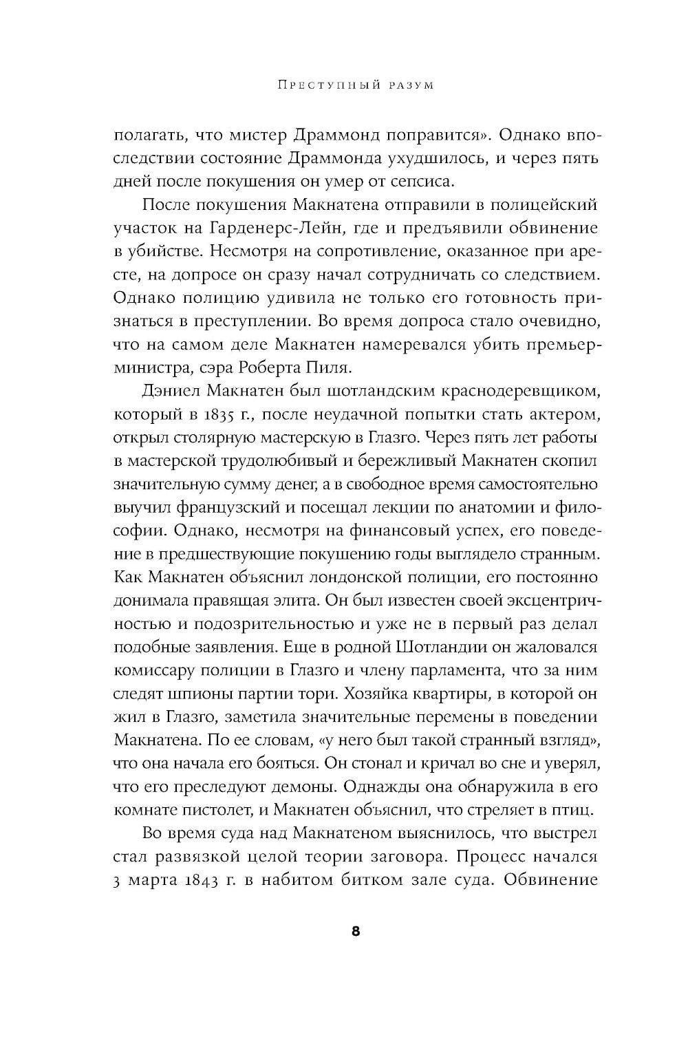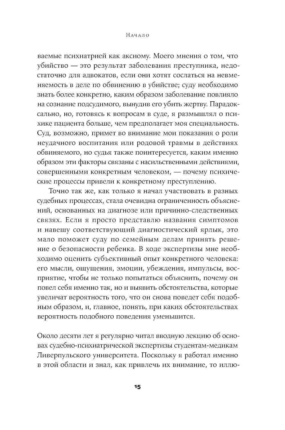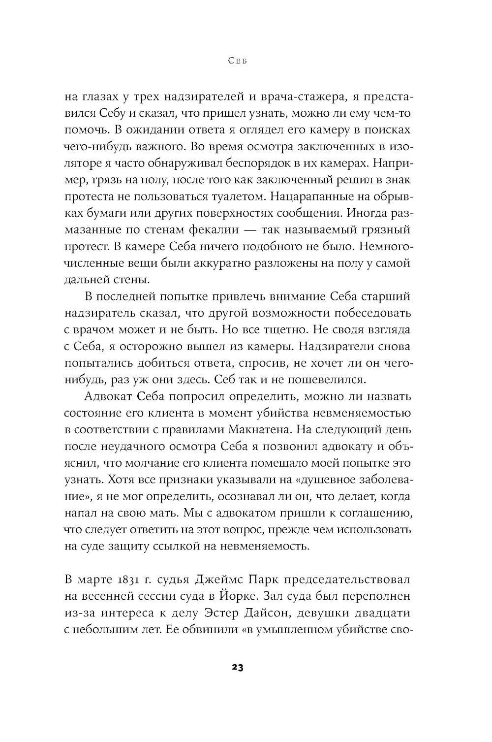 СОДЕРЖИТ ИНФОРМАЦИЮ О НАРКОТИЧЕСКИХ ИЛИ ПСИХОТРОПНЫХ ВЕЩЕСТВАХ, УПОТРЕБЛЕНИЕ КОТОРЫХ ОПАСНО ДЛЯ ЗДОРОВЬЯ. ИХ НЕЗАКОННЫЙ ОБОРОТ ВЛЕЧЕТ УГОЛОВНУЮ ОТВЕТСТВЕННОСТЬ. Автор книги - судебный психиатр, проработавший в британской пенитенциарной системе много лет. Десять историй из его практики - это десять судеб людей, попавших в обстоятельства, которые привели к преступлениям. Рассказывая о своих героях, автор ставит вопросы гораздо шире, чем того требуют его профессиональные обязанности. Что толкает человека на преступление? Можно ли это предотвратить? Можно ли изменить психологию преступника? Вдумчивое и увлекательное исследование позволяет читателю не только проникнуть в больничные палаты, тюрьмы строгого режима, в залы судебных заседаний. Глубоко сочувствуя своим подопечным, Нейтан предлагает по-другому взглянуть на людей, скрытых за ярлыками «психопат», «серийный убийца», «сексуальный преступник». Психика формируется не сама по себе. Психические процессы находятся под влиянием реакций человека на индивидуальном, институциональном и социальном уровнях. От этого зависит, как проявится его агрессивность. Каковы бы ни были истоки склонности человека к насилию, его взаимодействие с другими постоянно меняется. «Мы должны проявлять искренний интерес к человеку». В этом, по мнению автора, ответственность общества и окружающих людей.| Издательство | Альпина нон-фикшн |