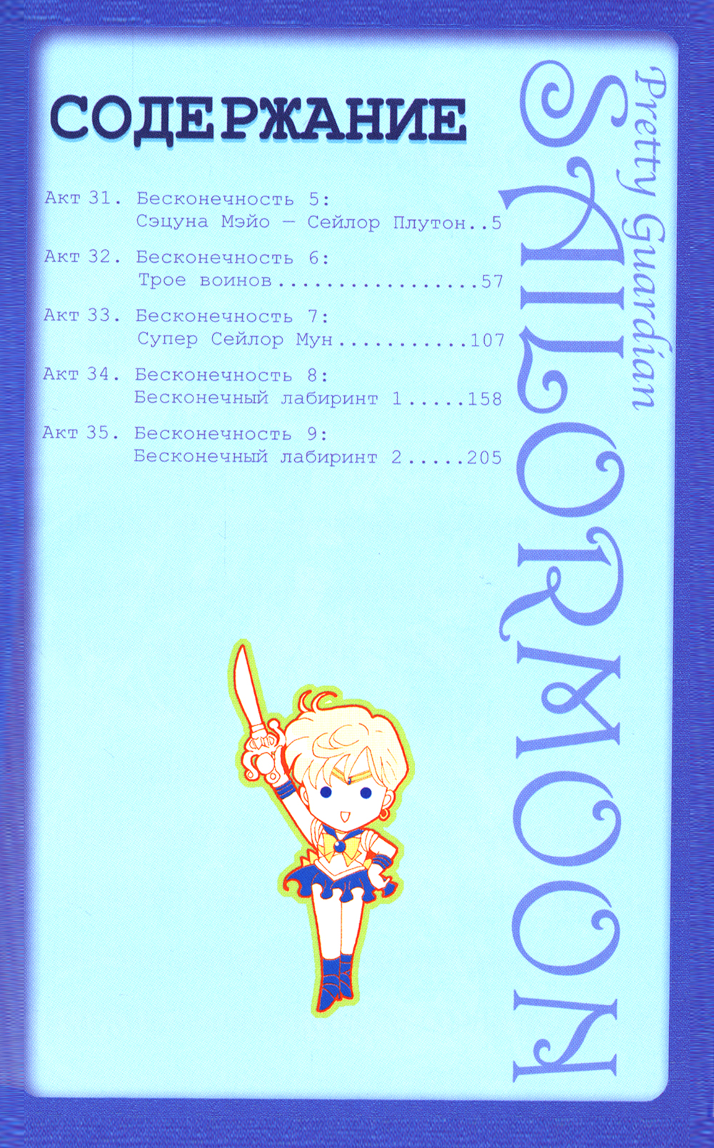 Сэйлор Уран, Сэйлор Нептун и заново переродившаяся Сэйлор Плутон наконец-то раскрывают Усаги и остальным воинам в матросках свои истинные цели: они прибыли на Землю, чтобы остановить вторжение «Апостолов Смерти», инопланетной расы, мечтающей уничтожить все живое во вселенной. Но предотвратить неизбежное можно лишь единственной ценой: нужно найти и убить того, в чьем теле скрывается готовящийся вот-вот возродиться Бог Разрушения. Вскоре выясняется, что это Хотару, новая подруга Малышки и дочь основателя Академии «Бесконечность» Соити Томоэ. Теперь Усаги предстоит найти для себя ответ на неразрешимую дилемму - как спасти мир, не принося при этом никаких жертв?| Издательство | ЭксЭл Медиа |