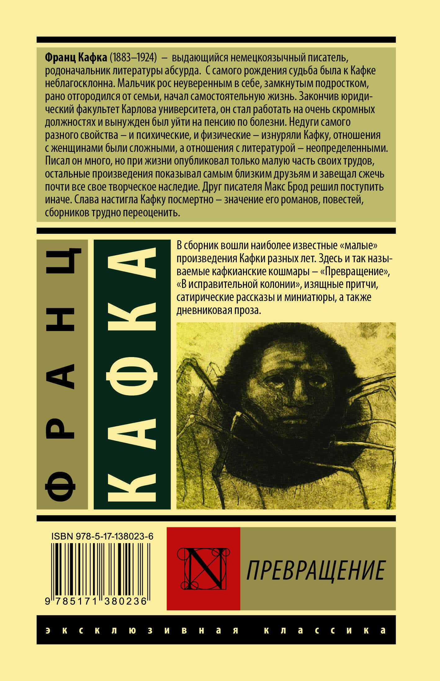 В сборник вошли наиболее известные "малые" произведения Кафки разных лет. Здесь и так называемые кафкианские кошмары - "Превращение", "В исправительной колонии", изящные притчи, сатирические рассказы и миниатюры, а также дневниковая проза.| Издательство | ИЗДАТЕЛЬСТВО "АСТ" |
