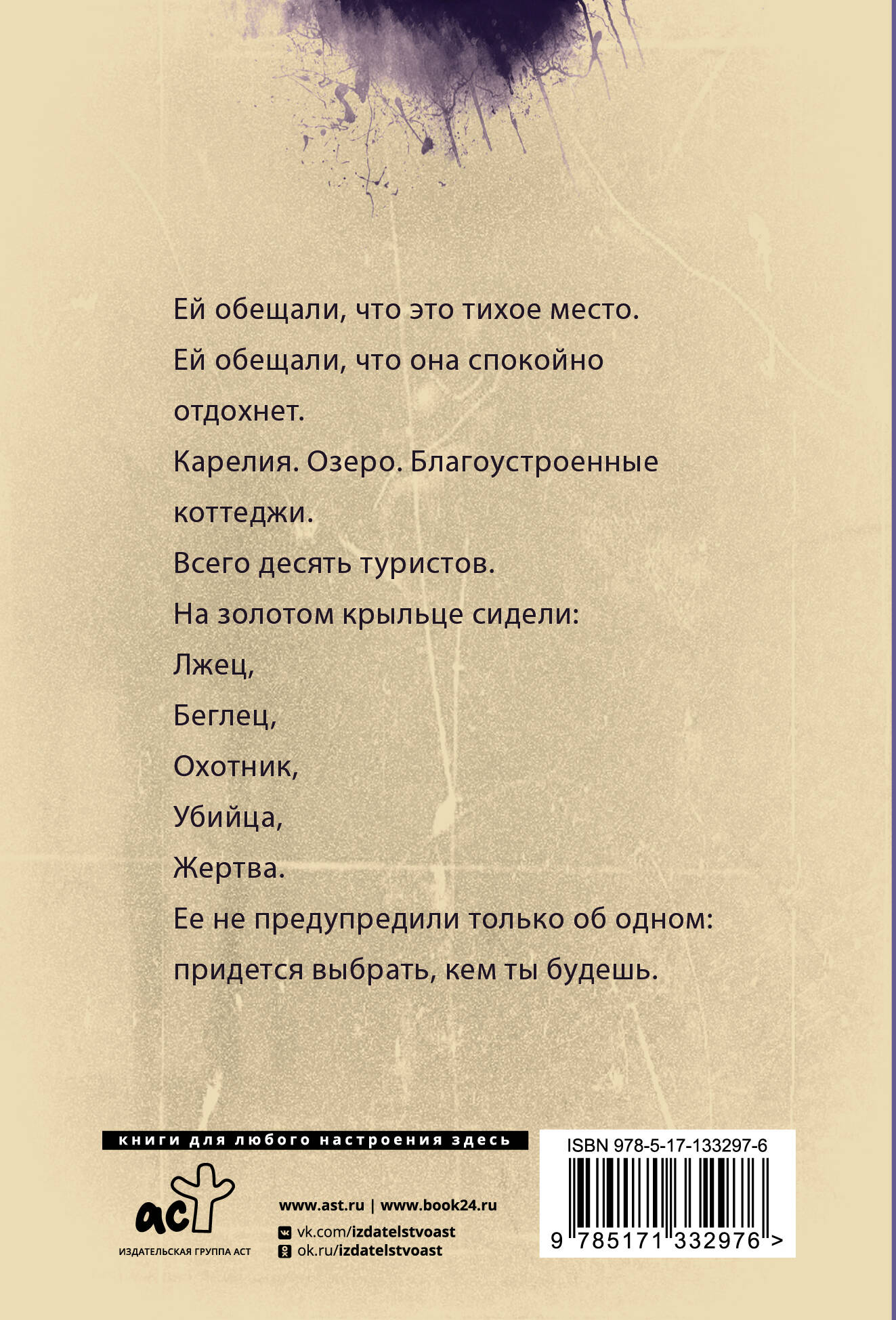 Ей обещали, что это тихое место. Ей обещали, что она спокойно отдохнет. Карелия. Озеро. Благоустроенные коттеджи. Всего десять туристов. На золотом крыльце сидели: Лжец, Беглец, Охотник, Убийца, Жертва. Ее не предупредили только об одном: придется выбрать, кем ты будешь.| Издательство | ИЗДАТЕЛЬСТВО "АСТ" |