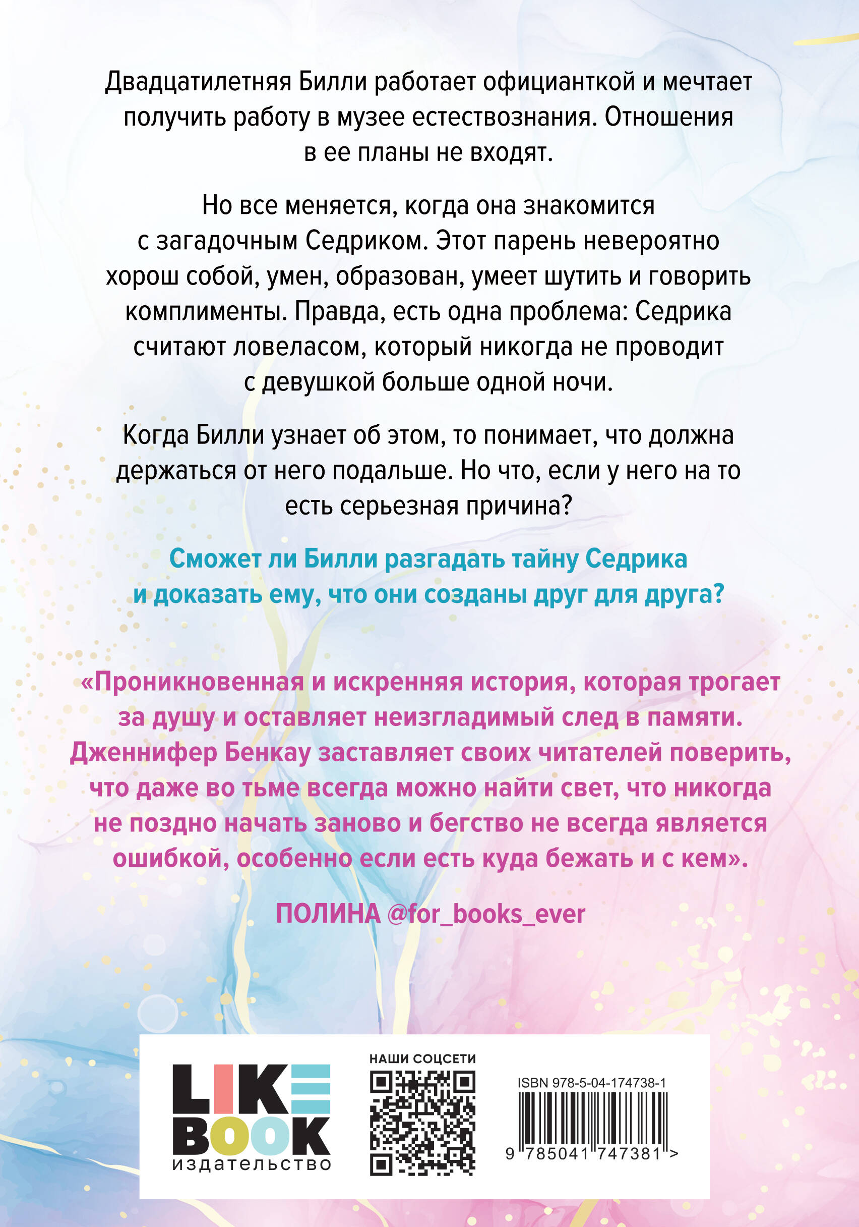 Бестселлер в Германии! «Причина остаться» - романтическая новинка от Дженнифер Бенкау, автора знаменитой книги «Одна истинная королева». Двадцатилетняя Билли работает официанткой и мечтает получить работу в музее естествознания. Отношения в ее планы не входят. Но все меняется, когда она знакомится с загадочным Седриком. Этот парень невероятно хорош собой, умен, образован, умеет шутить и говорить комплименты. Правда, есть одна проблема: Седрика считают ловеласом, который никогда не проводит с девушкой больше одной ночи. Когда Билли узнает об этом, то понимает, что должна держаться от него подальше. Но что, если у него на то есть серьезная причина? Сможет ли Билли разгадать тайну Седрика и доказать ему, что они созданы друг для друга? Эта история о любви и предательстве, силе и слабости, успехах и неудачах, творчестве и беспомощности, страхах и храбрости. Трогательный роман, который понравится поклонникам Моны Кастен, Бьянки Иосивони. Морган Монкомбл, Сары Шпринц, Анны Тодд и Колин Гувер. Об авторе Дженнифер Бенкау - популярная немецкая писательница, автор нескольких YA романов, среди которых бестселлер «Одна истинная королева». Суммарный тираж ее книг составляет более 100 000 проданных экземпляров. Романы Бенкау часто попадают в список бестселлеров Spiegel и занимают верхние строчки.| Издательство | ООО "Издательство "Эксмо" |