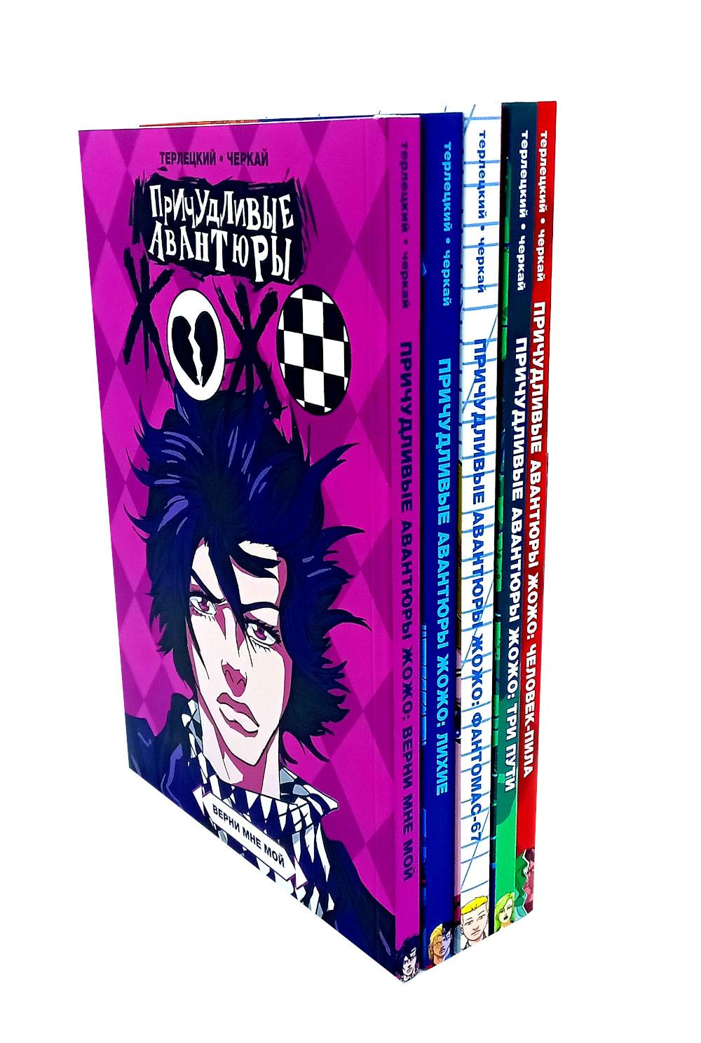 Комплект содержит книги В. Терлецкого, К.Черкая : «Причудливые авантюры Жожо. Верни мне мой» Что, если бы действие популярных манги и аниме происходило не в Японии, Египте или Италии, а в России, да ещё и в 2007 году? Вдохновившись работами гения Хирохико Араки, автор Виталий Терлецкий и художник Кирилл Черкай вместе создают совершенно новую историю с совершенно новым сюжетом. Местами пародийную, местами остроумную, а местами - ностальгическую. Её персонажи кажутся знакомыми, но они нигде и никогда раньше не появлялись. Эту мангу можно любить или ненавидить, но стоит признать одно: ничего подобного вы ещё не видели. Горящий сентябрь, слабоалкогольные энергетики, кнопочные телефоны, золотые свободные двухтысячные. Верни мне мой сами знаете что. «Причудливые авантюры Жожо. Лихие» Ещё один том популярной русской додзинси по сверхпопулярным японским аниме и манге. В этом томе автор Виталий Терлецкий и художник Кирилл Черкай ещё больше развивают собственную вселенную, отходя от первоисточника, послужившего вдохновением. Ещё больше абсолютно новых персонажей с уникальными способностями! На этот раз в сеттинге ранней эпохи лихих девяностых. Кроссовки, жвачка, кэпсы, шоколадные батончики и гиперинфляция. Свобода и беспредел. Бандит Дима Брандов и милиционер Жора Жодин. Кто они - друзья или враги? Криминальная драма в лучших традициях «Бригады», «Убойной силы» и «Бандитского Петербурга»! Приключения семьи Жодиных продолжаются... или начинаются? «Причудливые Авантюры Жожо. Фантомас-67» Советские школьники ловят Фантомаса, но это манга. Та самая легендарная додзинси (пародийная манга) о том, что было бы, если бы персонажи популярных японских аниме и манги жили в России… даже не в России, а в Советском Союзе. Виталий Терлецкий и Кирилл Черкай возвращаются! На этот раз - совсем за старое, ведь дело происходит в 1967 году. В СССР на большие экраны впервые выходит культовый французский фильм «Фантомас». Он удивляет взрослых и поражает умы советских школьников. Братья Михаил и Виктор Жодины решают поймать Фантомаса во имя славы и Родины. Но правда ли Фантомас прячется в их маленьком закрытом городке, или всё это только их выдумки? «Причудливые Авантюры Жожо. Три пути» Приключения семьи Жодиных продолжаются, и на этот раз в главной роли Алиса Жодина, которая живёт в Санкт-Петербурге 2025 года и работает вебкам-моделью. «Причудливые авантюры Жожо. Человек-Пила» Человек-пила против жожо? Да уж, в японской манге такое просто невозможно представить. Вебкам-модель Алиса Жодина и бывший кладмэн Кипятков продолжают собирать информацию, чтобы победить загадочную огранизацию «Химера», но в дело вмешивается Человек-Пила, приехавший в Санкт-Петербург по ошибке из другой серии додзинси. кхм, простите, на самом деле из Москвы. Виталий Терлецкий и Кирилл Черкай представляют долгожданное продолжение книг «Причудливые авантюры Жожо: Три пути» и «Человек-Пила» и очень гордятся первым в России додзинси-кроссовером.| Издательство | Терлецки Комикс |