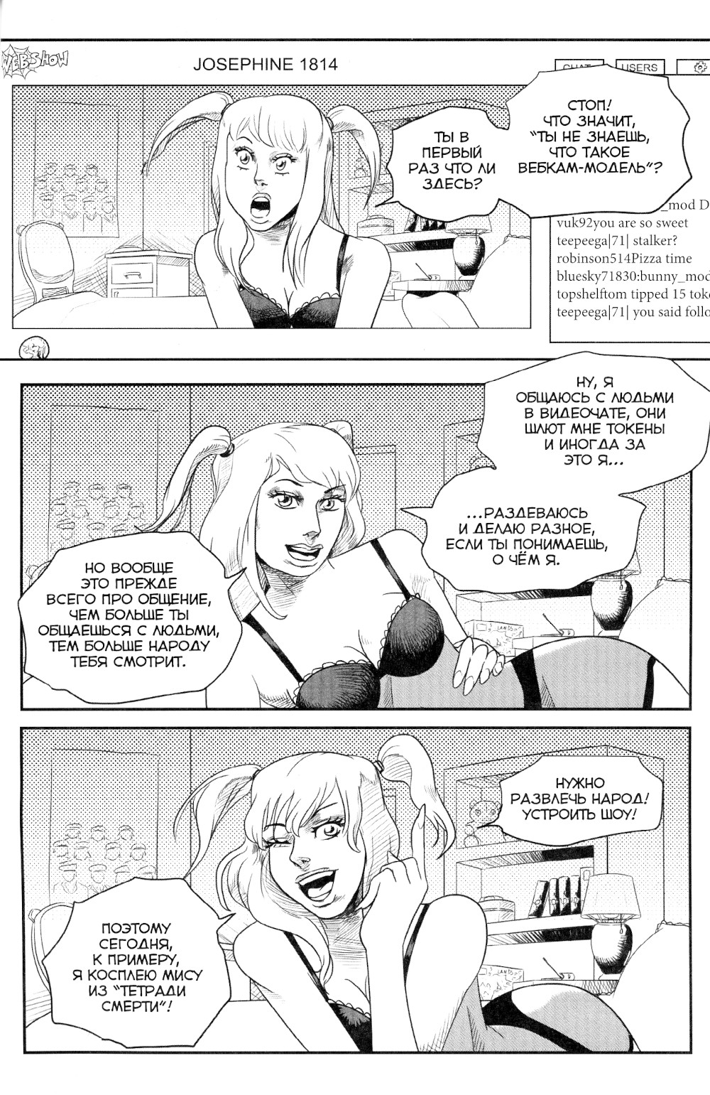 Алисе Жодиной восемнадцать лет, и в этом году она заканчивает школу. Она прилежная ученица и хорошая дочь, но никто не знает, что ночью она работает вебкам-моделью. Удивительный и запретный мир, изнанка парадного Петербурга 2025 года манит своими соблазнами и предлагает множество перспектив, но ничего не бывает просто так, и всегда придётся что-то отдать взамен. Виталий Терлецкий и Кирилл Черкай возвращаются с уже четвёртой книжкой цикла «Причудливые Авантюры Жожо», которую можно смело читать, даже если вы никогда раньше ничего не слышали про эту серию.| Издательство | Терлецки Комикс |