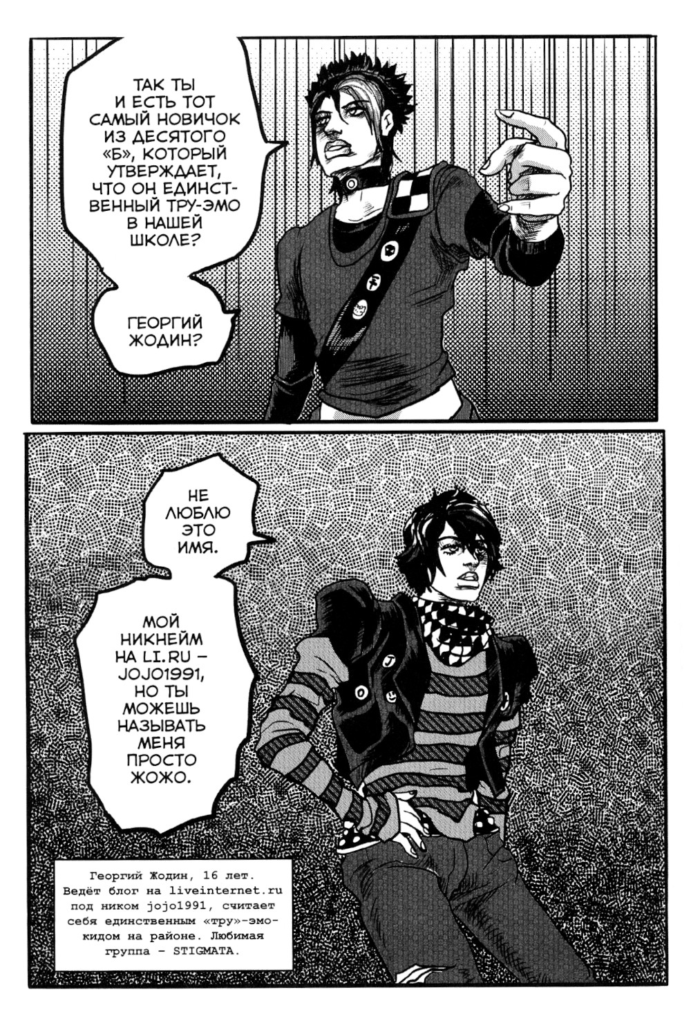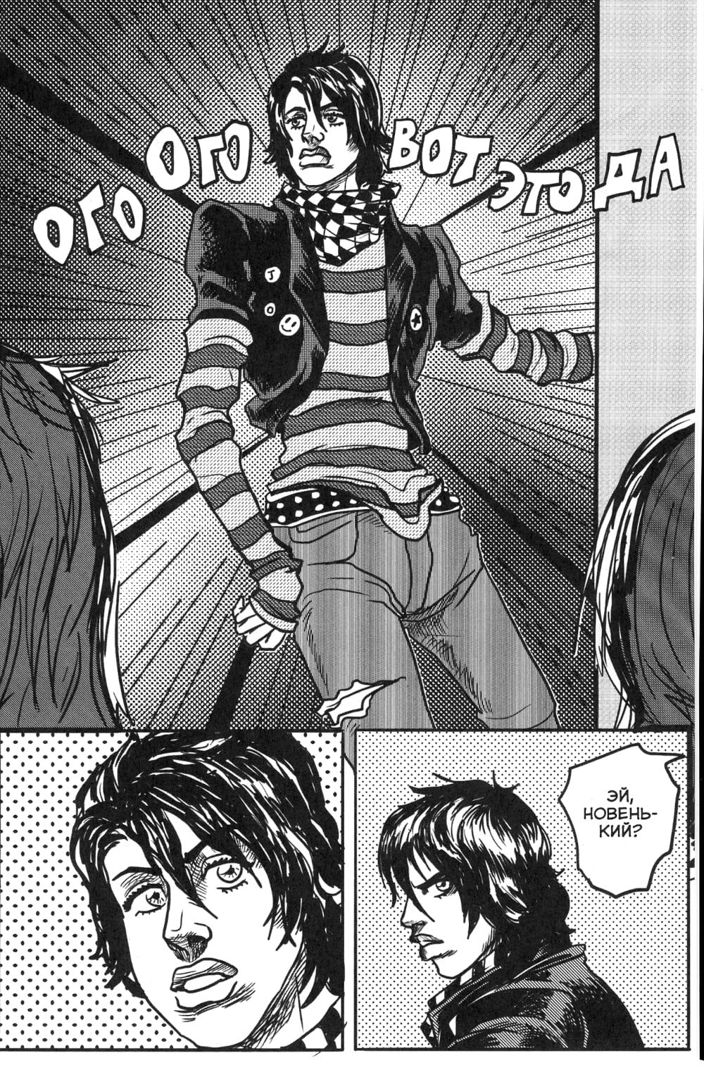 Что, если бы действие популярных манги и аниме происходило не в Японии, Египте или Италии, а в России, да ещё и в 2007 году? Вдохновившись работами гения Хирохико Араки, автор Виталий Терлецкий и художник Кирилл Черкай вместе создают совершенно новую историю с совершенно новым сюжетом. Местами пародийную, местами остроумную, а местами - ностальгическую. Её персонажи кажутся знакомыми, но они нигде и никогда раньше не появлялись. Эту мангу можно любить или ненавидить, но стоит признать одно: ничего подобного вы ещё не видели. Горящий сентябрь, слабоалкогольные энергетики, кнопочные телефоны, золотые свободные двухтысячные. Верни мне мой сами знаете что.| Издательство | Терлецки Комикс |