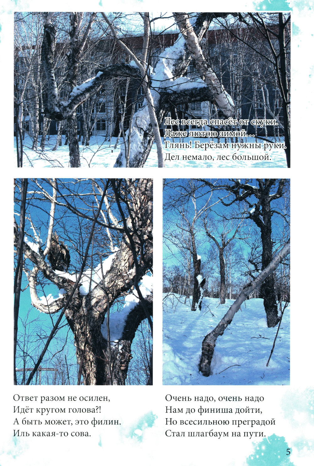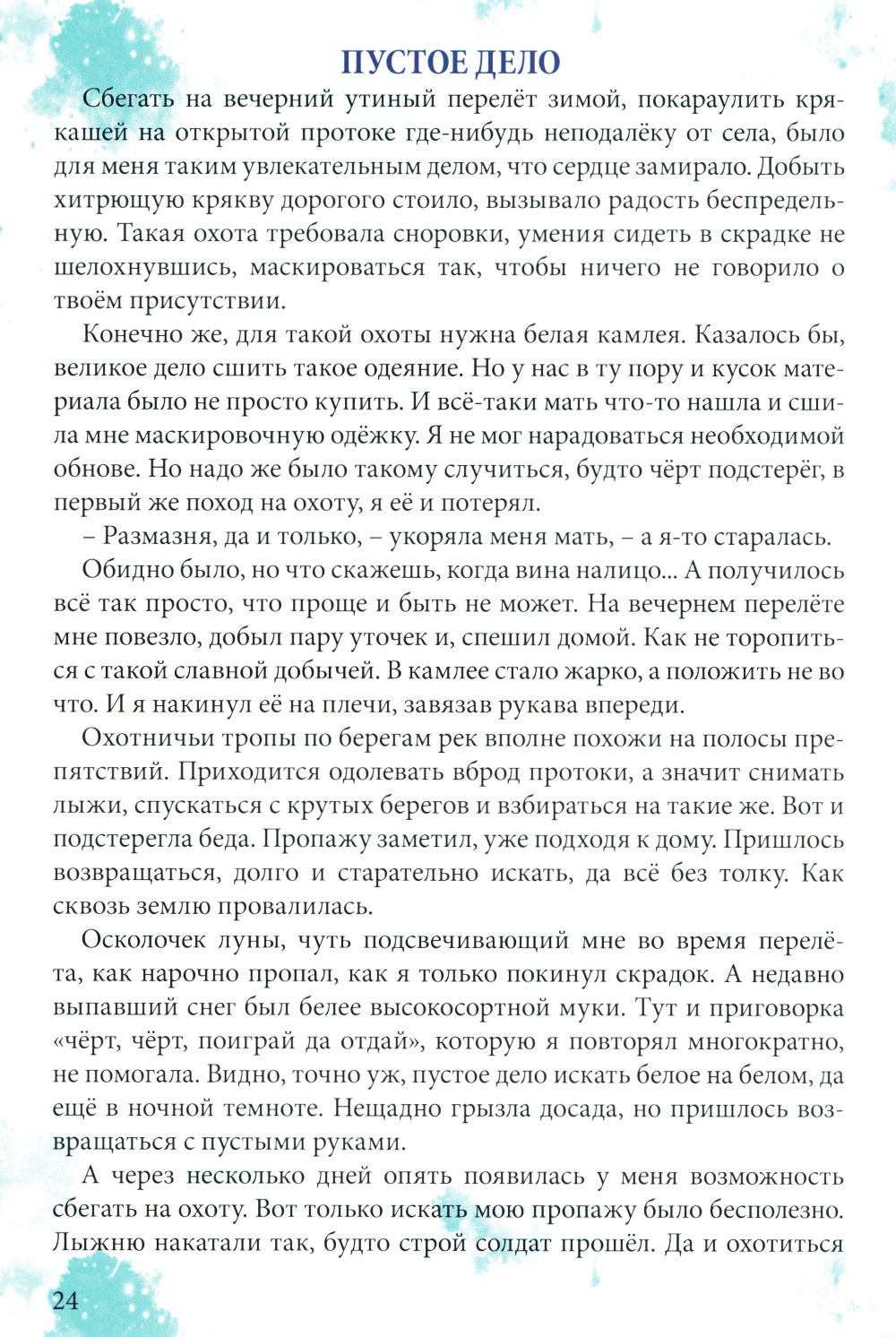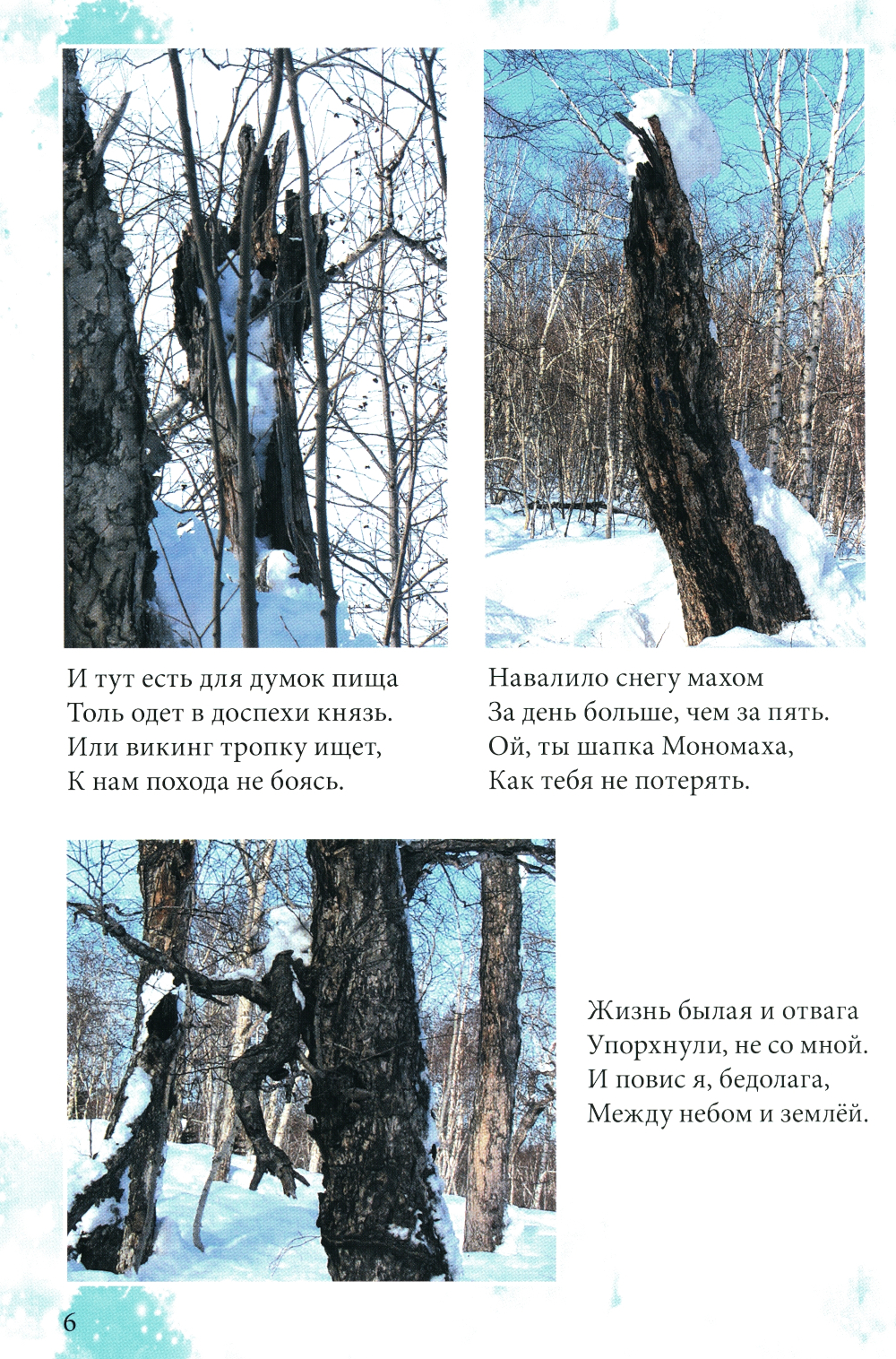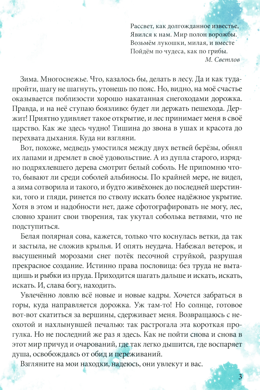 Зима. Многоснежье. Что, казалось бы, делать в лесу. Да и как туда-пройти, шагу не шагнуть, утонешь по пояс. Но, видно, на моё счастье оказывается поблизости хорошо накатанная снегоходами дорожка. Правда, и на неё ступаю боязливо: будет ли держать пешехода. Держит! Приятно удивляет такое открытие, и лес принимает меня в своё царство. Как же здесь чудно! Тишина до звона в ушах и красота до перехвата дыхания. Куда ни взгляни.| Издательство | Новая книга |