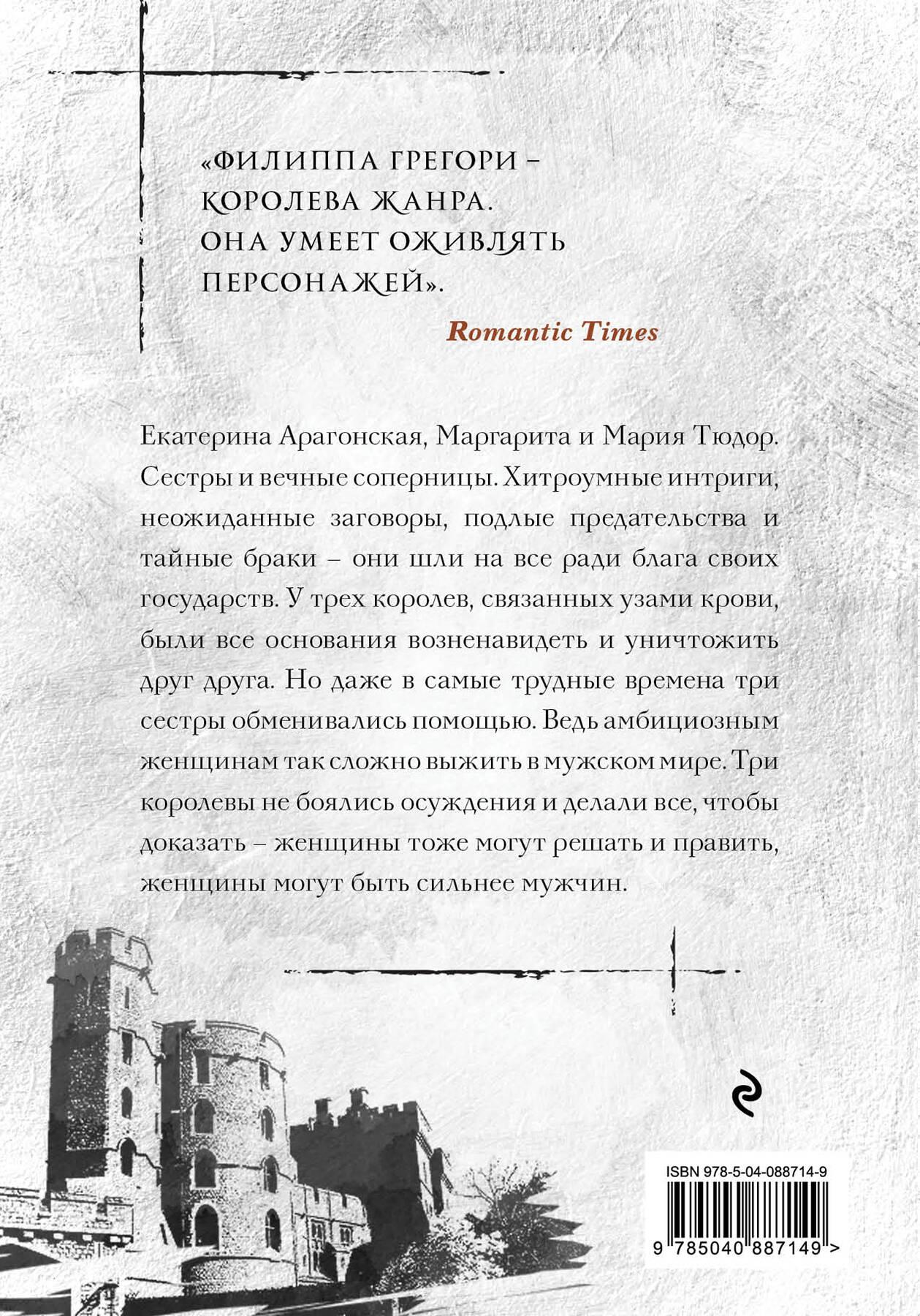 Книги Филиппы Грегори известны во всем мире. Профессиональный историк, она прекрасно знает исторические реалии, которые описывает, и умеет находить в истории королей и принцесс то, что заинтересует современного читателя. В основе книги «ДОЧЬ КАРДИНАЛА» - бестселлере № 1 по версии New York Time - захватывающая история Анны Невилл, ее сестры Изабель и хитросплетенные судьбы придворных. История Анны освещается в сериале BBC и Starz «Белая королева» (2013). Анну играет Фэй Марсей, Изабель - Элеонор Томлинсон, Уорика - Джеймс Фрейн, Ричарда, герцога Глостерского - Анайрин Барнард. А фильм «Еще одна из рода Болейн» со Скарлетт Йоханссон и Натали Портман в главных ролях стал мировой киносенсацией. Быть дочерью деспота очень нелегко. Анна Невилл знала об этом не понаслышке. Ее отец, Ричард, - именно такой человек. Настоящий серый кардинал, он контролирует двор и короля - что уж говорить о собственных детях. Анна Невилл с детства знала, что ее желания ничего не значат - отец все равно заставит поступить так, как ему надо. Но любому терпению рано или поздно приходит конец. Дочерям Невилла, Анне и Изабелле, надоело быть пешками в страшной кровавой игре за престол. Игре, в которой люди - разменные монеты и никому нельзя верить. «Увлекательный роман о придворных интригах, мести и суеверии». - Library Journal «ТРИ СЕСТРЫ, ТРИ КОРОЛЕВЫ» - уникальный исторический роман о политических браках и придворных тайнах на заре XVI века. Екатерина Арагонская, Маргарита и Мария Тюдор. Сестры и вечные соперницы. Хитроумные интриги, неожиданные заговоры, подлые предательства и тайные браки - они шли на все ради блага своих государств. У трех королев, связанных узами крови, были все основания возненавидеть и уничтожить друг друга. Но даже в самые трудные времена три сестры обменивались помощью. Ведь амбициозным женщинам так сложно выжить в мужском мире. Три королевы не боялись осуждения и делали всё, чтобы доказать - женщины тоже могут решать и править, женщины могут быть сильнее мужчин. «Филиппа Грегори - королева жанра. Она умеет оживлять персонажей». - Romantic Times| Издательство | Эксмо |