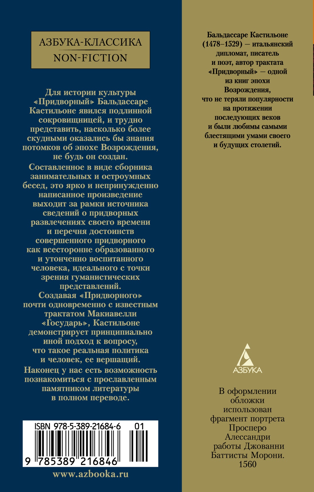 Сочинение итальянского дипломата, писателя и поэта Бальдассаре Кастильоне (1478-1529) «Придворный», соединяющее воспоминания о придворной жизни герцогства Урбино в начале XVI века с размышлениями о морали, предназначении, стиле поведения дворянина, приближенного к государю, - одна из тех книг эпохи Возрождения, что не теряли популярности на протяжении последующих веков и были любимы самыми блестящими умами своего и будущих столетий. Для истории культуры труд Кастильоне явился подлинной сокровищницей, и трудно представить, насколько более скудными оказались бы знания потомков об эпохе Возрождения, не будь он создан. Составленное в виде сборника занимательных и остроумных бесед, это ярко и непринужденно написанное произведение выходит за рамки источника сведений о придворных развлечениях своего времени и перечня достоинств совершенного придворного как всесторонне образованного и утончённо воспитанного человека, идеального с точки зрения гуманистических представлений. Создавая «Придворного» почти одновременно с известным трактатом Макиавелли «Государь», Кастильоне демонстрирует принципиально иной подход к вопросу, что такое реальная политика и человек, ее вершащий. Как ни удивительно, за почти пятисотлетнюю историю этой знаменитой книги не было осуществлено ни одного полного ее перевода на русский язык, были опубликованы лишь отдельные фрагменты. И вот наконец у нас есть возможность познакомиться с прославленным памятником литературы в полном переводе.| Издательство | Азбука |