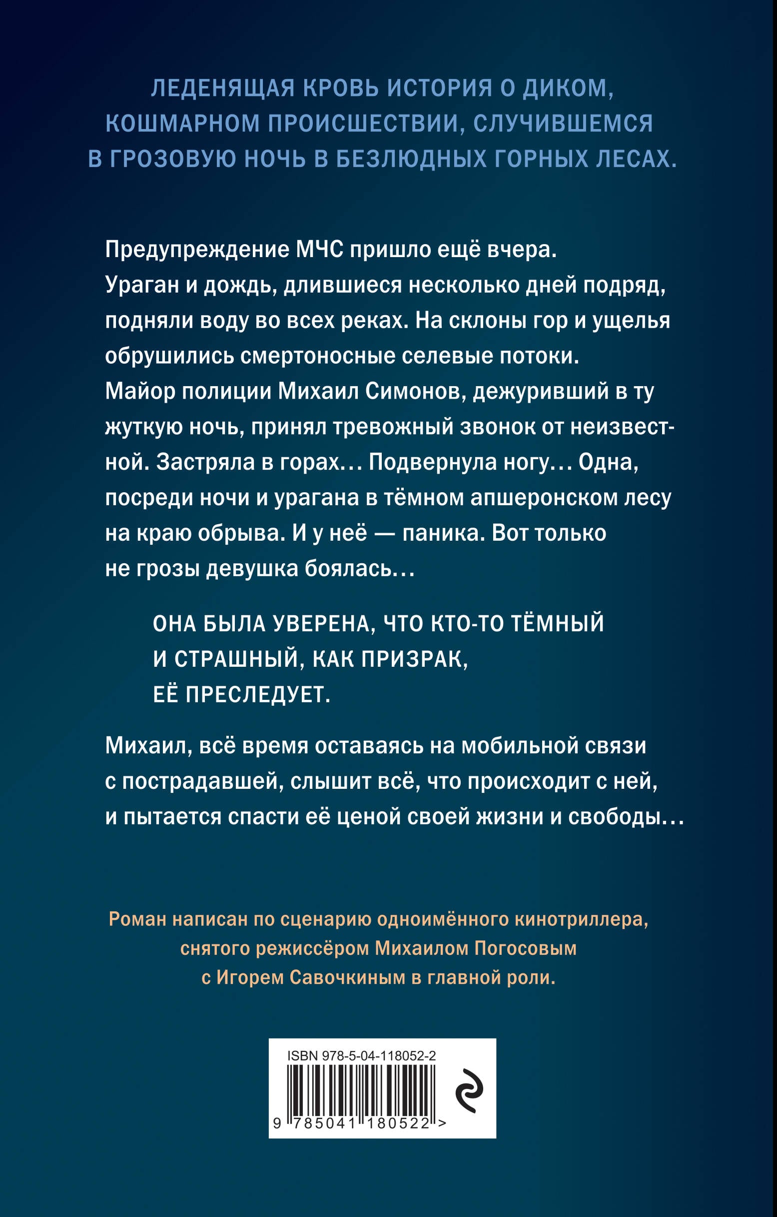 Леденящая кровь история о диком, кошмарном происшествии, случившемся в грозовую ночь в безлюдных горных лесах. Предупреждение МЧС пришло еще вчера. Ураган и дождь, длившиеся несколько дней подряд, подняли воду во всех реках. На склоны гор и ущелья обрушились смертоносные селевые потоки. Майор полиции Михаил Симонов, дежуривший в ту жуткую, ночь, принял тревожный звонок от неизвестной. Застряла в горах… Подвернула ногу… Одна, посреди ночи и урагана в темном апшеронском лесу на краю обрыва. И у нее - паника. Вот только не грозы девушка боялась… Она была уверена, что кто-то темный и страшный, как призрак, ее преследует. Михаил, все время оставаясь на мобильной связи с пострадавшей, слышит всё, что происходит с ней, и пытается спасти ее ценой своей жизни и свободы… Роман написан по сценарию одноименного кинотриллера.| Издательство | ООО "Издательство "Эксмо" |