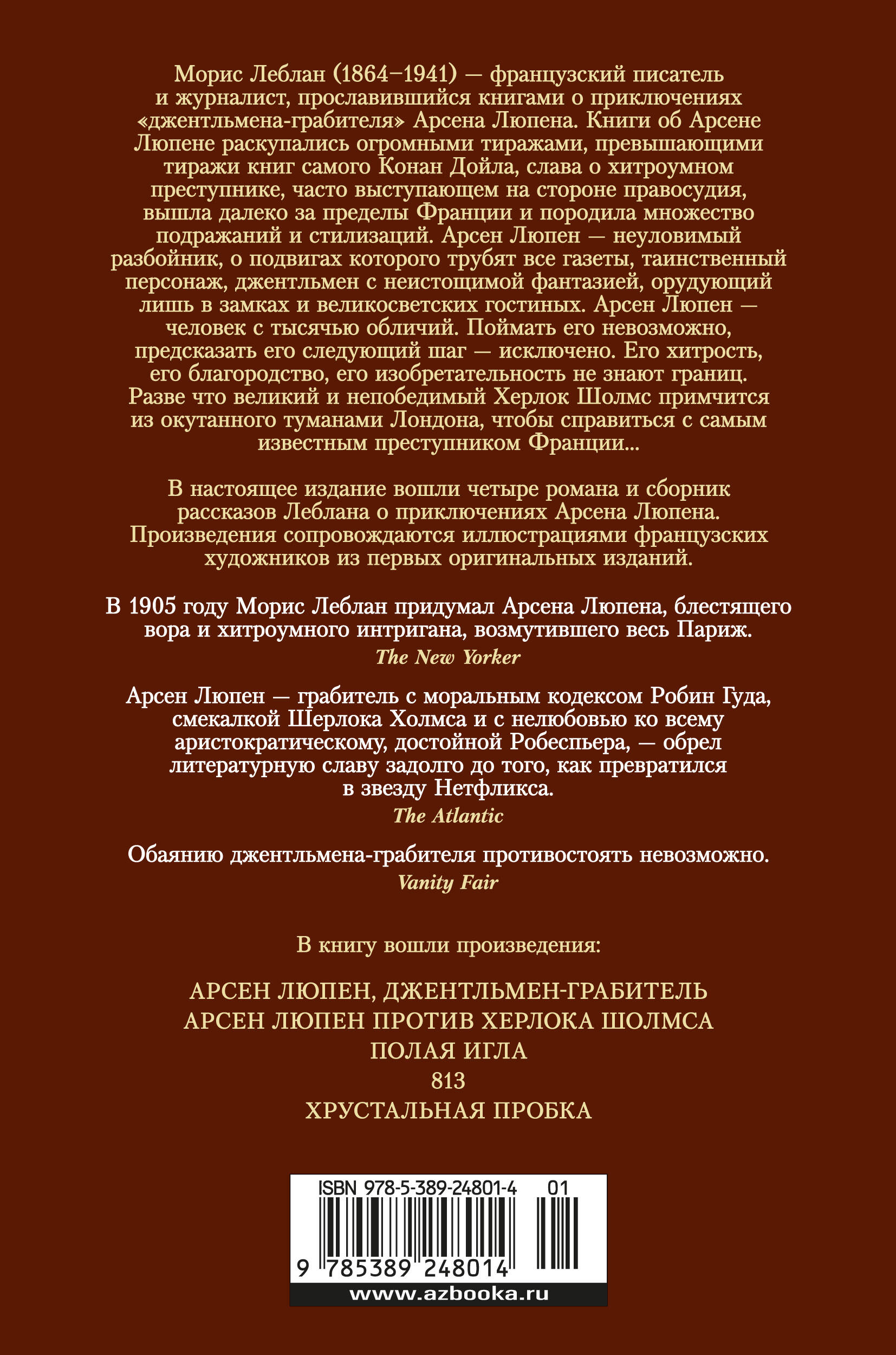 Книги французского писателя Мориса Леблана о приключениях Арсена Люпена раскупались при жизни автора огромными тиражами, превышающими тиражи книг самого Конан Дойла. Кто же такой этот Арсен Люпен? Арсен Люпен - неуловимый грабитель, о подвигах которого трубят все газеты, таинственный персонаж, джентльмен с неистощимой фантазией, орудующий лишь в замках и великосветских гостиных. Арсен Люпен - человек с тысячью обличий. Поймать его невозможно, предсказать его следующий шаг - исключено. Его хитрость, его благородство, его изобретательность не знают границ. Разве что великий и непобедимый Херлок Шолмс примчится из окутанного туманами Лондона, чтобы справиться с самым известным преступником Франции… В настоящее издание вошли четыре романа и сборник рассказов Леблана о приключениях Арсена Люпена. Произведения сопровождаются иллюстрациями французских художников из первых оригинальных изданий.| Издательство | Издательство АЗБУКА ООО |