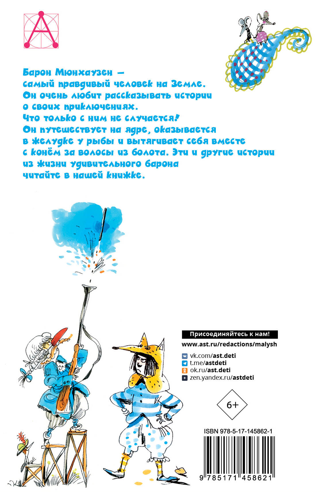 Барон Мюнхаузен существовал на самом деле и даже служил в русской армии! Он очень любил рассказывать истории из своей жизни. Рудольф Эрих Распе их услышал и записал. Так появилась на свет книга "Приключения барона Мюнхаузена". С тех пор самого правдивого на свете барона знают во всём мире. По удивительным рассказам снимают фильмы и выпускают мультфильмы. В нашем издании истории барона Мюнхаузена даны в пересказе К. И. Чуковского и с рисунками Е. Двоскиной. Для младшего школьного возраста.| Издательство | ИЗДАТЕЛЬСТВО "АСТ" |