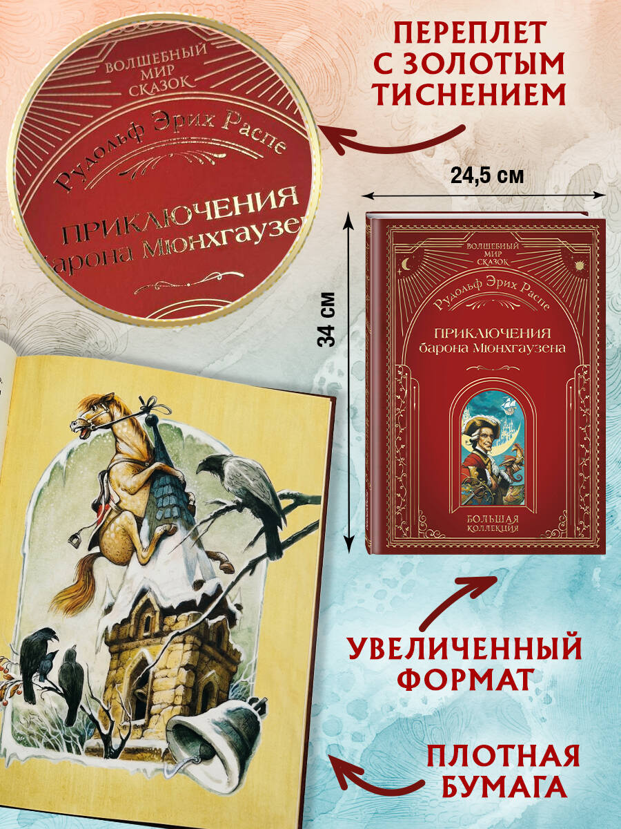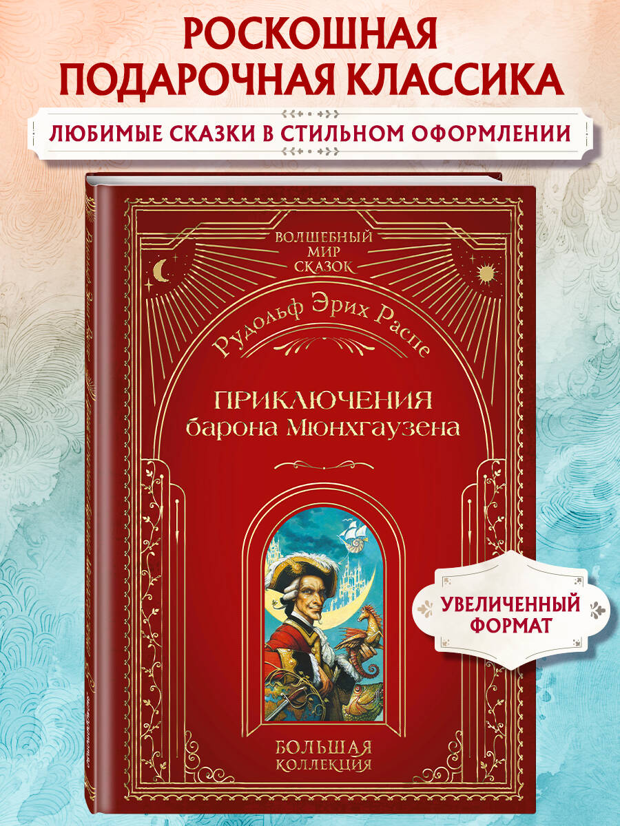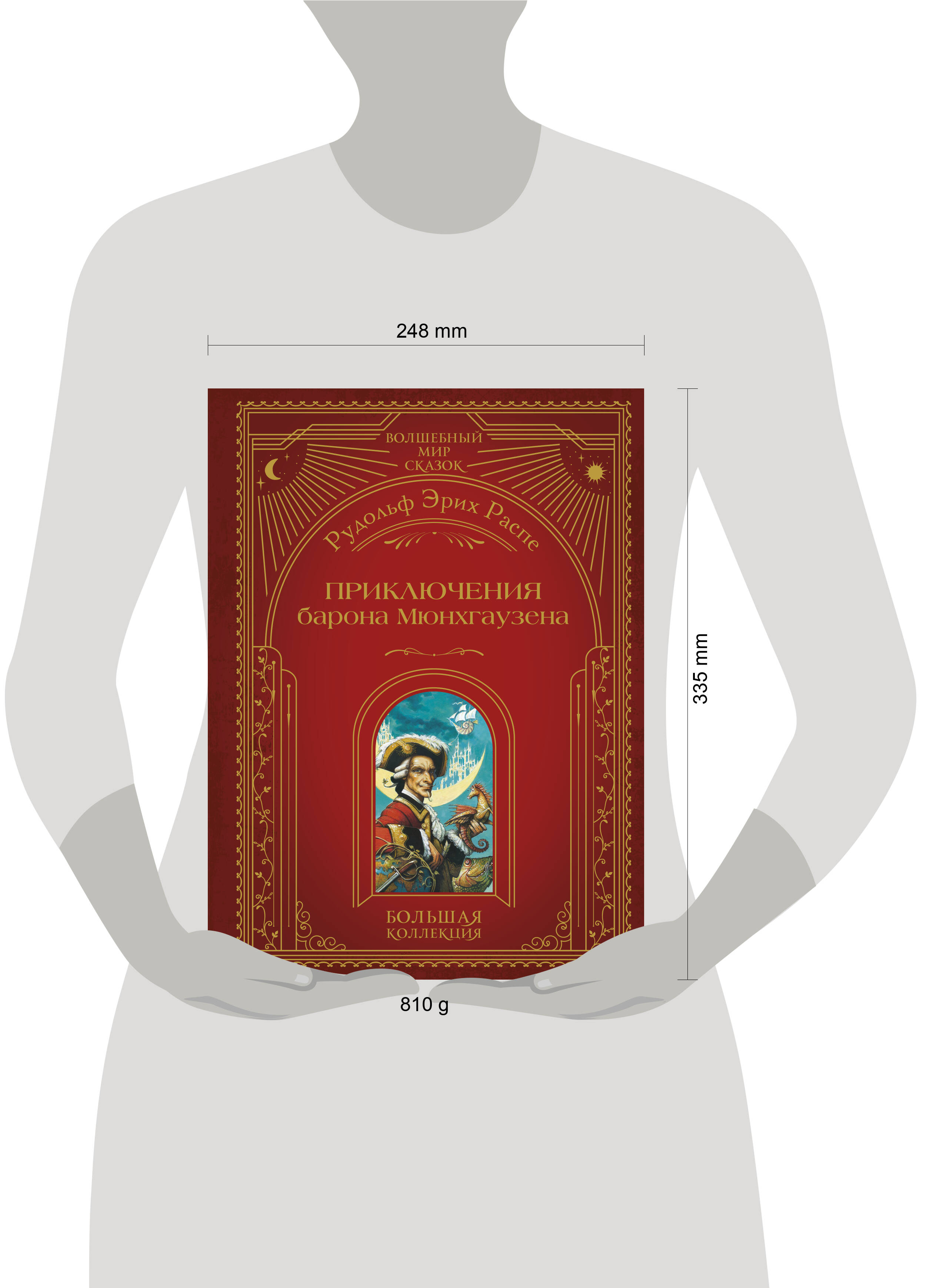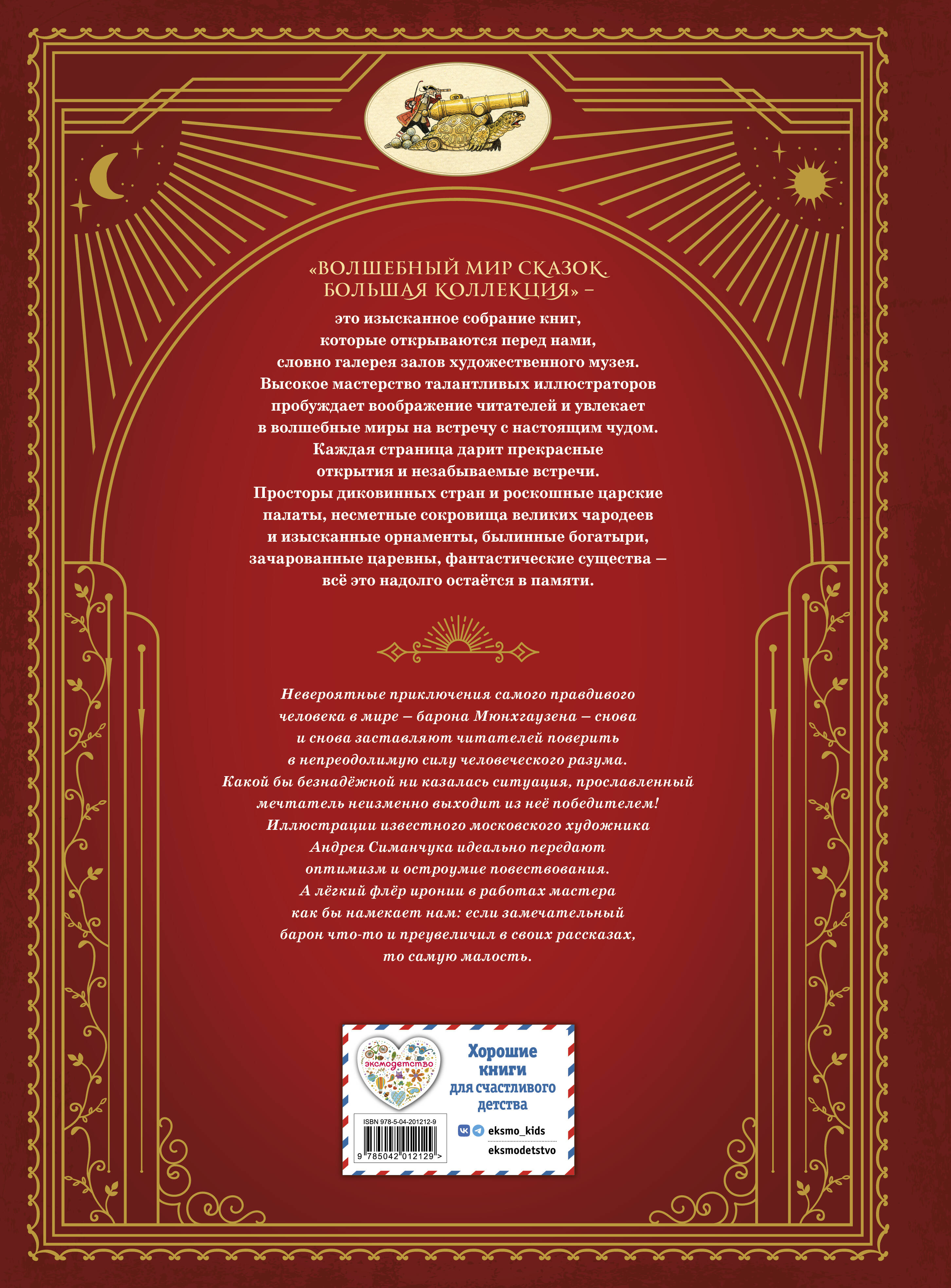 «Волшебный мир сказок. Большая коллекция» - это изысканное собрание книг, которые открываются перед нами, словно галерея залов художественного музея. Высокое мастерство талантливых иллюстраторов пробуждает воображение читателей и увлекает в волшебные миры на встречу с настоящим чудом. Каждая страница дарит прекрасные открытия и незабываемые встречи. Просторы диковинных стран и роскошные царские палаты, несметные сокровища великих чародеев и изысканные орнаменты, былинные богатыри, зачарованные царевны, фантастические существа - всё это надолго остаётся в памяти. Невероятные приключения самого правдивого человека в мире - барона Мюнхгаузена - снова и снова заставляют читателей поверить в непреодолимую силу человеческого разума. Какой бы безнадёжной ни казалась ситуация, прославленный мечтатель неизменно выходит из неё победителем! Иллюстрации известного московского художника Андрея Симанчука идеально передают оптимизм и остроумие повествования. А лёгкий флёр иронии в работах мастера как бы намекает нам: если замечательный барон что-то и преувеличил в своих рассказах, то самую малость.| Издательство | ООО "Издательство "Эксмо" |