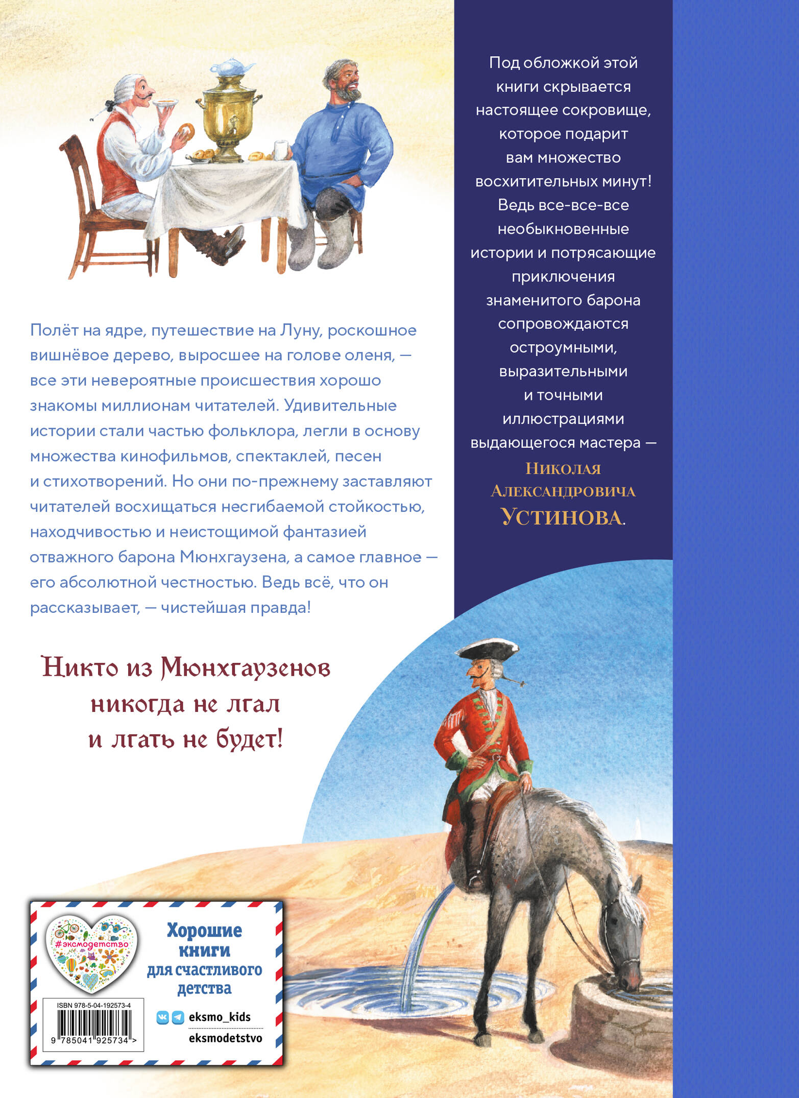 Издание в твёрдом переплёте с частичным лаком. Плотная белая бумага. Чёткий, удобный для чтения шрифт. Полноцветные иллюстрации. Первый перевод этой книги на русский язык, сделанный в 1791 году, назывался «Не любо - не слушай, а врать не мешай». Но если бы барон Карл Фридрих Иероним фон Мюнхгаузен об этом узнал, он наверняка вызвал бы переводчика на дуэль. Ведь всем на свете известно, что никто из Мюнхгаузенов никогда не врал и врать не будет! И какими бы невероятными ни выглядели приключения барона, рассказ о каждом из них - чистейшая правда. Более того, и сам Мюнхгаузен - историческая личность, отважный воин, сражавшийся в русской императорской армии под командованием фельдмаршала Миниха. Только такой герой и мог прокатиться на пушечном ядре, побывать на Луне, проскакать в захваченный врагами город на половине лошади и легко вытащить самого себя из болота за волосы! Как, вы всё ещё не верите? Тогда читайте самые правдивые на свете воспоминания барона Мюнхгаузена и рассматривайте восхитительные иллюстрации выдающегося иллюстратора, народного художника России Николая Устинова - и у вас не останется и тени сомнений!| Издательство | ООО "Издательство "Эксмо" |
