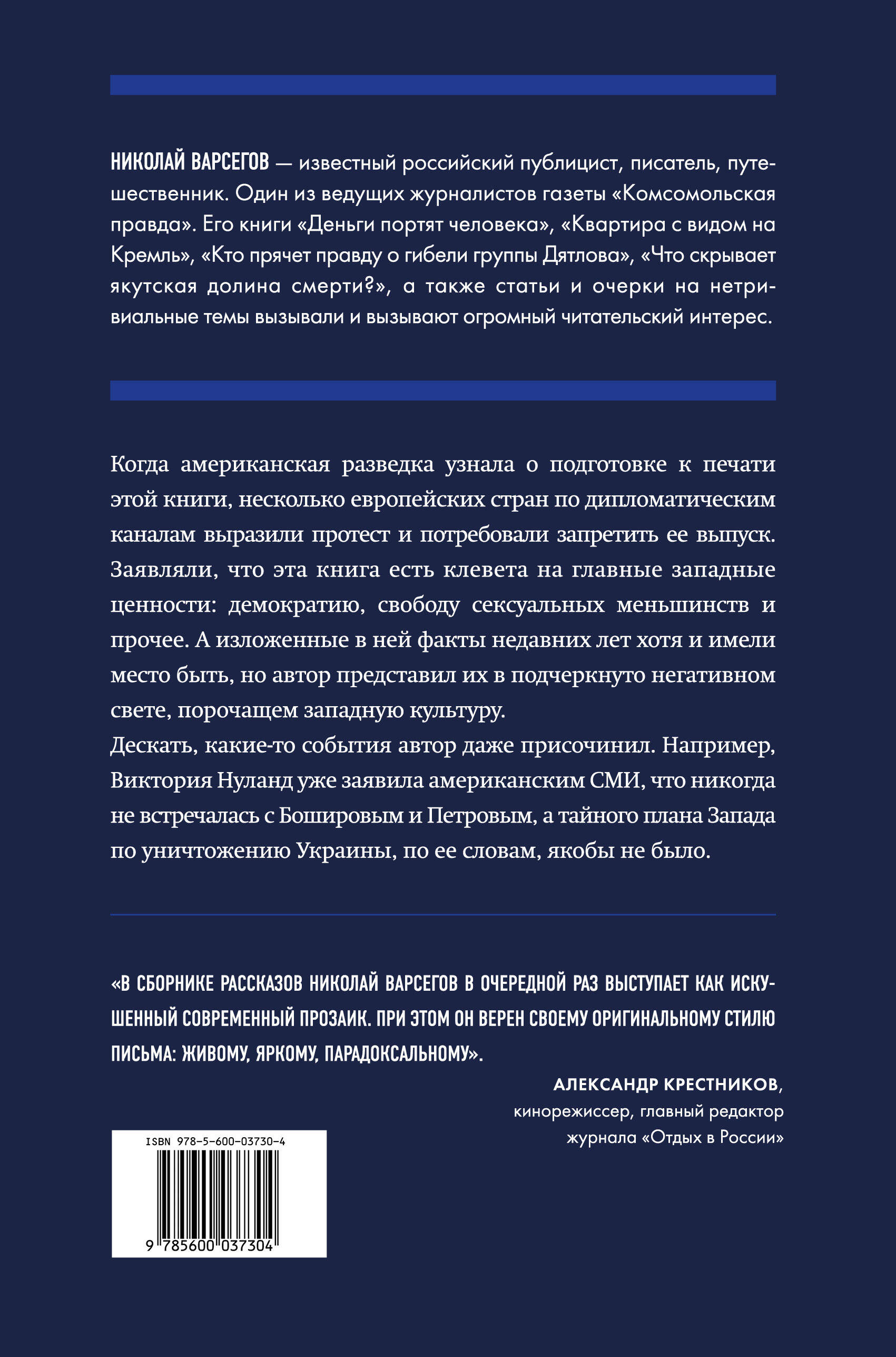 Когда американская разведка узнала о подготовке к печати этой книги, несколько европейских стран по дипломатическим каналам выразили протест и потребовали запретить ее выпуск. Заявляли, что эта книга - есть клевета на главные западные ценности: демократию, свободу сексуальных меньшинств и прочее. А изложенные в ней факты недавних лет, хотя и имели место быть, но автор представил их в подчеркнуто негативном цвете, порочащем западную культуру, Дескать, какие-то события автор даже присочинил. Например, Виктория Нуланд уже заявила американским СМИ, что никогда не встречалась с Бошировым и Петровым, а тайного плана Запада по уничтожению Украины, по ее словам, якобы не было. Николай Варсегов - известный российский публицист, писатель, путешественник. Один из ведущих журналистов газеты «Комсомольская правда». Его книги «Деньги портят человека», «Квартира с видом на Кремль», «Кто прячет правду о гибели группы Дятлова», «Что скрывает якутская долина смерти?», а также статьи и очерки на нетривиальные темы вызывали и вызывают огромный читательский интерес. «В сборнике рассказов Николай Варсегов в очередной раз выступает как искушенный современный прозаик. При этом он верен своему оригинальному стилю письма: живому, яркому, парадоксальному». - Александр Крестников, кинорежиссер, главный редактор журнала «Отдых в России»| Издательство | ООО "Издательство "Эксмо" |