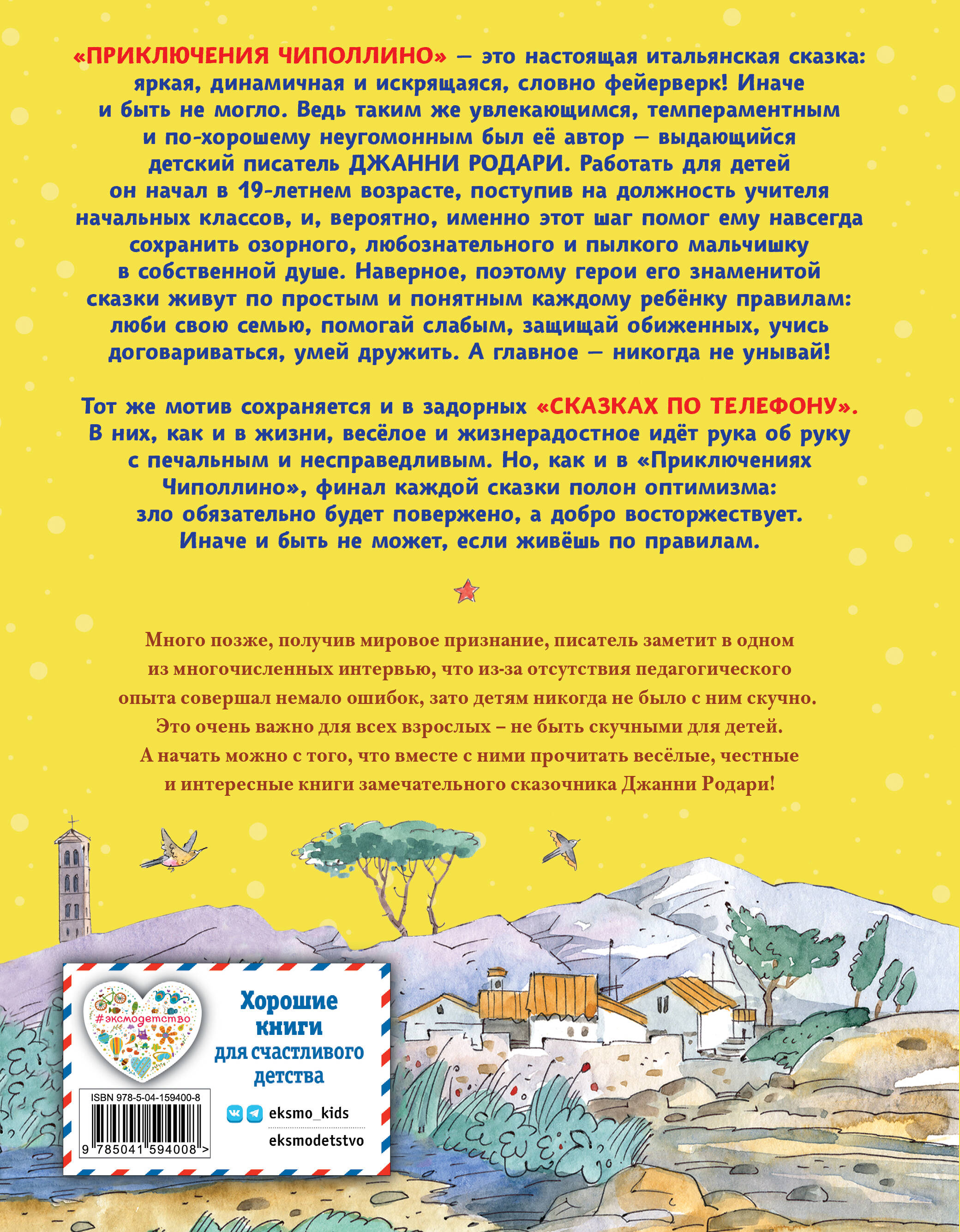 Добрые и весёлые книги замечательного итальянского писателя Джанни Родари сначала обрели популярность на русском языке и только потом прославились на родине, а затем и во всём мире. Джанни Родари был признан лучшим писателем Италии, а спустя три года получил высшую награду в детской литературе - премию Ганса Христиана Андерсена. ЛЮБИМЫЙ ГЕРОЙ Самым любимым героем маленьких читателей стал неунывающий, справедливый и отважный мальчик-луковка - Чиполлино. Его невероятные приключения вдохновили известного современного художника Вадима Челака на создание ярких, выразительных иллюстраций, которые с удовольствием рассматривают дети и взрослые. СКАЗКИ ПО ТЕЛЕФОНУ Герои десяти историй из знаменитого цикла «Сказки по телефону» - такие же, как Чиполлино, честные, трудолюбивые и остроумные. Ох, и достаётся же от них бездельникам и обманщикам! Вдоволь посмеяться и порадоваться победе добра помогают забавные иллюстрации Андрея Крысова. Красочная обложка с частичным лаком, удобный формат, плотная белая бумага, чёткий шрифт.| Издательство | Эксмо |