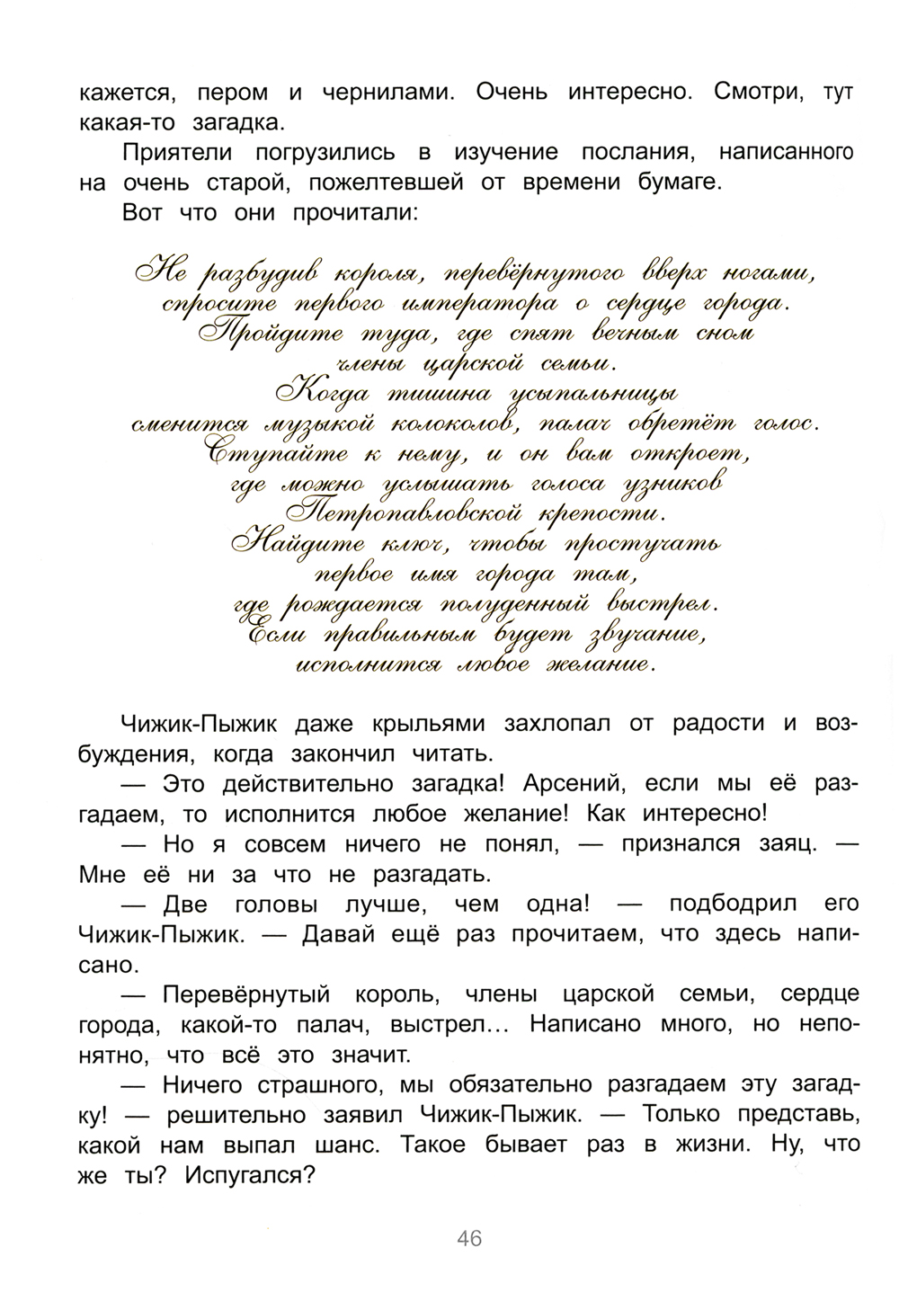 Неутомимый и любознательный Чижик-Пыжик приглашает вас в путешествие по Санкт-Петербургу. Вместе с ним вы познакомитесь с Петербургским Ангелом и другими хранителями города, прогуляетесь по Петропавловской крепости и раскроете загадку древнего манускрипта, среди тенистых аллей Летнего сада встретитесь с Иваном Андреевичем Крыловым и героями его басен, а также поучаствуете в настоящем детективном расследовании. И это только часть секретов Северной столицы, которые вам предстоит раскрыть на страницах этой книги. Книга предназначена для семейного и самостоятельного чтения детям 9-12 лет.| Издательство | Антология |