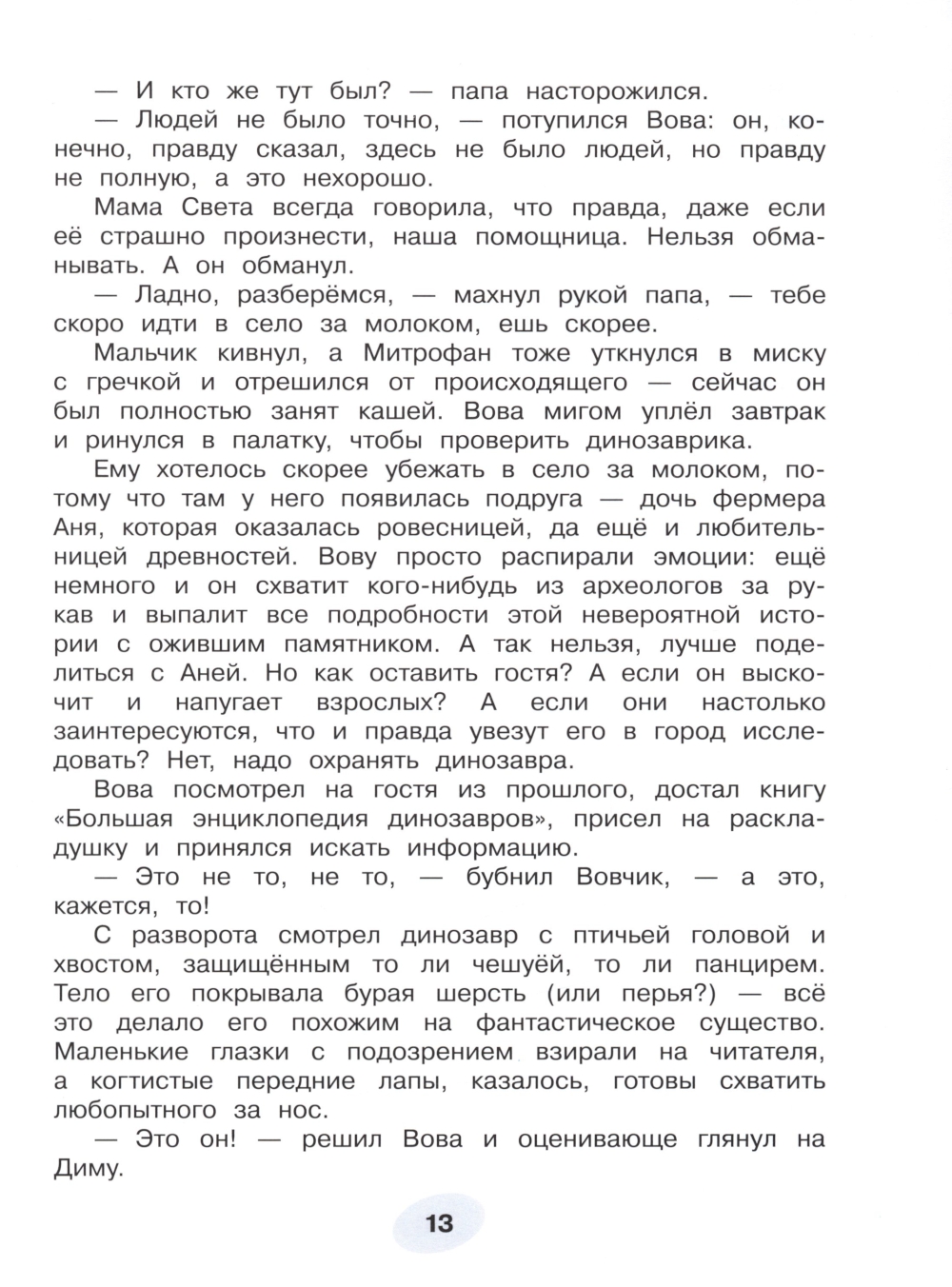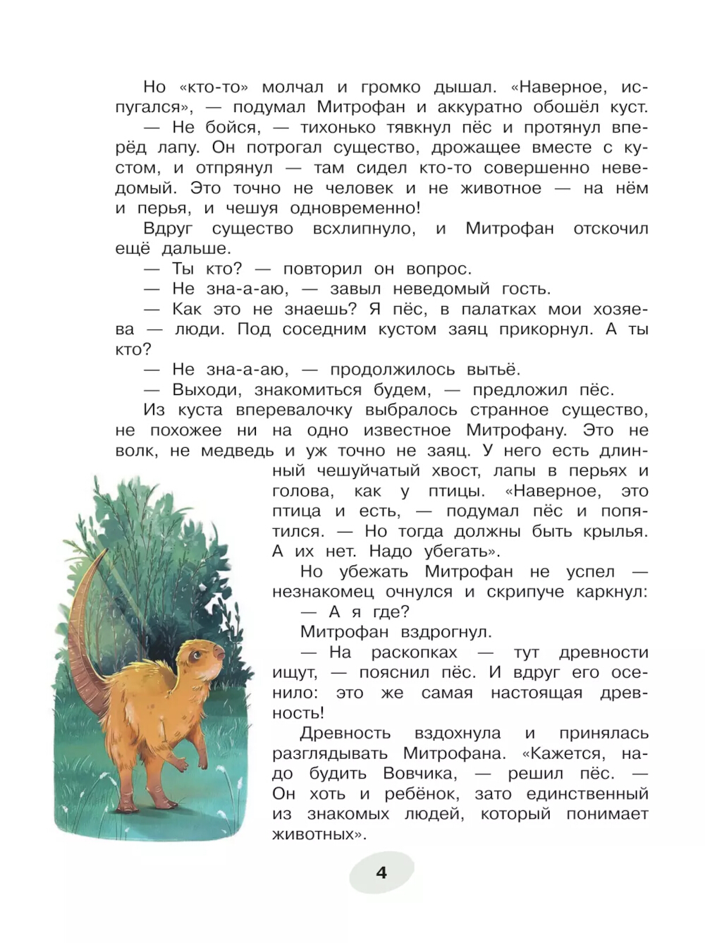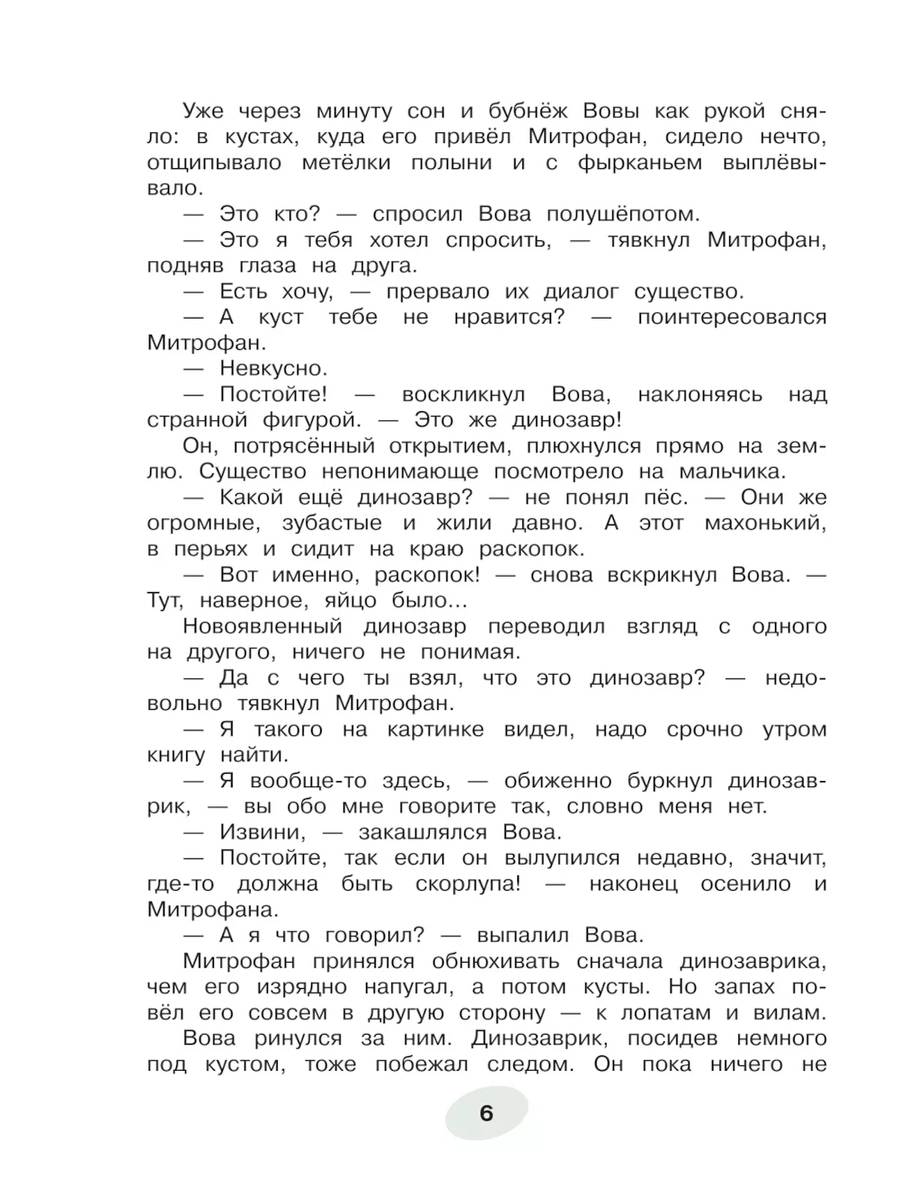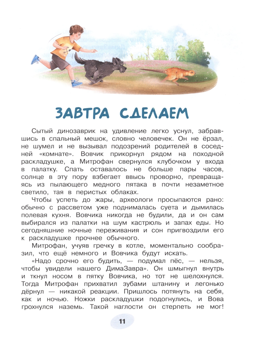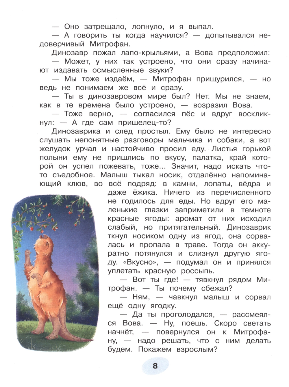 Однажды ночью в кустах полыни пёс Митрофан обнаружил существо, не похожее ни на одного из тех, что он знал. Вместе с другом Вовой, юным археологом, они выяснили, что это был самый настоящий динозавр. Вот так находка! Но откуда он взялся? Что с ним дальше делать? Тогда пёс и мальчик решили, что будут его воспитывать: учить чистить зубы, слушаться старших, помогать близким. Но динозаврик хотел есть ягоды, откладывать дела на завтра, убегать от Вовы с Митрофаном отправиться на поиски приключений. Получится ли у наших героев воспитать динозавра? Давайте вместе с ними понаблюдаем за тем, как растёт и обучается наш маленький ДиноЗавтрик! Книга предназначена для детей старшего дошкольного возраста. Текст книги читает взрослый.| Издательство | Просвещение |