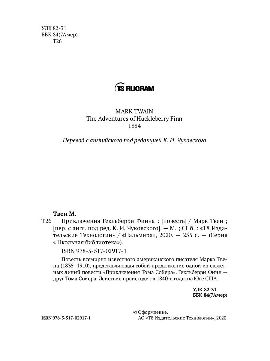 Повесть всемирно известного американского писателя Марка Твена (1835-1910), представляющая собой продолжение одной из сюжетных линий повести «Приключения Тома Сойера». Гекльберри Финн - друг Тома Сойера. Действие происходит в 1840-е годы на Юге США.| Издательство | Т8 RUGRAM |