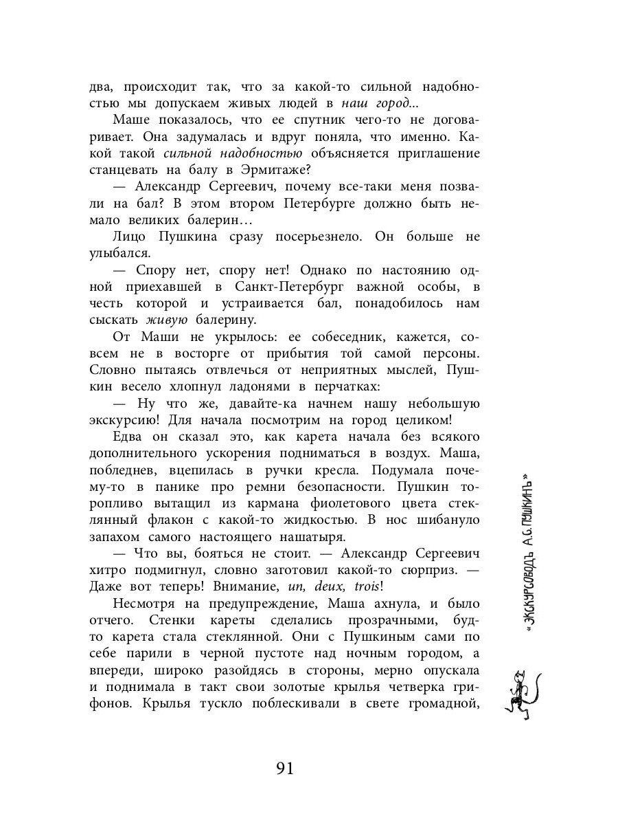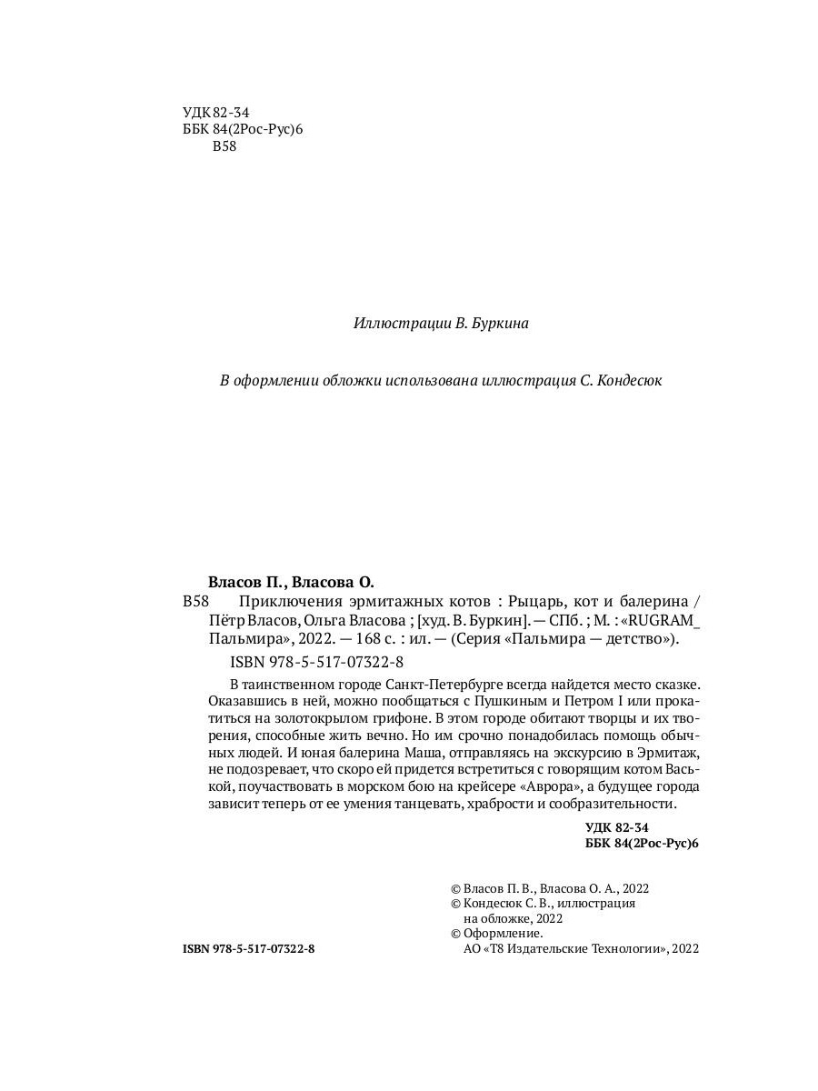В таинственном городе Санкт-Петербурге всегда найдется место сказке. Оказавшись в ней можно пообщаться с Пушкиным и Петром I или прокатиться на золотокрылом грифоне. В этом городе обитают творцы и их творения, способные жить вечно. Но им срочно понадобилась помощь обычных людей. И юная балерина Маша, отправляясь на экскурсию в Эрмитаж, не подозревает, что скоро ей придется встретиться с говорящим котом Васькой, побывать в Зимнем дворце, поучаствовать в морском бою на крейсере «Аврора», а будущее города зависит теперь от ее умения танцевать, храбрости и сообразительности.| Издательство | Т8 RUGRAM |