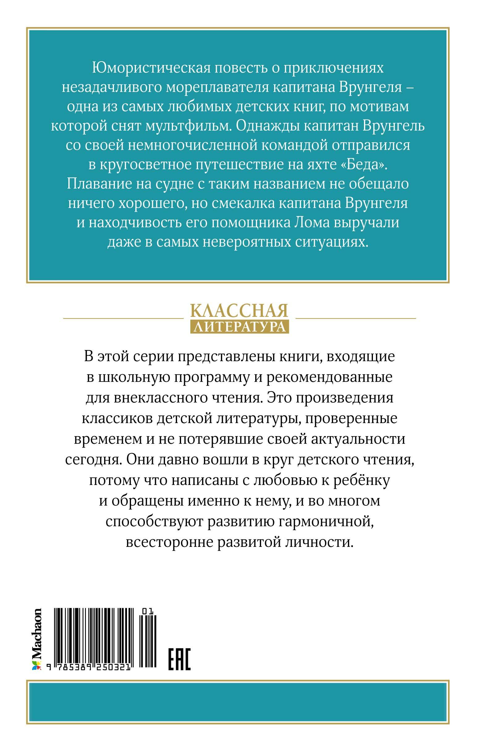 Юмористическая повесть о приключениях незадачливого мореплавателя капитана Врунгеля - одна из самых любимых детских книг, по мотивам которой снят мультфильм. Однажды капитан Врунгель со своей немногочисленной командой отправился в кругосветное путешествие на яхте "Беда". Плавание на судне с таким названием не обещало ничего хорошо, но смекалка капитана Врунгеля и находчивость его помощника Лома выручали даже в самых невероятных ситуациях.| Издательство | Азбука-Аттикус Издат.группа ООО |