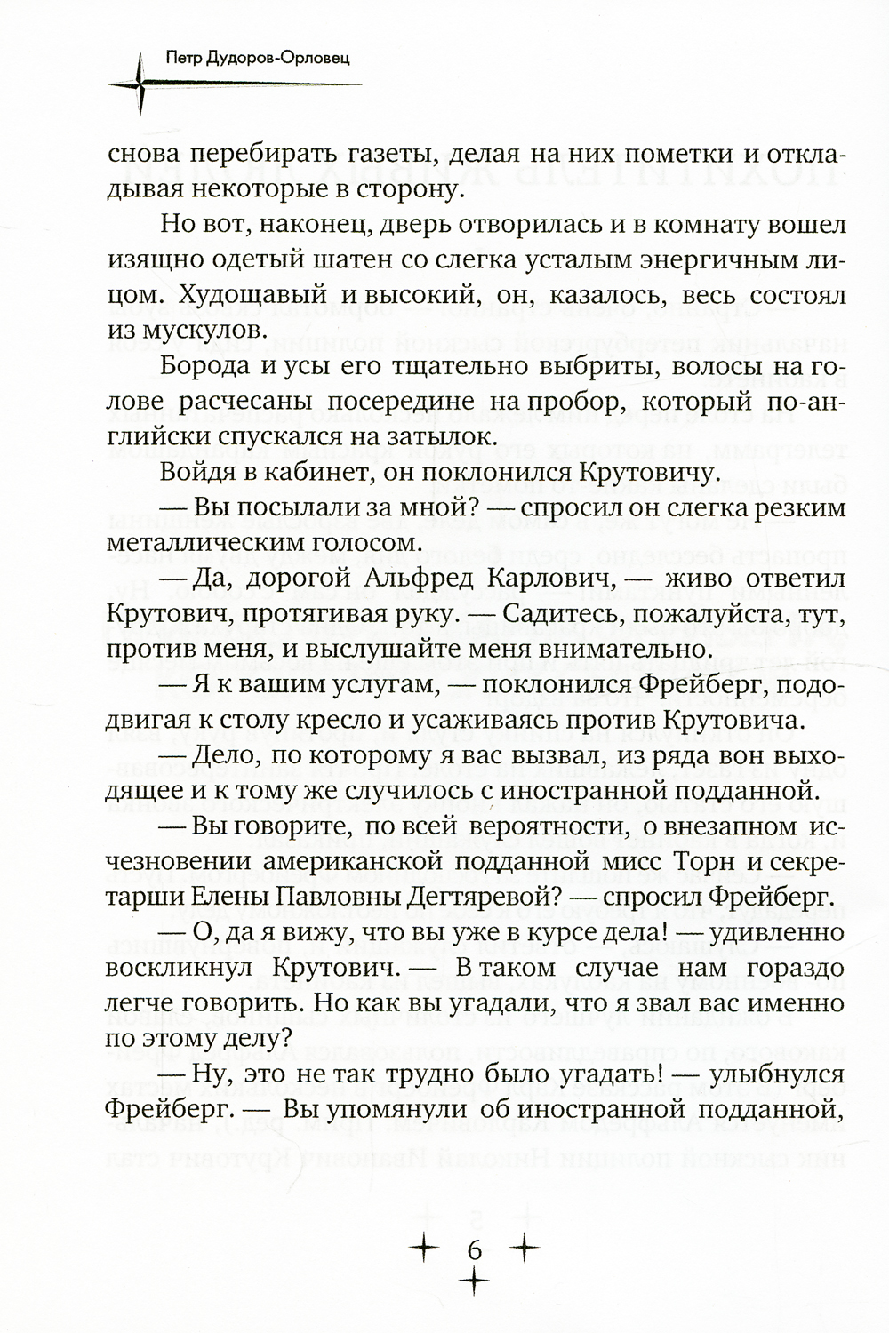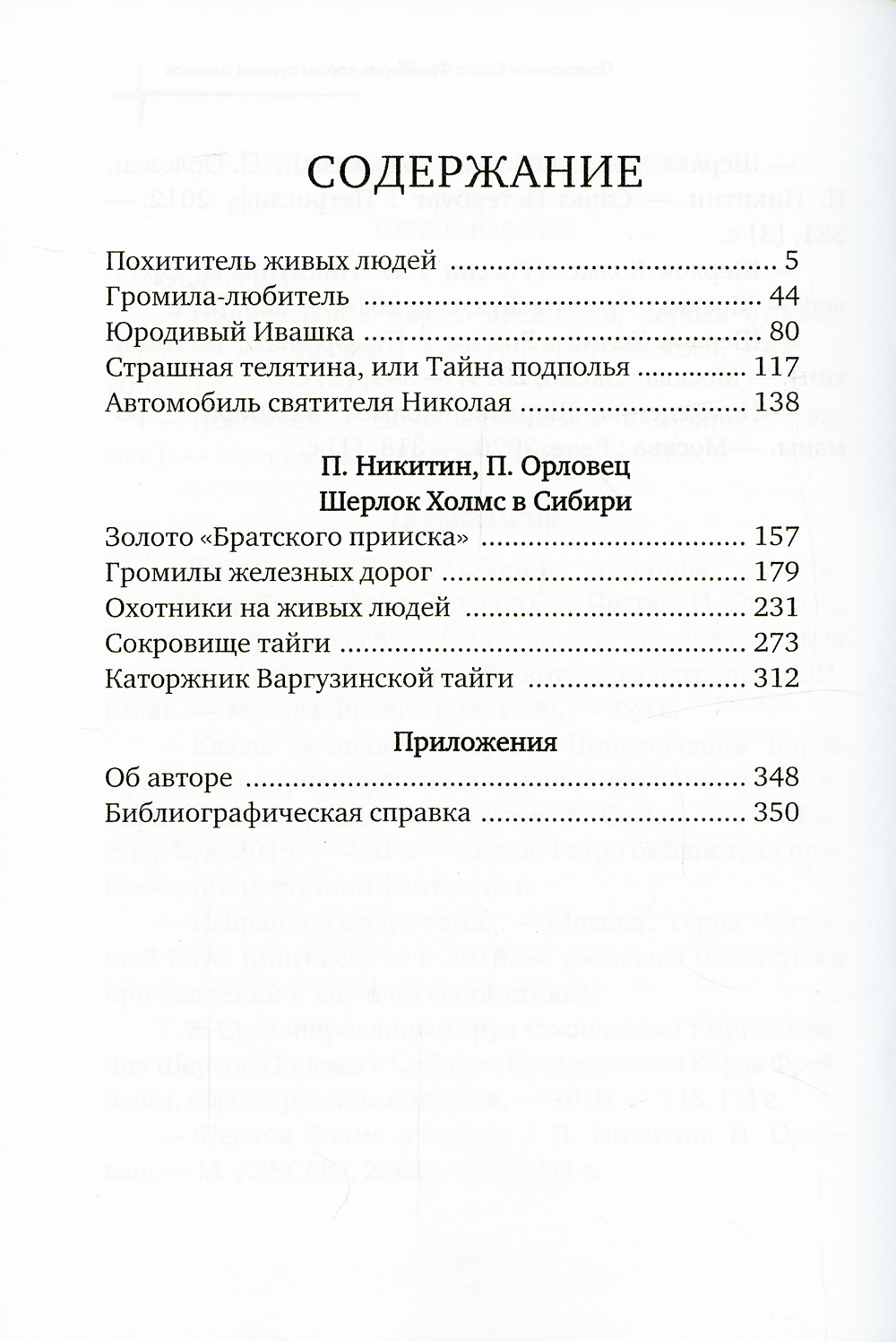 Цикл рассказов Петра Дудорова-Орловца о питерском сыщике Карле Фрейберге (в рассказе «Похитители живых людей» он имеет еще и имя Альфред). Цикл состоит из пяти произведений под названием «Приключения Карла Фрейберга, короля русских сыщиков». Рассказы интересны не только запутанной интригой, но еще и освещением тогдашних реалий и морали: женщину будут презирать, если она потеряла девственность и имела ребёнка в гражданском браке, но в то же время общество снисходительно относится к изменам (в том числе и родить ребенка от другого, солгав законному мужу). В книгу так же включен сборник Дудорва-Орловца «Шерлок Холмс» в Сибири, включающий весь цикл рассказов о приключениях Шерлока Холмса и доктора Уотсона в Сибири. Читатель познакомится с сибирской экзотикой - золотые прииски, суровые таежные дебри, зверства беглых каторжников, дикие пьяные загулы чиновных взяточников и казнокрадов.| Издательство | Т8 RUGRAM |