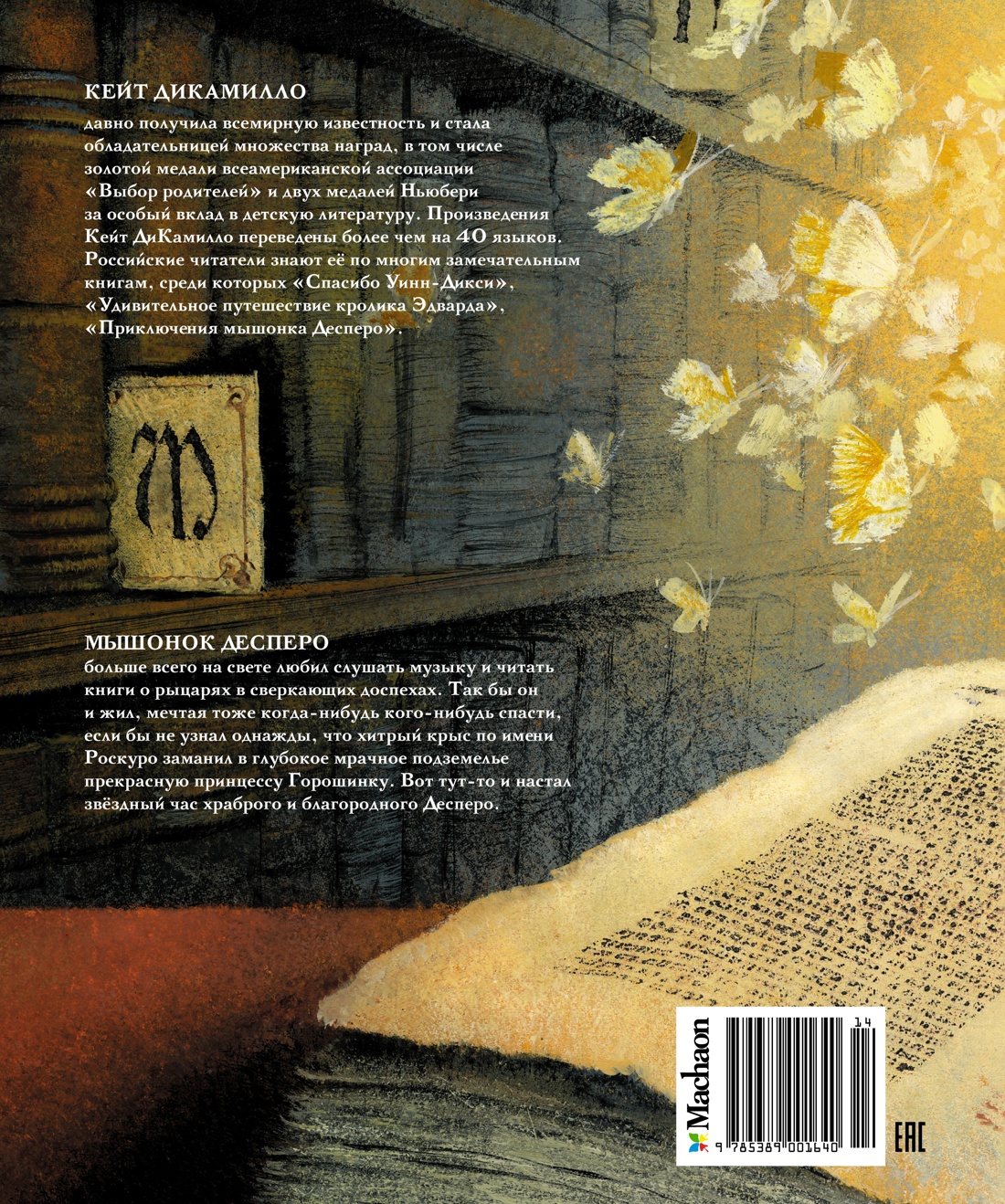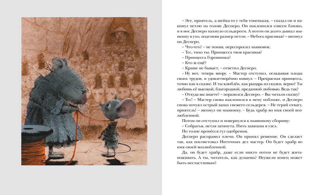 В мышином семействе, обитающем в старинном королевском замке, родился мышонок по имени Десперо. В отличие от своих сородичей он обладал храбрым и благородным сердцем, а еще любил читать и слушать музыку. Однажды он увидел принцессу Горошинку и влюбился в нее. А когда коварные крысы хитростью заманили принцессу в мрачное подземелье, Десперо, словно рыцарь в сияющих доспехах, спас ее от верной гибели. Красочные, оригинальные иллюстрации и великолепный перевод сделали эту книгу незабываемой для маленьких читателей. Экранизация замечательной книги Кейт Ди Камило триумфально прошла в декабре 2008 года. Яркий и красивый мультипликационный фильм понравился не только детям, но и их родителям. Необыкновенное очарование этот мультфильм приобрел благодаря голосам подобранным для российского зрителя. Мышонка Десперо в русской версии озвучил Егор Бероев. Для него это первый опыт работы над дубляжом мультфильма. Валентин Гафт подарил свой голос злой крысе Боттичелли. В озвучивании оригинальной версии также принимали участие Дастин Хоффман, Мэттью Бродерик, Сигурни Уивер, Эмма Уотсон и др.| Издательство | Махаон |