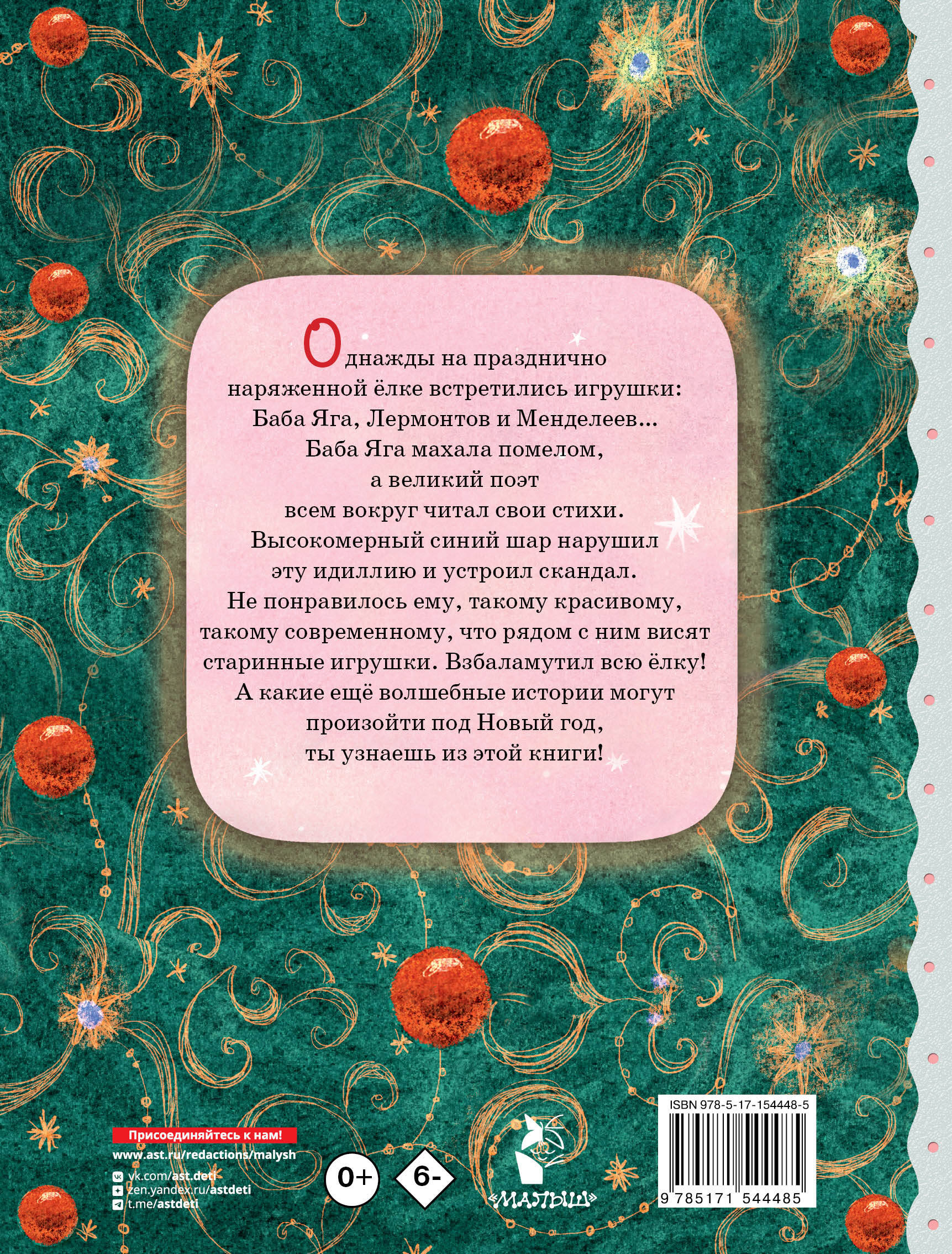Однажды на празднично наряженной ёлке встретились игрушки: Баба Яга, Лермонтов и Менделеев… Баба Яга махала помелом, а великий поэт всем вокруг читал свои стихи. Высокомерный синий шар нарушил эту идиллию и устроил скандал. Не понравилось ему, такому красивому, такому современному, что рядом с ним висят старинные игрушки. Взбаламутил всю ёлку! А какие ещё волшебные истории могут произойти под Новый год, ты узнаешь из этой книги!| Издательство | Издательство "АСТ" |