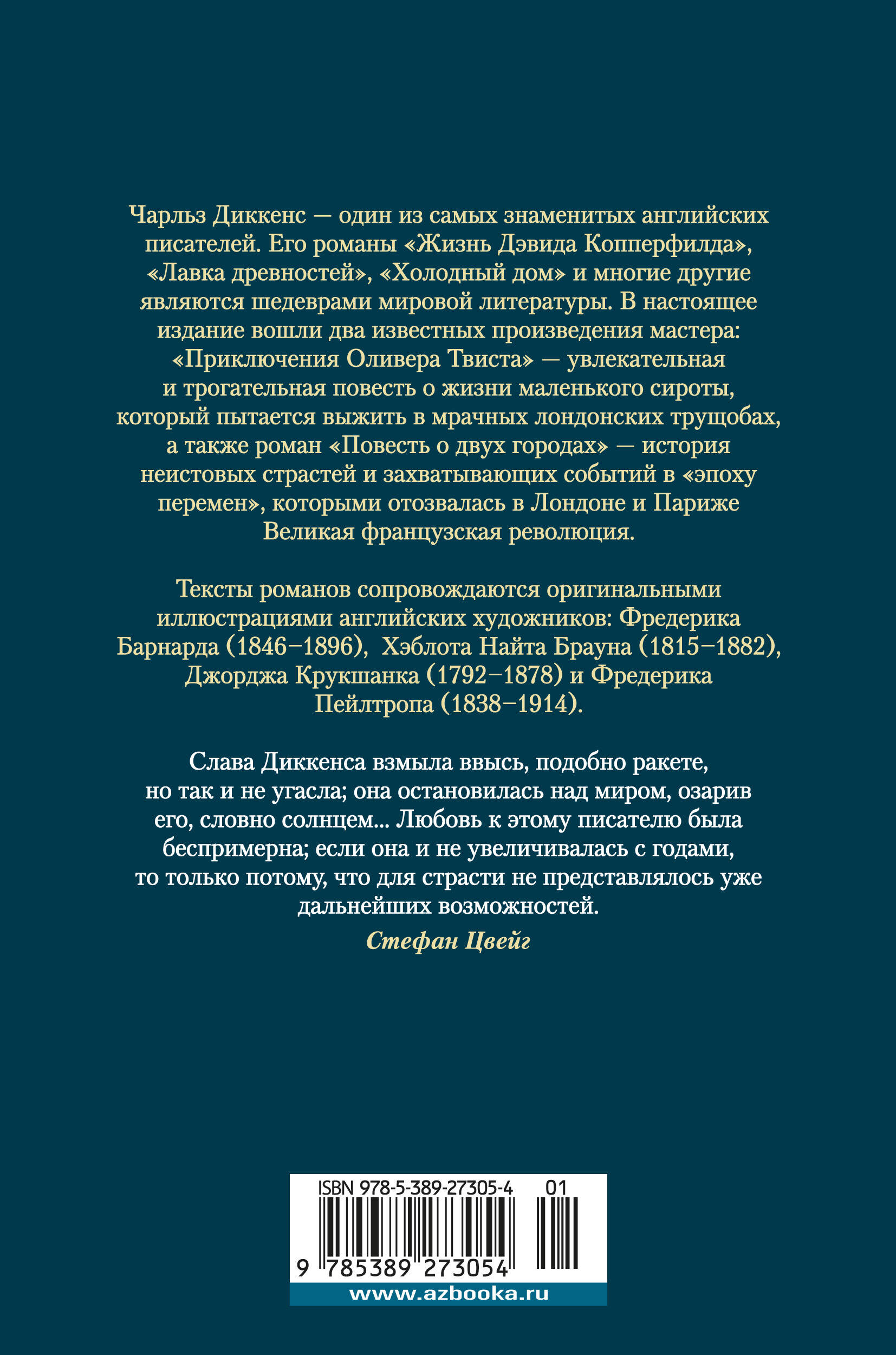 Чарльз Диккенс - один из самых знаменитых английских писателей. Его романы "Жизнь Дэвида Копперфилда", "Лавка древностей", "Холодный дом" и многие другие являются шедеврами мировой литературы. В настоящее издание вошли два известных произведения мастера: "Приключения Оливера Твиста" - увлекательная и трогательная повесть о жизни маленького сироты, который пытается выжить в мрачных лондонских трущобах, а также роман "Повесть о двух городах" - история неистовых страстей и захватывающих событий в "эпоху перемен", которыми отозвалась в Лондоне и Париже Великая французская революция. Тексты романов сопровождаются оригинальными иллюстрациями английских художников: Фредерика Барнарда (1846-1896), Хэблота Найта Брауна (1815-1882), Джорджа Крукшанка (1792-1878) и Фредерика Пейлтропа (1838-1914).| Издательство | Азбука-Аттикус Издат.группа ООО |