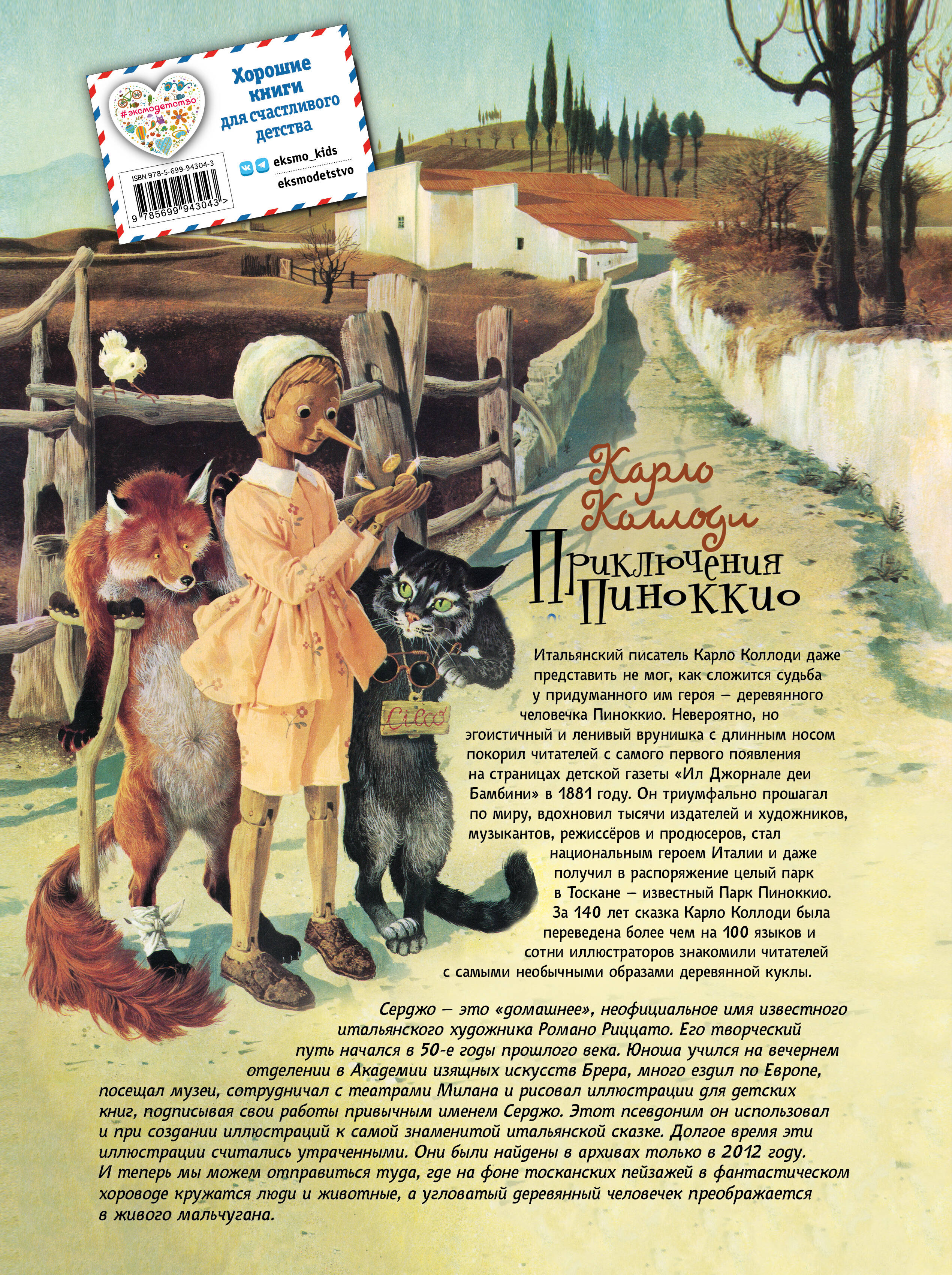 Классическая сказка Карло Коллоди «Приключения Пиноккио» считается национальным достоянием Италии, и не случайно. Ведь в окончательном варианте книга появилась только благодаря читателям. Сначала Карло Коллоди написал поучительную сказку из 15 глав о том, что бывает с непослушной куклой: Пиноккио погибал от лап разбойников. Но читатели забросали редакцию письмами, требуя продолжения, и автору пришлось придумывать новые увлекательные приключения для главного героя. «Приключения Пиноккио» входят в пятёрку самых читаемых книг, наравне с Библией, «Хрониками Нарнии» и «Маленьким принцем». Сказка переведена на 87 языков, экранизировалась более 10 раз, а иллюстрации к ней создавали самые именитые художники. Один из них - Серджо, выдающийся итальянский мастер оптического искусства. Благодаря его уникальным иллюстрациям все герои сказки кажутся живыми и самые невероятные приключения становятся реальными. Увеличенный формат, подарочное издание. Твёрдый переплёт с тиснением и частичным лаком. Плотная белая бумага. Чёткий, удобный для чтения шрифт.| Издательство | ООО "Издательство "Эксмо" |