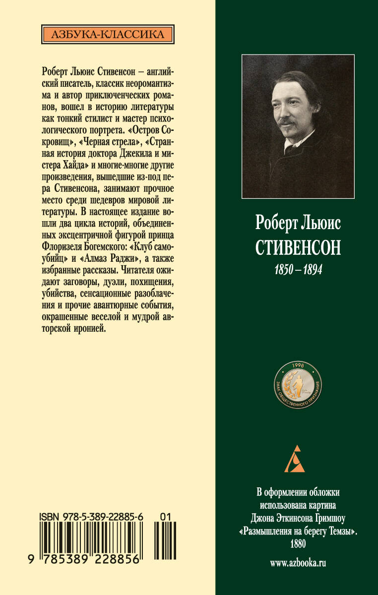 Роберт Льюис Стивенсон - английский писатель, классик неоромантизма и автор приключенческих романов, вошел в историю литературы как тонкий стилист и мастер психологического портрета. "Остров Cокровищ", "Черная стрела", "Странная история доктора Джекила и мистера Хайда" и многие-многие другие произведения, вышедшие из-под пера Стивенсона, занимают прочное место среди шедевров мировой литературы. В настоящее издание вошли два цикла историй, объединенных эксцентричной фигурой принца Флоризеля Богемского: "Клуб самоубийц" и "Алмаз Раджи", а также избранные рассказы. Читателя ожидают заговоры, дуэли, похищения, убийства, сенсационные разоблачения и прочие авантюрные события, окрашенные веселой и мудрой авторской иронией.| Издательство | Азбука-Аттикус Издат.группа ООО |