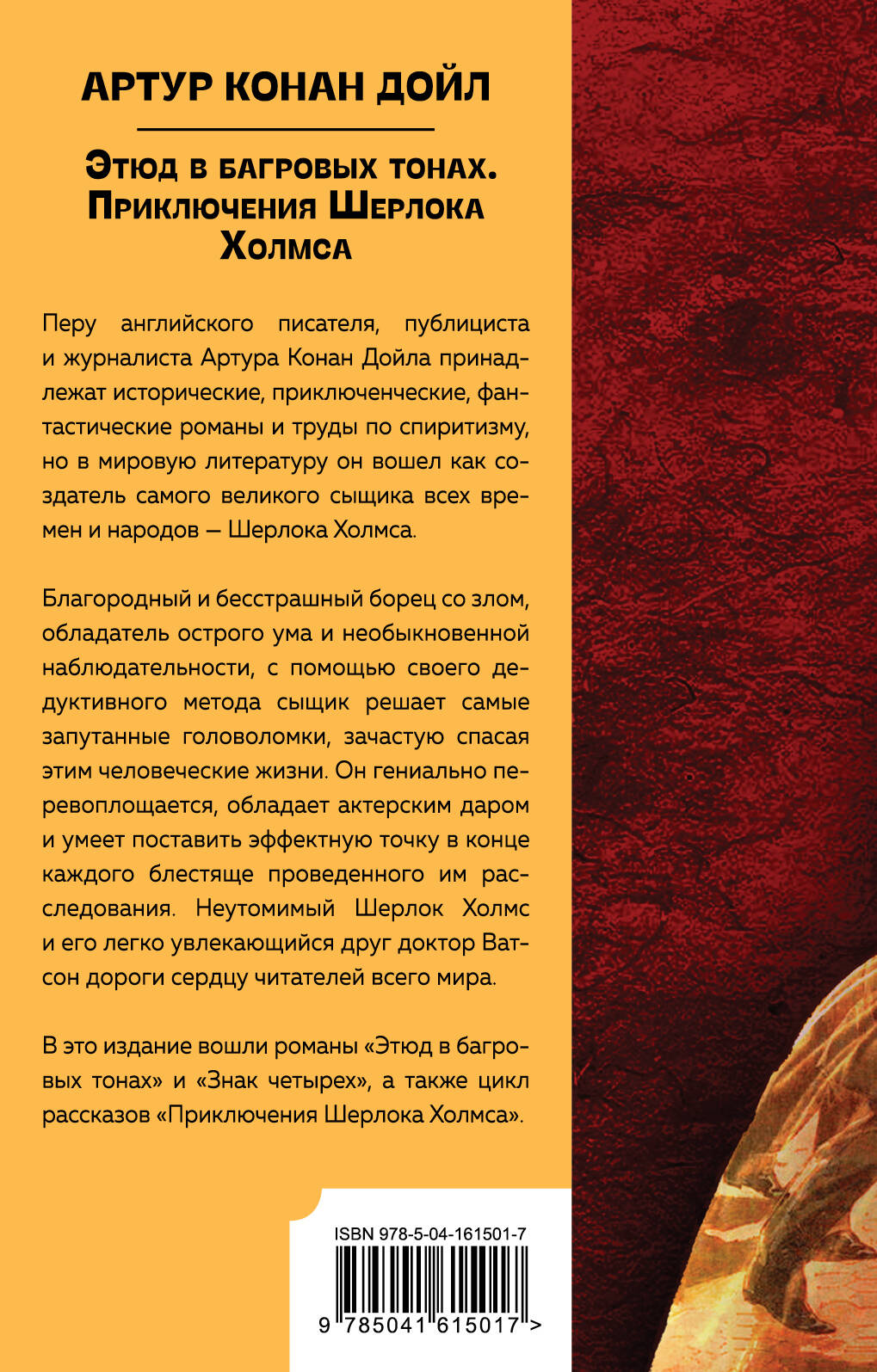 Перу английского писателя, публициста и журналиста Артура Конан Дойла принадлежат исторические, приключенческие, фантастические романы и труды по спиритизму, но в мировую литературу он вошел как создатель самого Великого Сыщика всех времен и народов - Шерлока Холмса. Благородный и бесстрашный борец со Злом, обладатель острого ума и необыкновенной наблюдательности, с помощью своего дедуктивного метода сыщик решает самые запутанные головоломки, зачастую спасая этим человеческие жизни. Он гениально перевоплощается, обладает актерским даром и умеет поставить эффектную точку в конце каждого блестяще проведенного им расследования. Неутомимый Шерлок Холмс и его легко увлекающийся друг доктор Ватсон дороги сердцу читателей всего мира. В это издание вошли романы «Этюд в багровых тонах» и «Знак четырех», а также цикл рассказов «Приключения Шерлока Холмса».| Издательство | ООО "Издательство "Эксмо" |