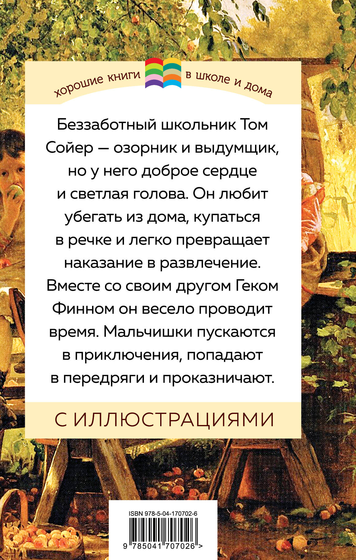 Беззаботный школьник Том Сойер - озорник и выдумщик, но у него доброе сердце и светлая голова. Он любит убегать из дома, купаться в речке и легко превращает наказание в развлечение. Вместе со своим другом Геком Финном он весело проводит время. Мальчишки пускаются в приключения, попадают в передряги и проказничают. История веселого, живого, озорного Тома Сойера - одна из самых лучезарных книг в мировой литературе. Роман Марка Твена «Приключения Тома Сойера» изучают на уроках литературы в 5-6 классах.| Издательство | Эксмо |