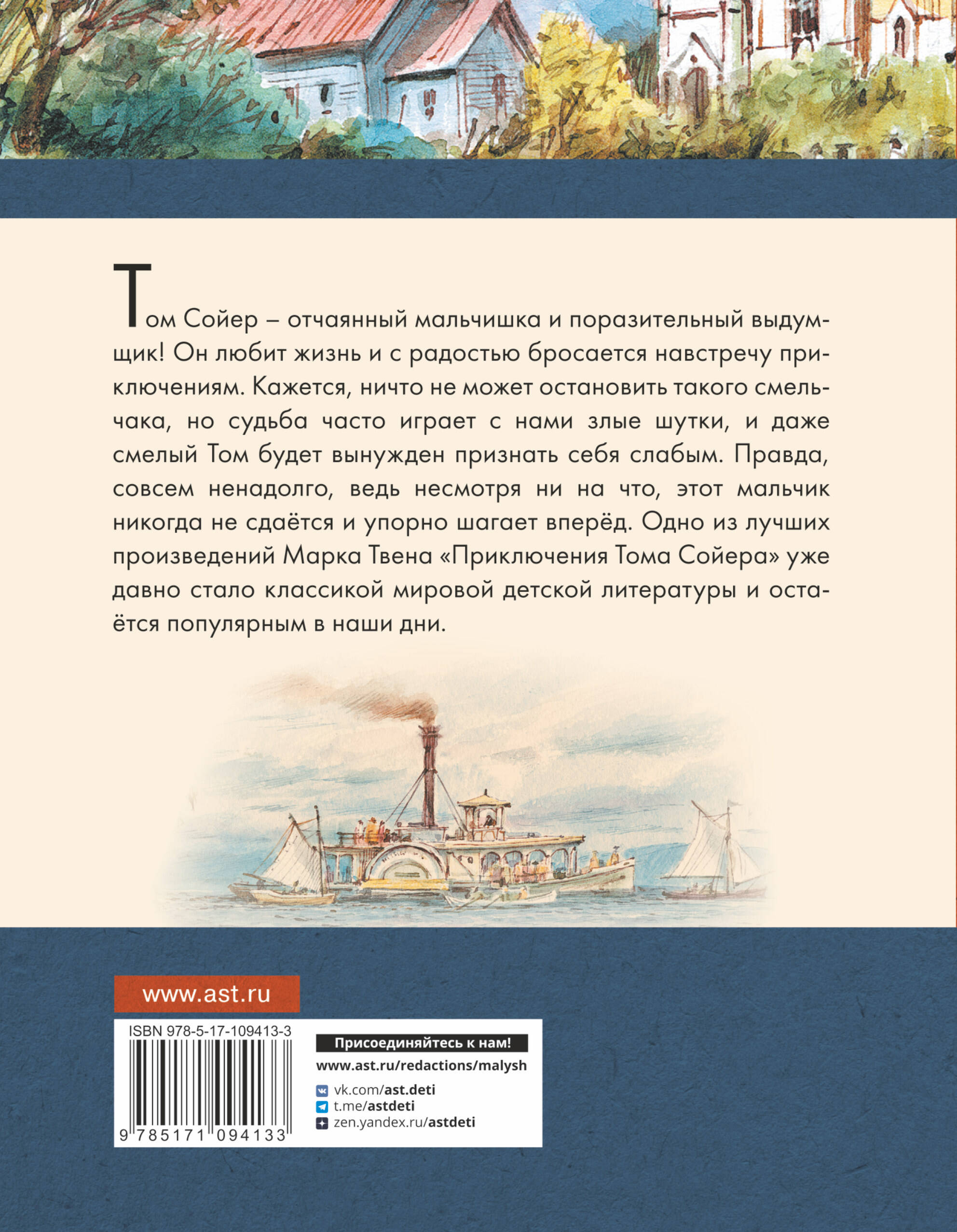 "Приключения Тома Сойера" - один из шедевров мировой детской литературы, созданный в 1875 году американским писателем Марком Твеном (настоящее имя - Сэмюэл Ленгхорн Клеменс). Вот уже полтора столетия приключения озорника и выдумщика Тома и его друга Гека Финна из провинциального американского городка под названием Санкт-Петербург на берегу Миссисипи завораживают и увлекают современных читателей. Интересный сюжет и оригинальные характеры героев поднимают эту повесть на небывалую высоту. В издании представлен классический перевод К. Чуковского. Иллюстрации В. Челака. Для среднего школьного возраста.