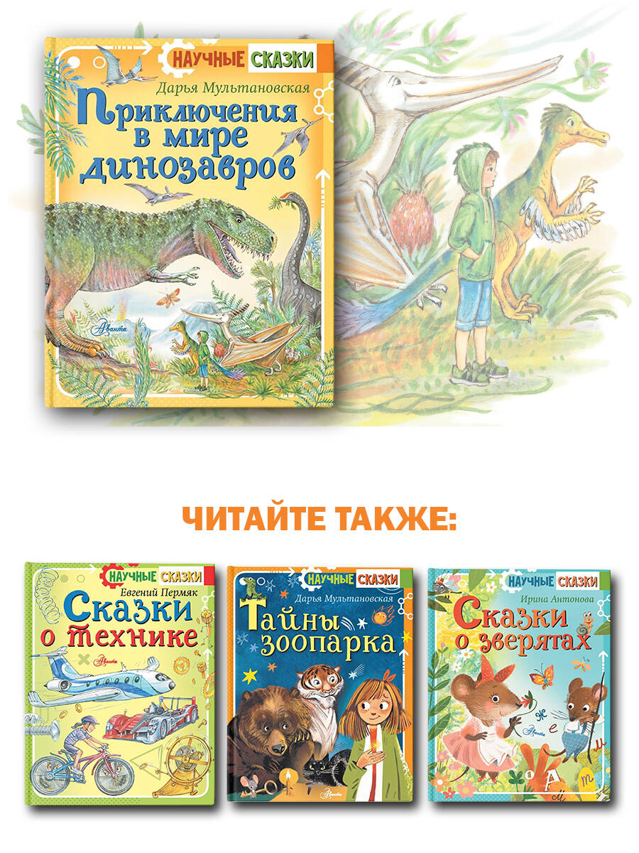 Сказочная повесть Дарьи Мультановской "Приключения в мире динозавров" рассказывает об удивительных существах, которые когда-то, миллионы лет назад, населяли нашу планету. Одни были гигантскими, выше современных деревьев, а другие - крошечными (по доисторическим меркам, конечно). Одни ели растения, а другие в этот момент на них охотились. И было их разных - множество видов. "Где они сейчас, - задается вопросом главный герой мальчик Федор. - Можно ли повстречать хоть одного из них?" Оказывается, можно: если вовремя зайти в музей палеонтологии, а потом случайно совершить полет на машине времени - в гости к гадрозаврам и птеранодонам, анкилозаврам и диплодокам, бронтозаврам и, конечно, грозному Ти-Рексу. Для младшего школьного возраста.| Издательство | ИЗДАТЕЛЬСТВО "АСТ" |