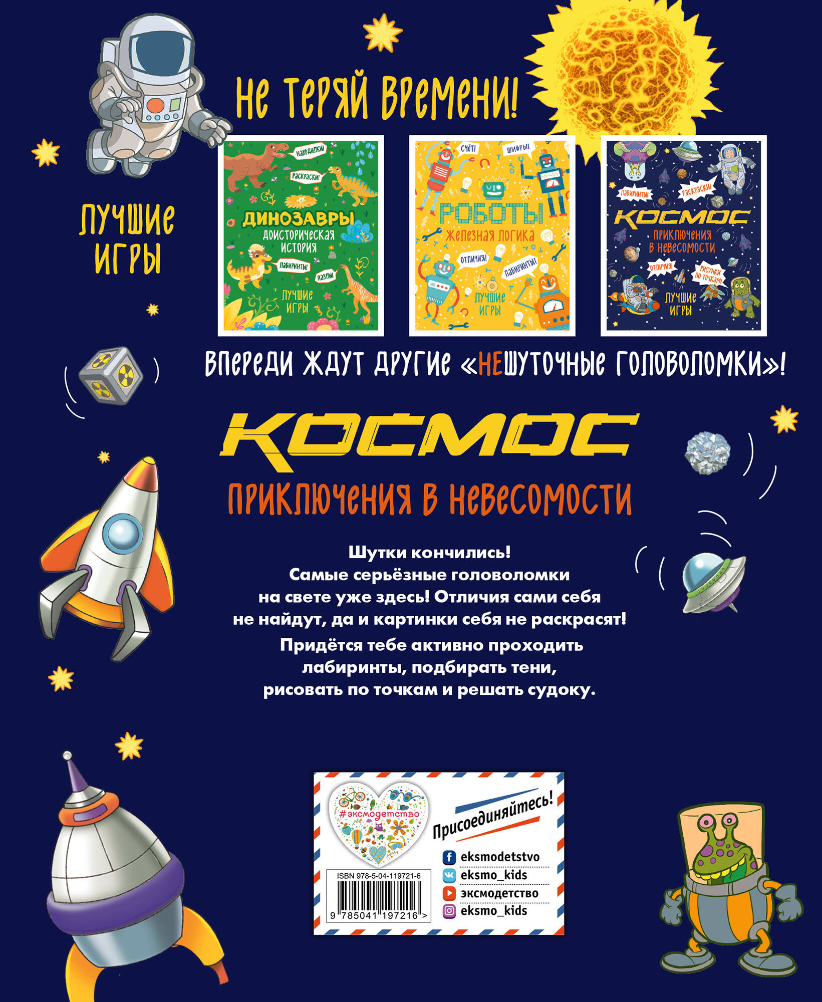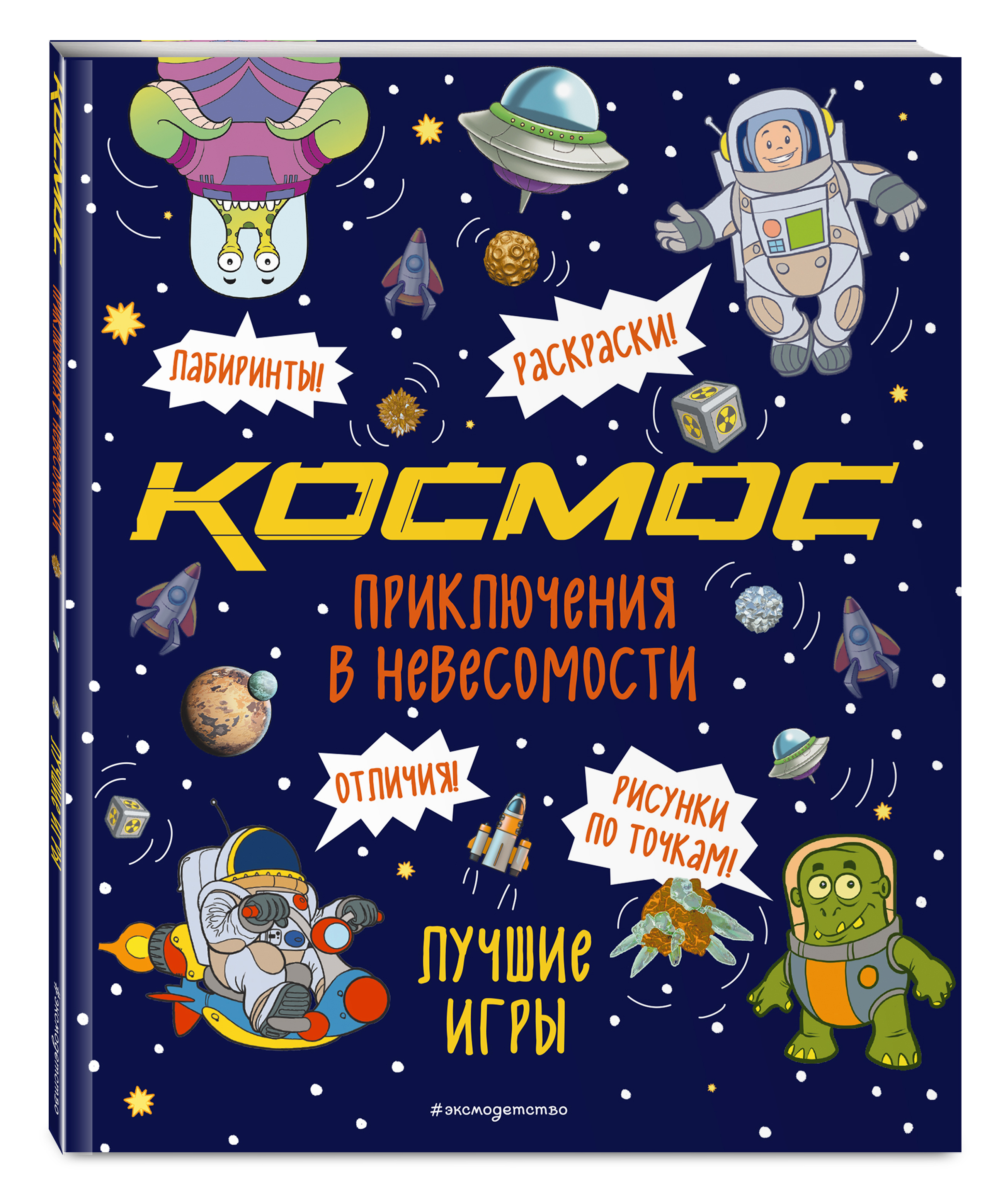 Отправься бороздить неизведанные просторы космоса на борту нашей книги игр и головоломок! Твоё космическое приключение обещает быть очень увлекательным! Впереди ждёт встреча с неизведанным - инопланетяне, новые планеты, звёзды, а также со всеми любимым - корабли, ракеты, шаттлы... Космос бросает тебе вызов - проходи лабиринты, ищи подходящие тени, соединяй точки, разгадывай судоку, раскрашивай и ищи отличия. Пройди почти 100 невероятных испытаний в невесомости, чтобы по праву получить звание бесстрашного, смышлёного космогероя! Прояви смекалку, внимательность и сообразительность, и ты смело можешь называть себя настоящим космическим волком. За дело, юный капитан! Космос любит смельчаков!| Издательство | ООО "Издательство "Эксмо" |