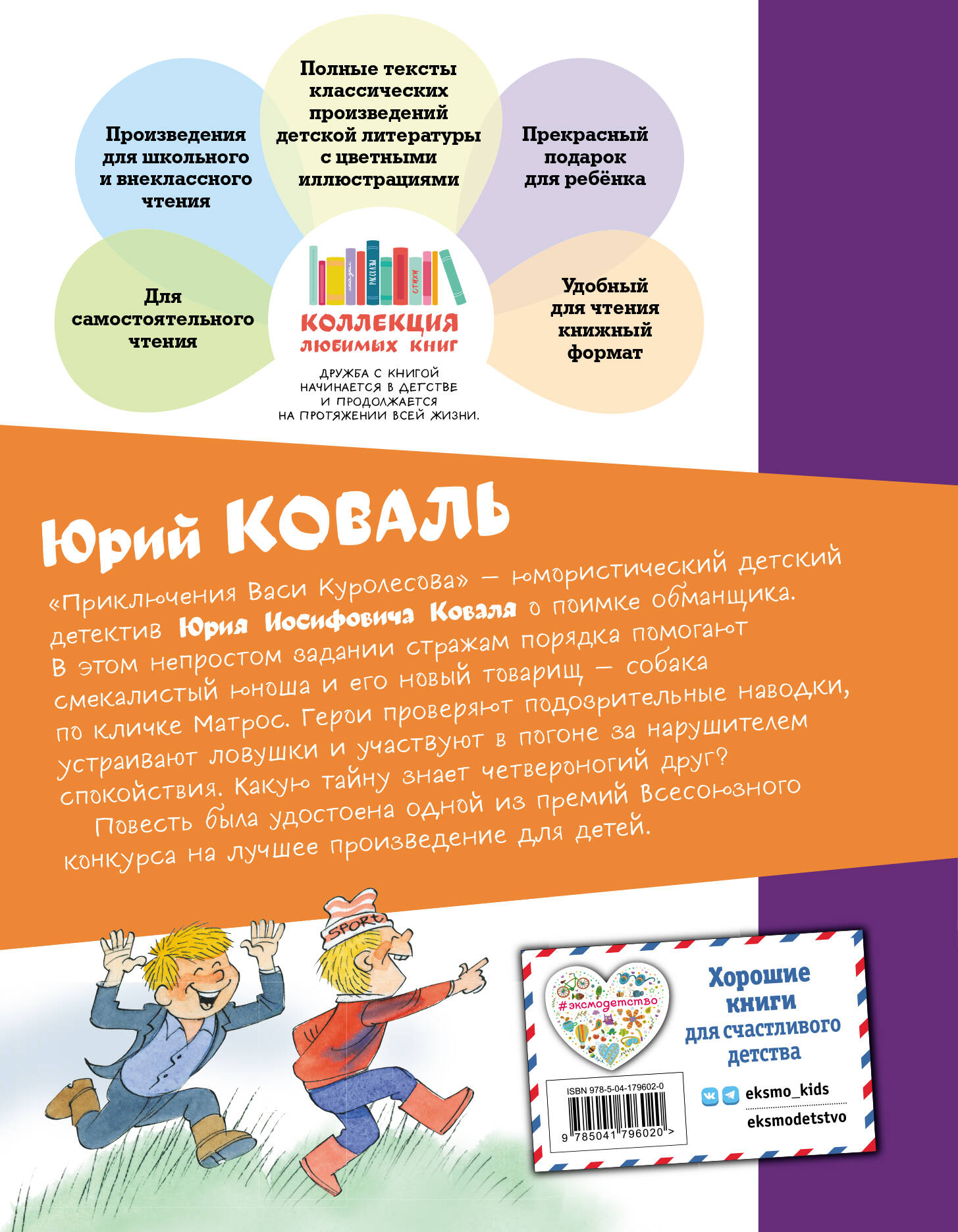 Если и завлекать ребёнка чтением, то с помощью весёлой приключенческой истории для детей. Однажды обычный парень Вася Куролесов оказался втянут в милицейское расследование. Ему и капитану Болдыреву было необходимо найти некого черноусого, ведь он под видом поросят продаёт честным гражданам вроде Васи мохнатых дворовых собак. Отступить от дела Василий не мог из-за обостренного чувства справедливости и… обоняния. Ведь Вася учуял самую настоящую улику, которая точно поможет напасть на след преступника! История про Васю Куролесова не была бы полной без замечательных иллюстраций народного художника Российской Федерации Виктора Чижикова. В 1981 году на основе повести о «Приключениях Васи Куролесова» был снят мультфильм, который также полюбился многим зрителям за оригинальный сюжет и ярких персонажей. «КОЛЛЕКЦИЯ ЛЮБИМЫХ КНИГ» - это: - детская классика с цветными иллюстрациями известных художников; - произведения для школьного и внеклассного чтения; - отличный выбор для самостоятельного чтения; - прекрасный подарок для ребёнка; - единое серийное оформление, дающее возможность собрать свою книжную коллекцию.| Издательство | ООО "Издательство "Эксмо" |