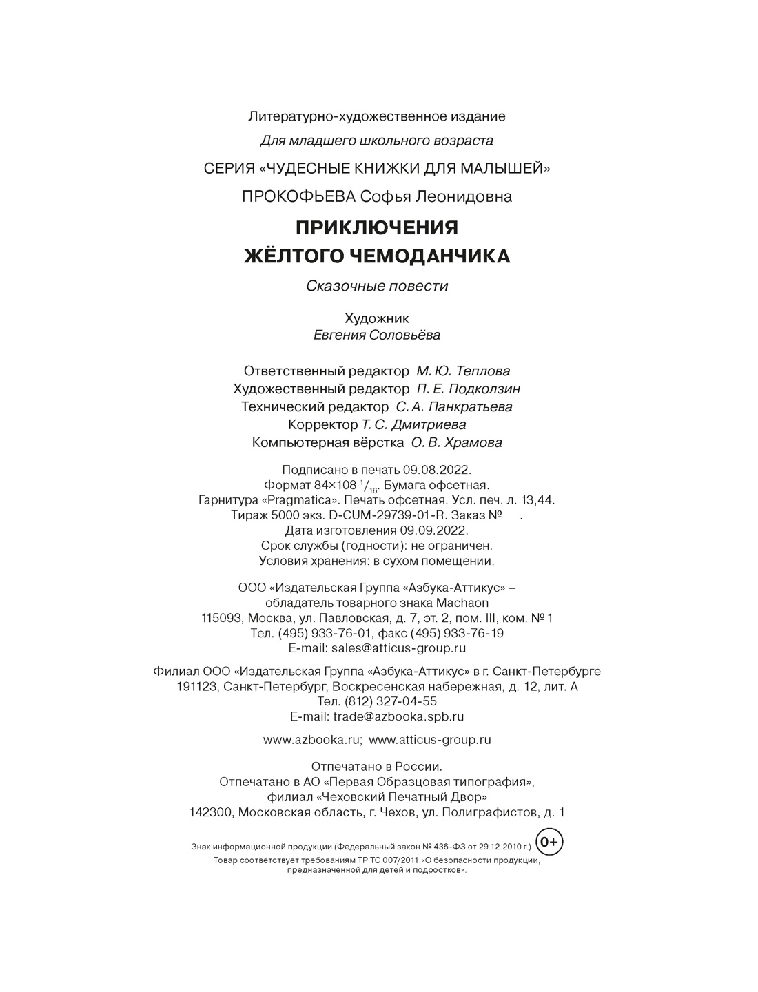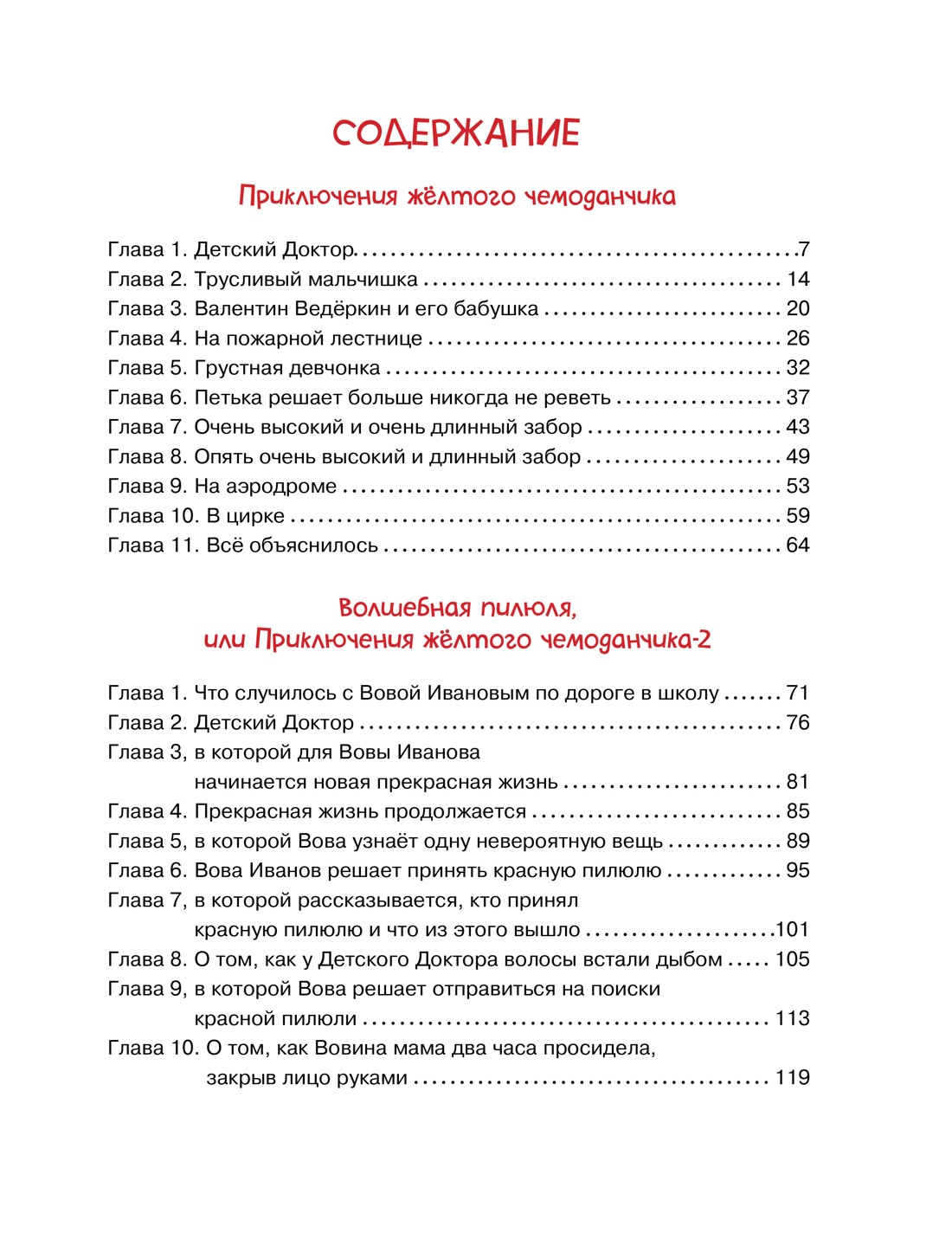 В книгу вошли две сказочные повести замечательной писательницы Софьи Прокофьевой: «Приключения жёлтого чемоданчика» и «Приключения жёлтого чемоданчика-2, или Волшебная пилюля». Они о том, как можно излечить от страха и печали, злости и коварства, глупости и вранья с помощью чудесных конфет, которые хранятся в жёлтом чемоданчике. В творческом багаже писательницы более тридцати книг, они постоянно переиздаются и получили читательское признание не только в нашей стране, но и за рубежом - они переведены более чем на двадцать языков мира.| Издательство | Махаон |