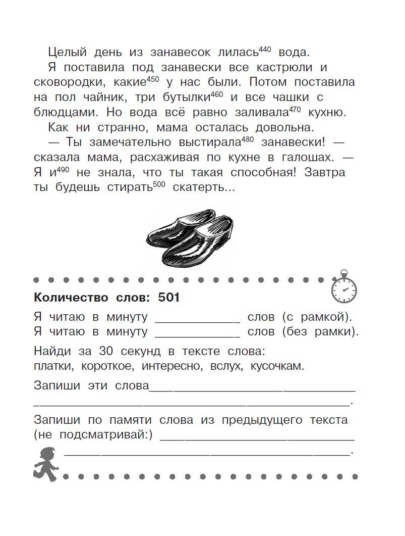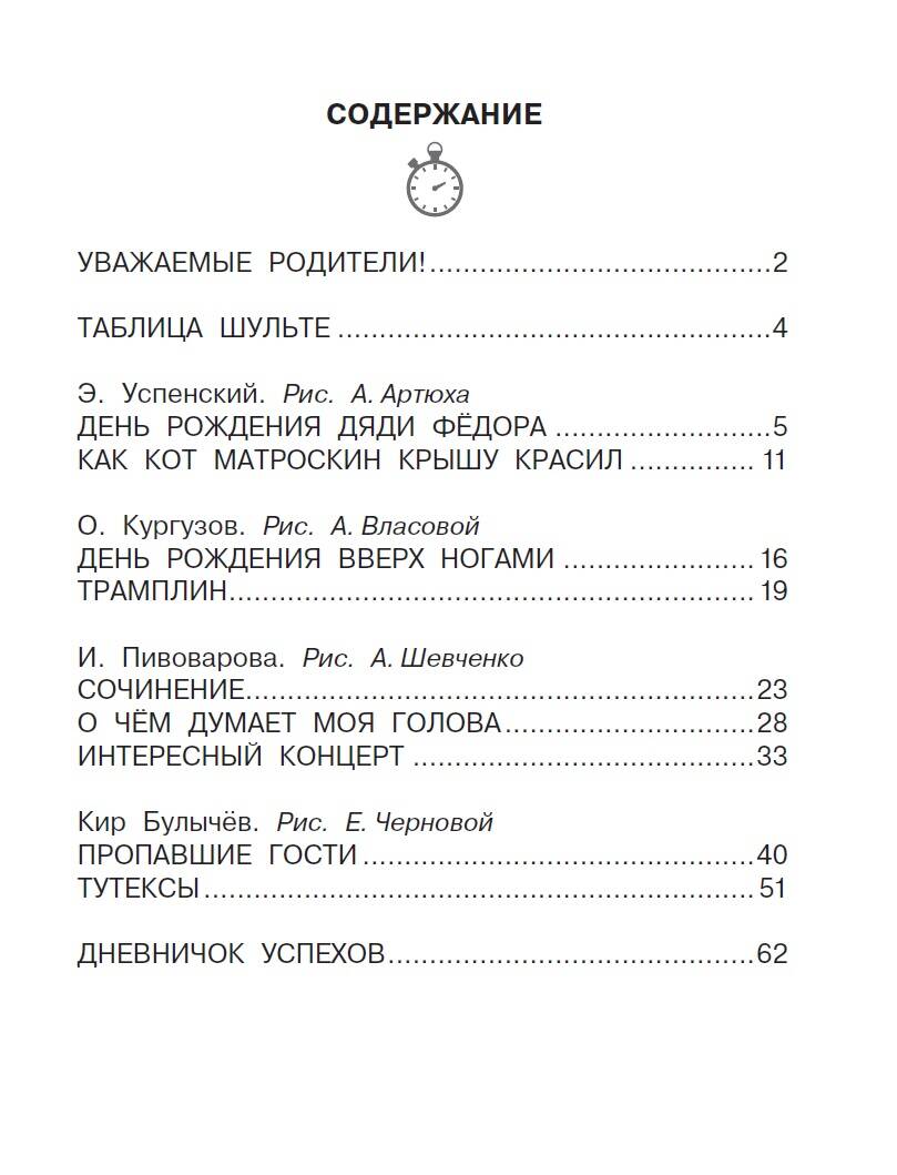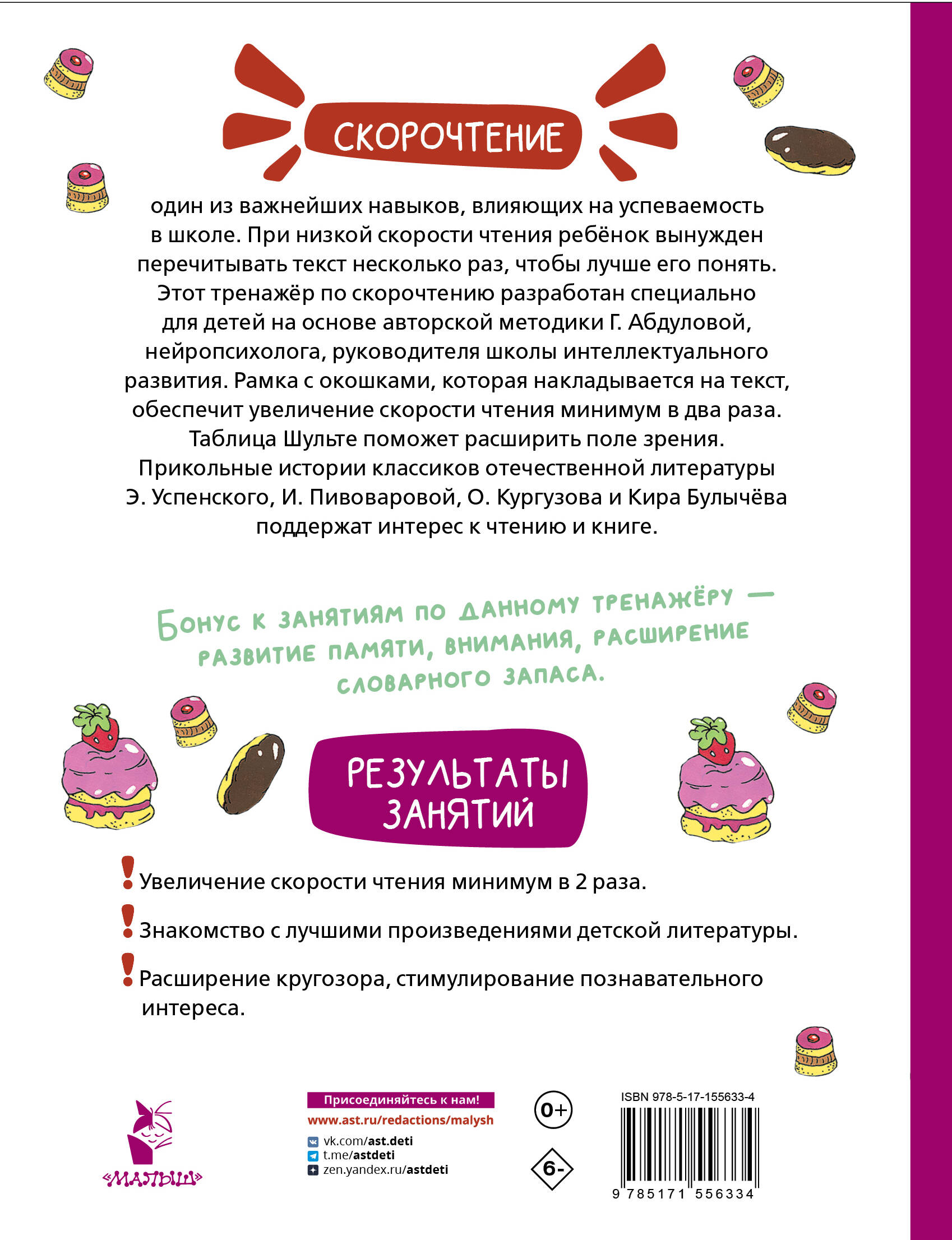 Учителя бьют тревогу! С каждым годом становится все больше детей, которые с трудом читают, плохо понимают прочитанное, не могут пересказать текст. По самым общим подсчетам, таких детей около 30 процентов. Они зачастую сталкиваются с хронической неуспеваемостью. Поэтому очень важно регулярно совершенствовать технику чтения, осваивать скорочтение. Уникальный тренажер с рамкой поможет увеличить скорость чтения и улучшить понимание прочитанного минимум в два раза. Специальные задания на развитие внимания и памяти способствуют укреплению базовых навыков, необходимых для успешного обучения. В книгу включены увлекательные истории любимых авторов Э. Успенского, И. Пивоваровой, О. Кургузова и Кира Булычёва, которые обязательно понравятся юным читателям. Это лучший подарок для будущих отличников!| Издательство | ИЗДАТЕЛЬСТВО "АСТ" |