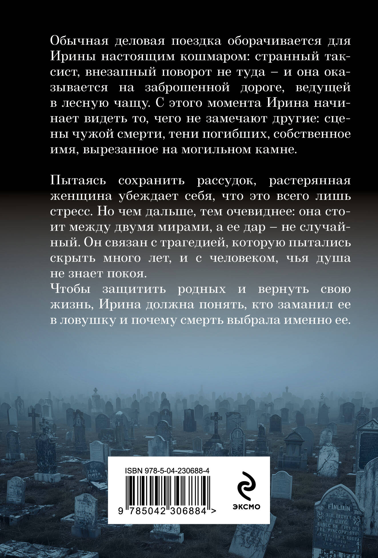 Новая история Елены Гординой, полная мистических тайн и смертельных опасностей. Обычная деловая поездка оборачивается для Ирины настоящим кошмаром: странный таксист, внезапный поворот не туда - и она оказывается на заброшенной дороге, ведущей в лесную чащу. С этого момента Ирина начинает видеть то, чего не замечают другие: сцены чужой смерти, тени погибших, собственное имя, вырезанное на могильном камне. Пытаясь сохранить рассудок, растерянная женщина убеждает себя, что это всего лишь стресс. Но чем дальше, тем очевиднее: она стоит между двумя мирами, а ее дар - не случайный. Он связан с трагедией, которую пытались скрыть много лет, и с человеком, чья душа не знает покоя. Чтобы защитить родных и вернуть свою жизнь, Ирина должна понять, кто заманил ее в ловушку и почему смерть выбрала именно ее.| Издательство | ООО "Издательство "Эксмо" |