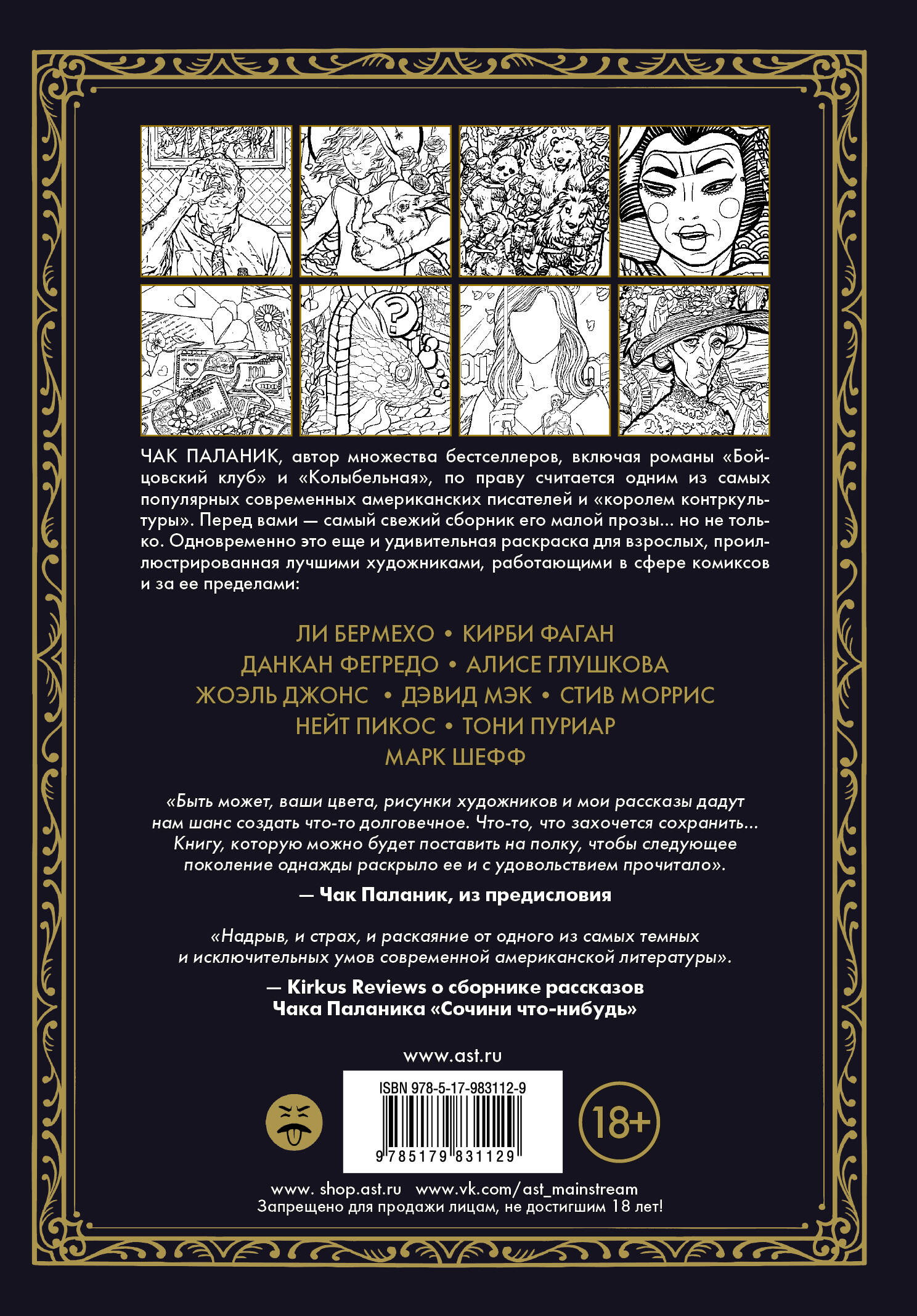Чак Паланик, автор множества бестселлеров, включая романы "Бойцовский клуб" и "Колыбельная", по праву считается одним из самых популярных современных американских писателей и "королем контркультуры". Перед вами - самый свежий сборник его малой прозы… но не только. Одновременно, это еще и удивительная раскраска для взрослых, проиллюстрированная лучшими художниками, работающими в сфере комиксов и за ее пределами.| Издательство | ИЗДАТЕЛЬСТВО "АСТ" |